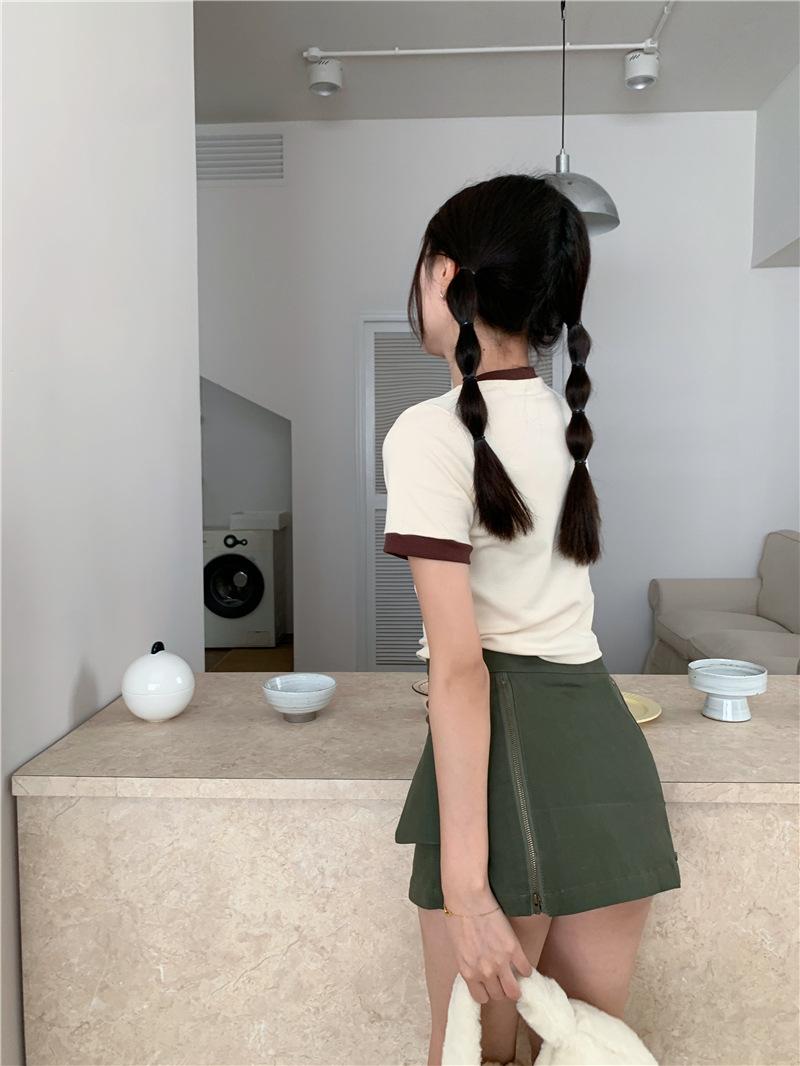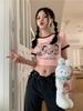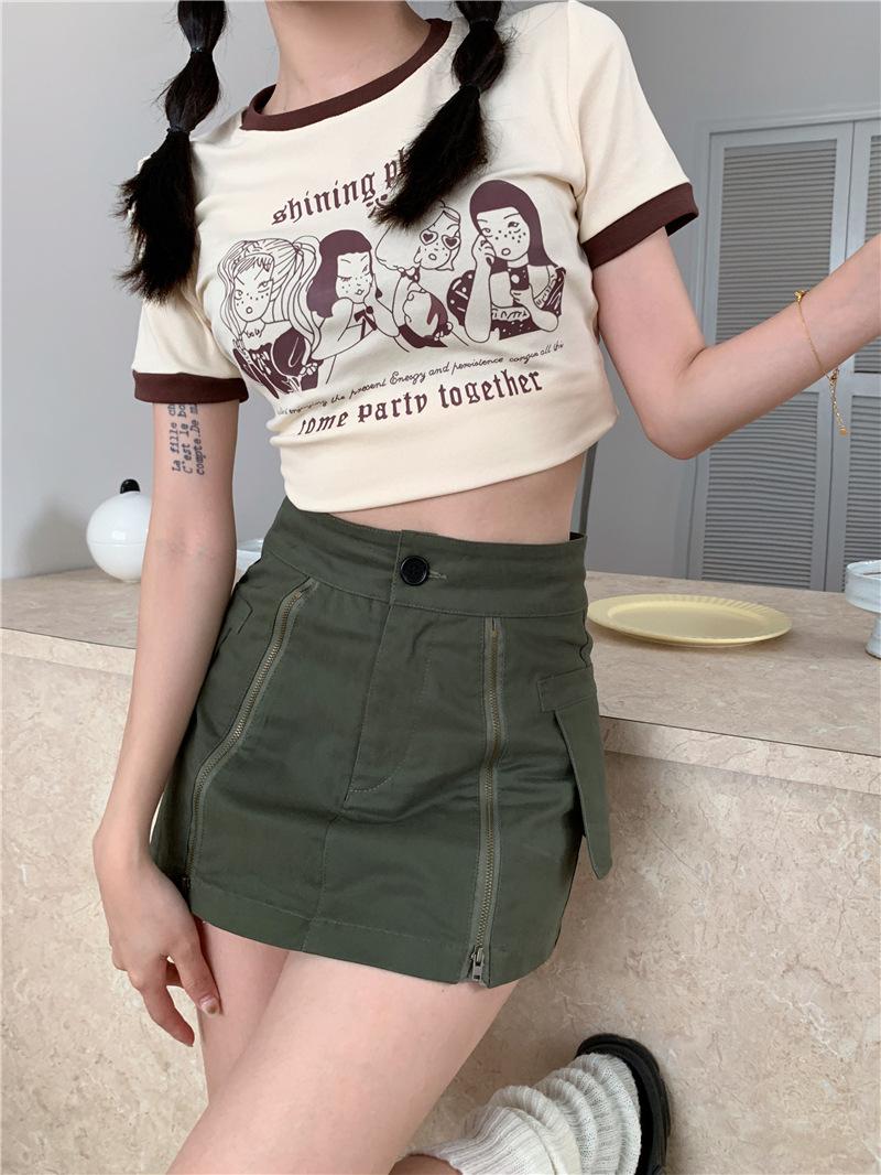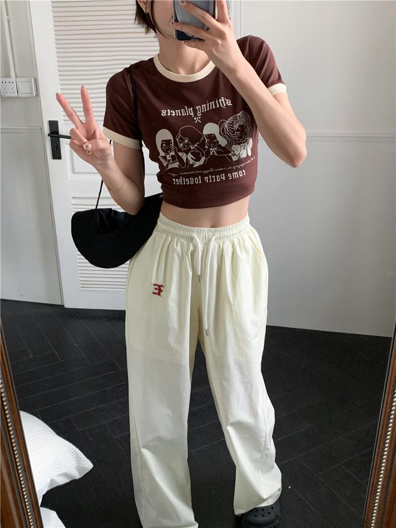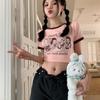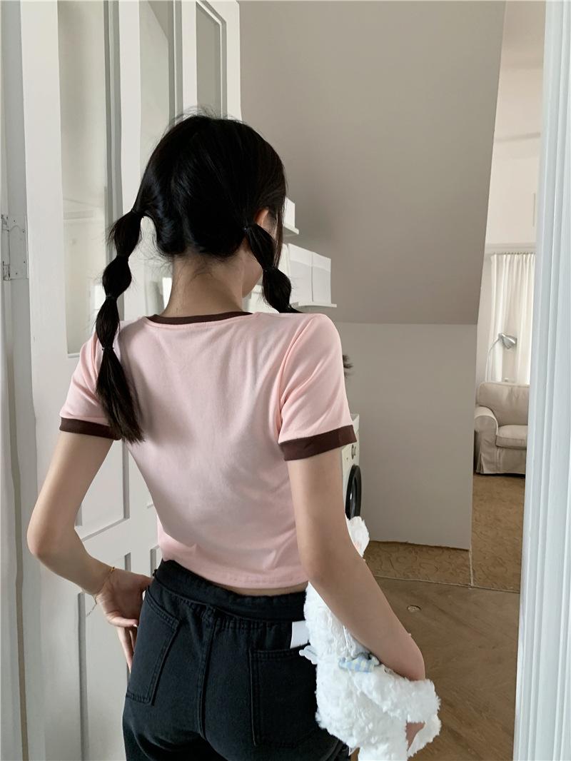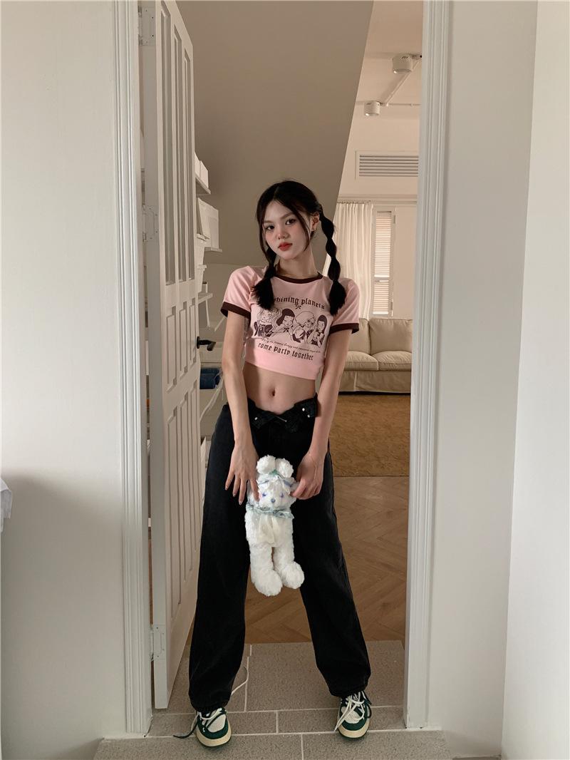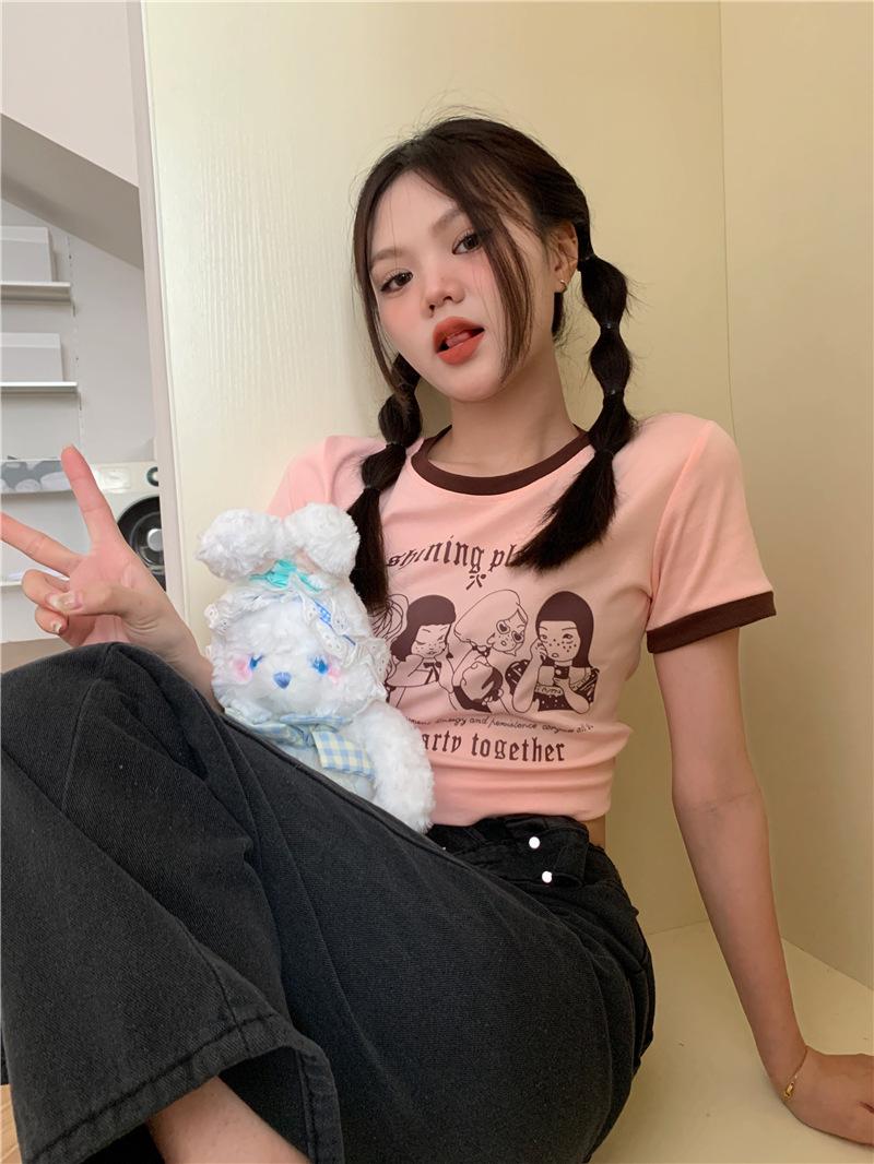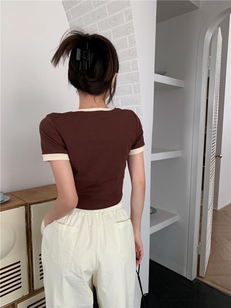Camiseta con hombros rectos y estampado retro americano para mujer con colores contrastantes, cuello redondo, cintura alta, ombligo expuesto, chica sexy, top ajustado de manga corta para verano