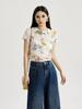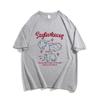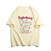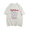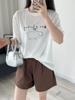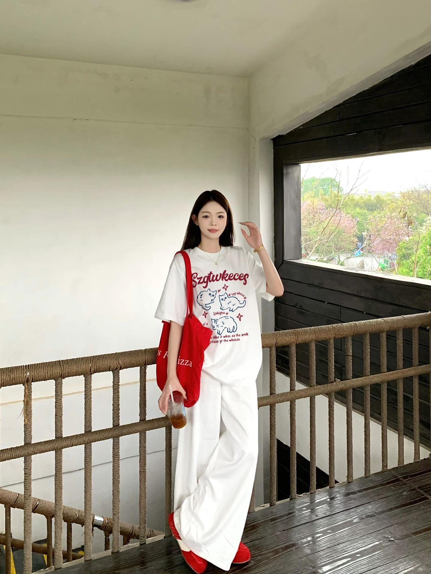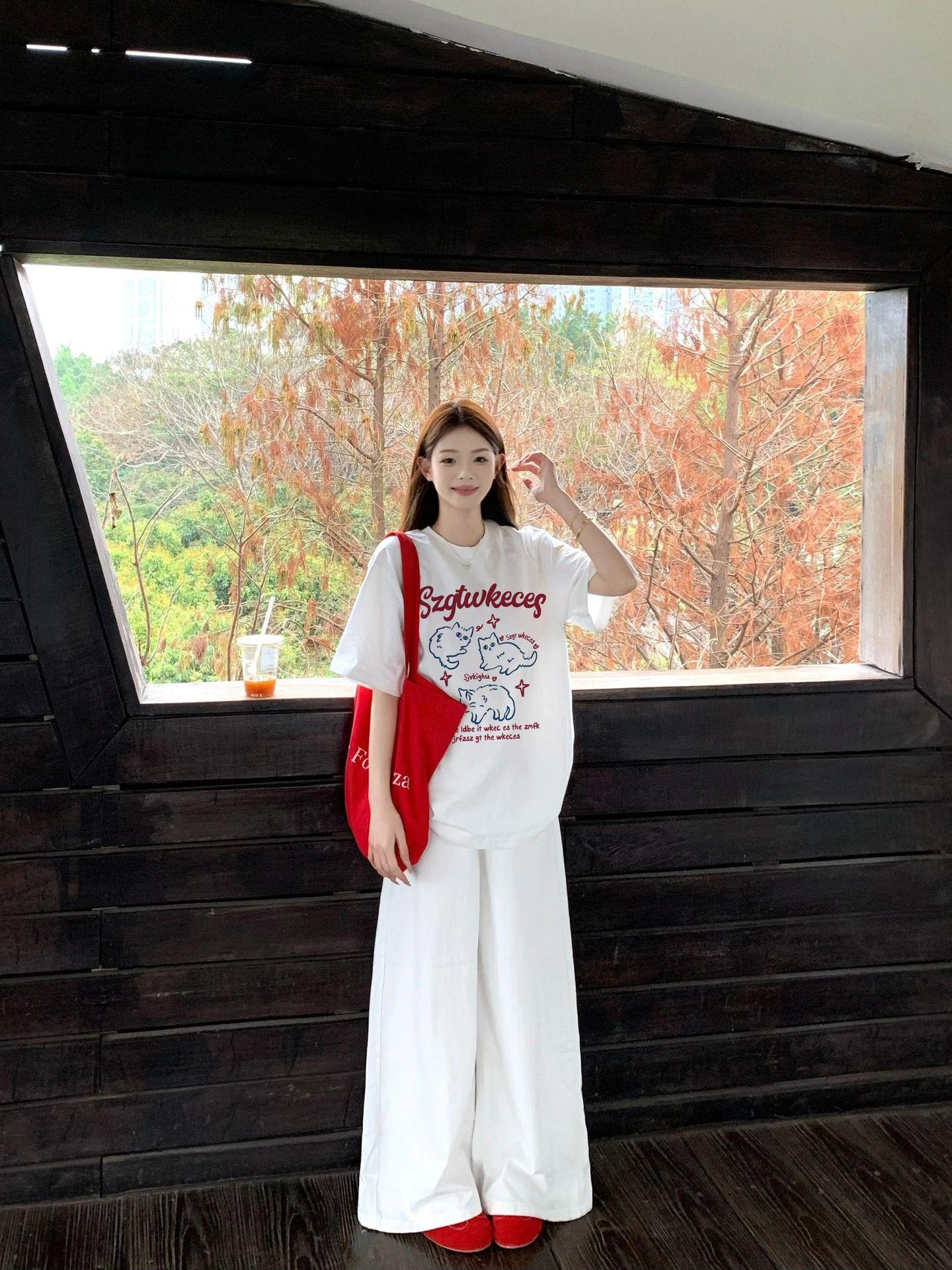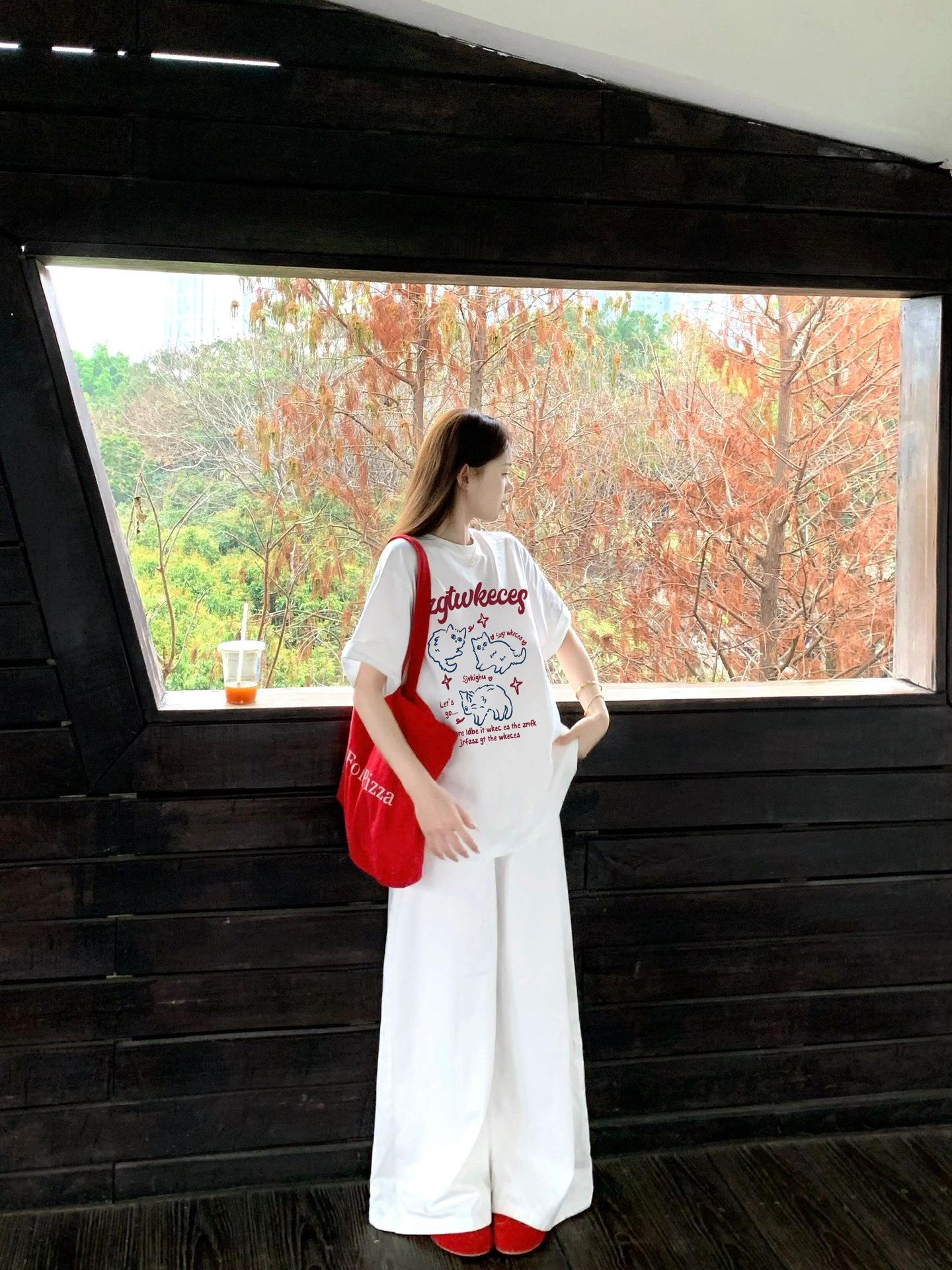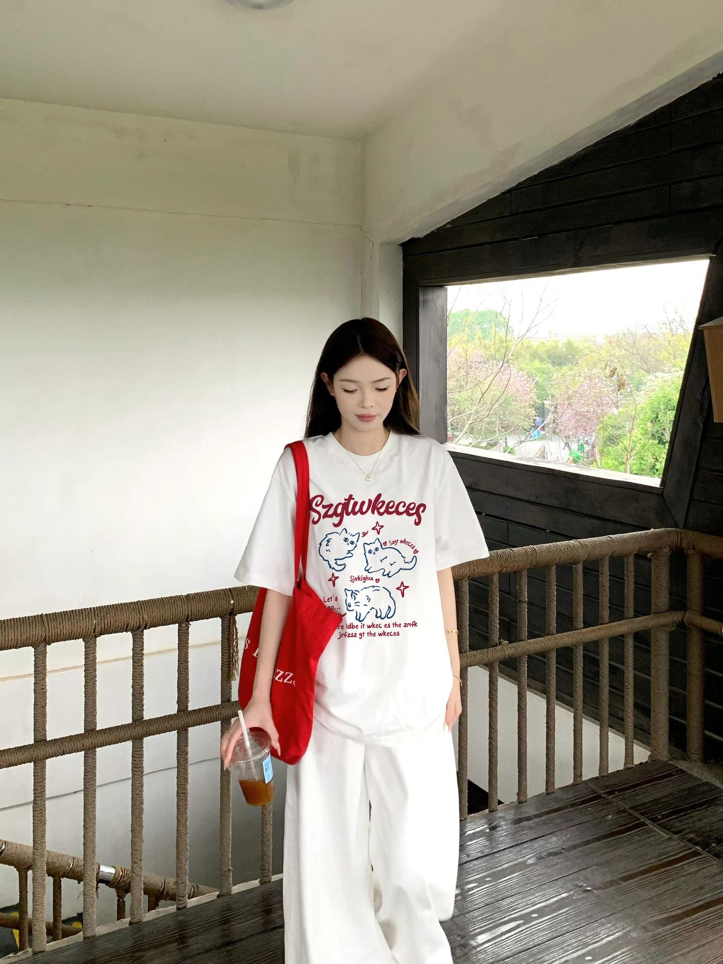 2025 Nuevo Blanco Más Fácil para Combinar Manga Media Top Ajustado Camiseta de Verano para Mujer Estampado de Gato Americano Cuello Redondo Manga Corta