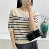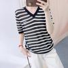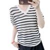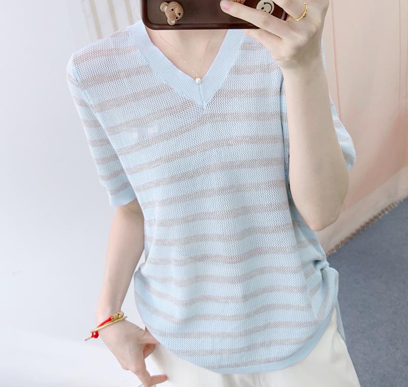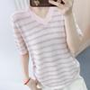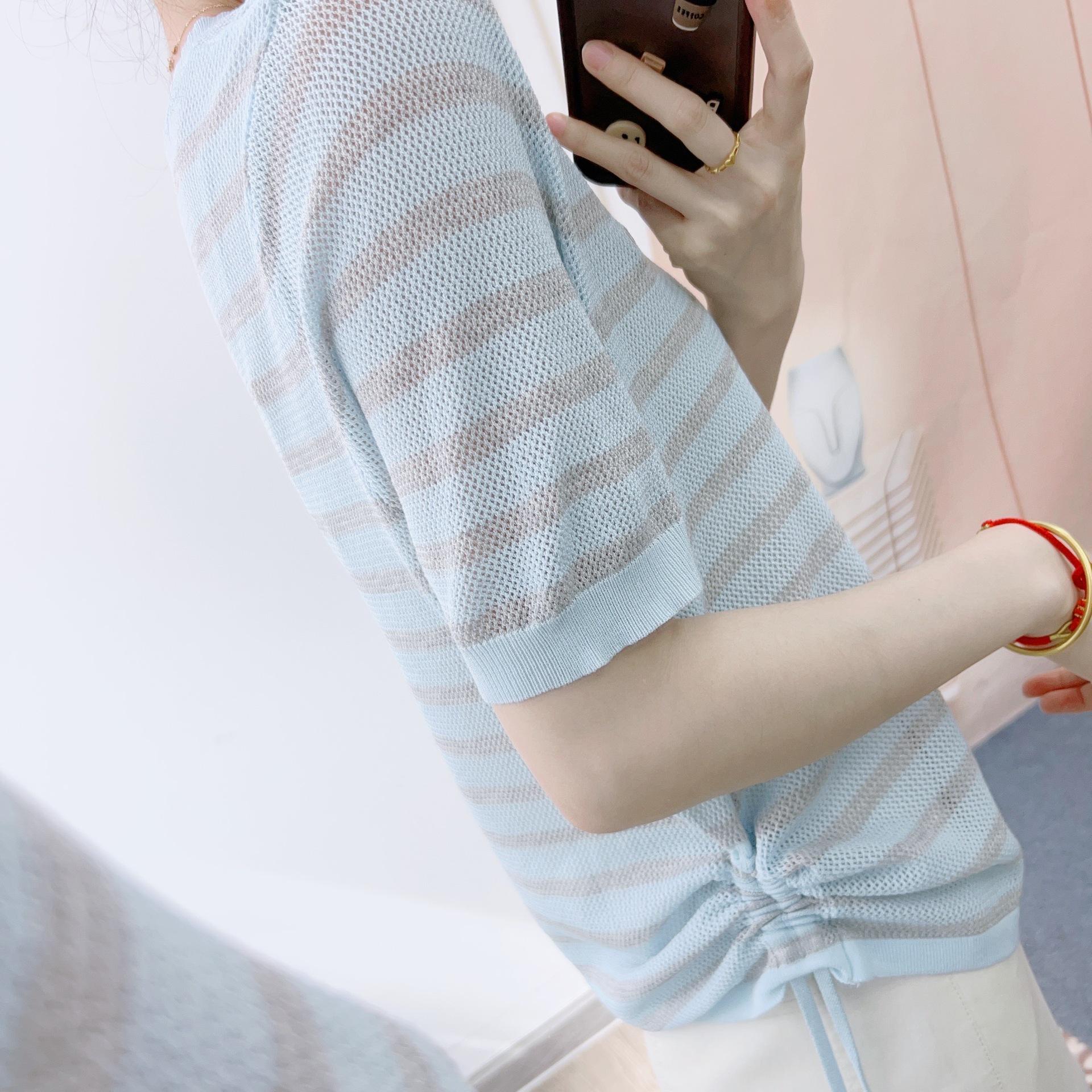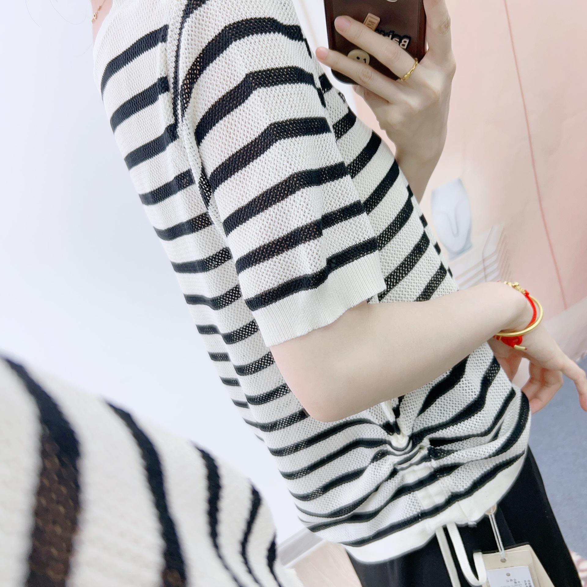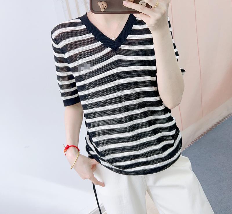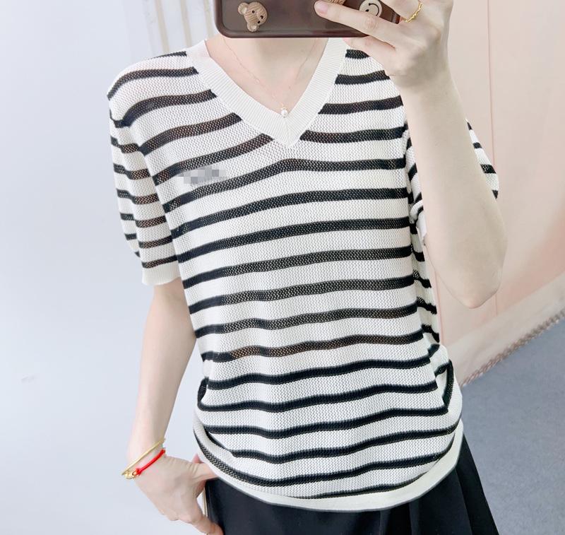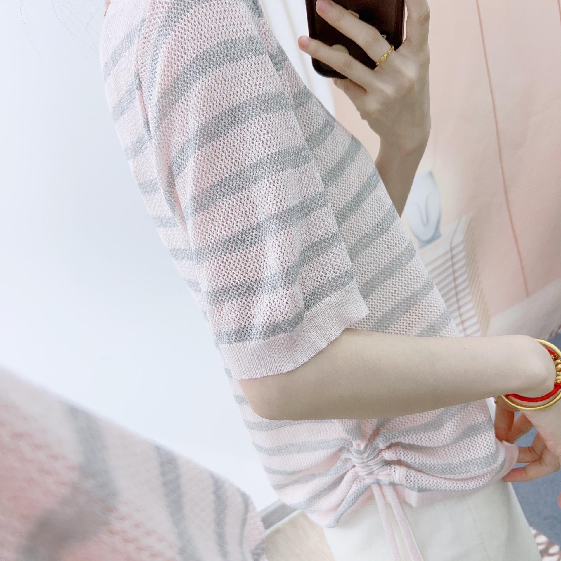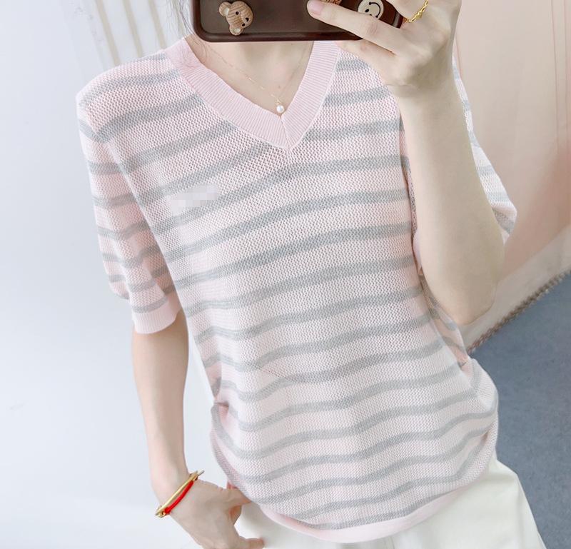 Verano 2025 Nuevo Punto de Seda de Hielo Cordón Ajustable en Ambos Lados Cintura Cuello en V Camisa de Manga Corta a Rayas 808