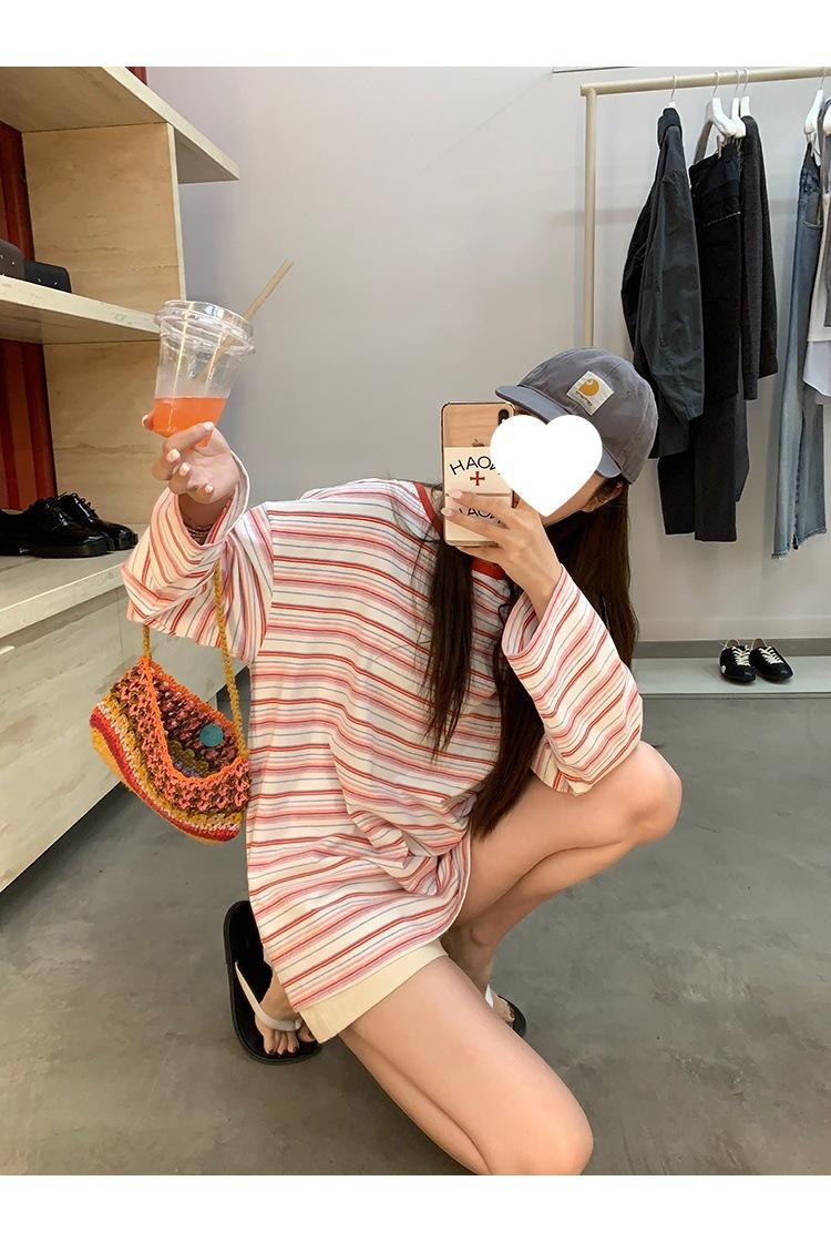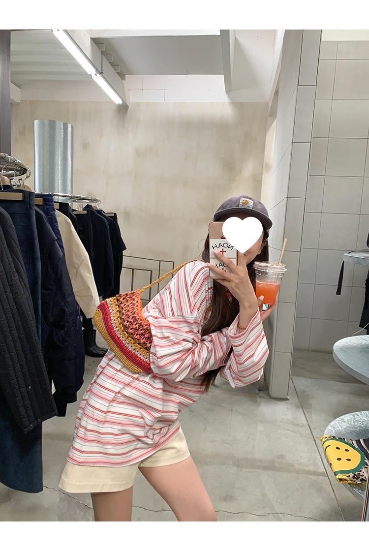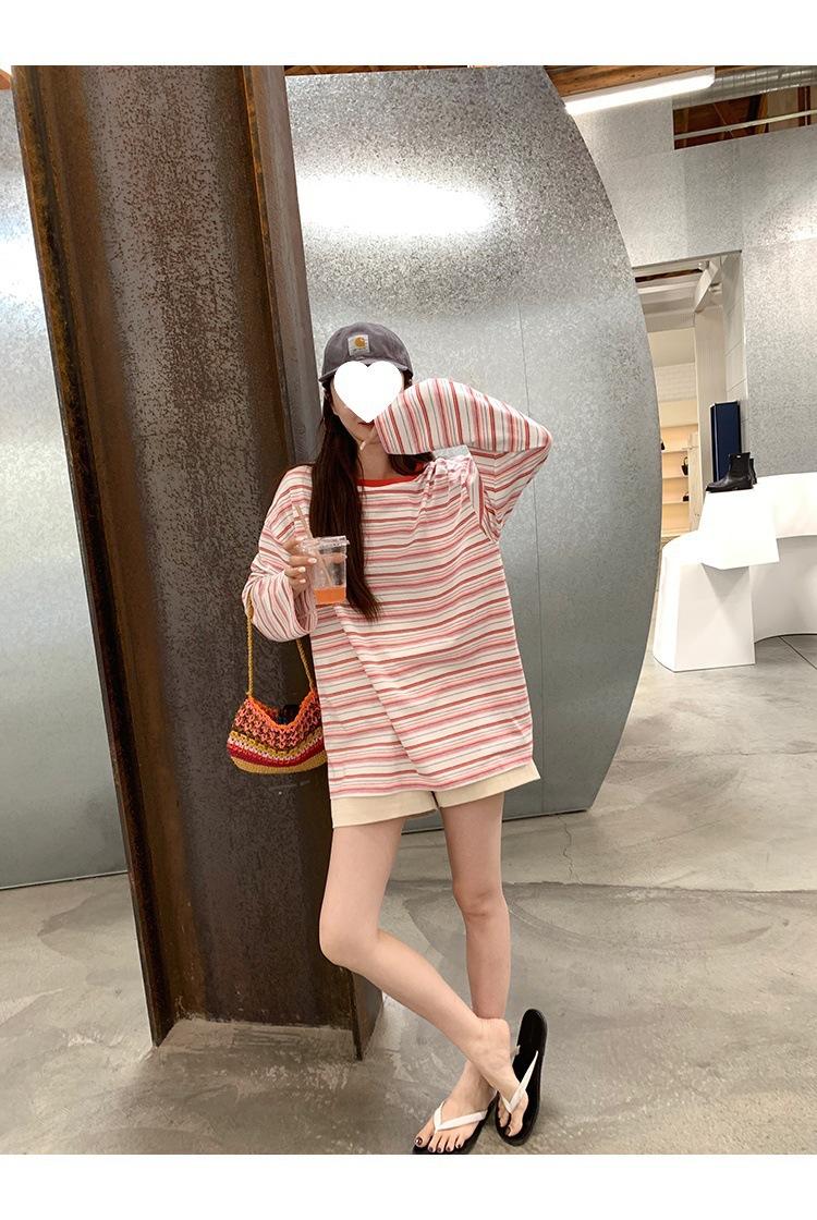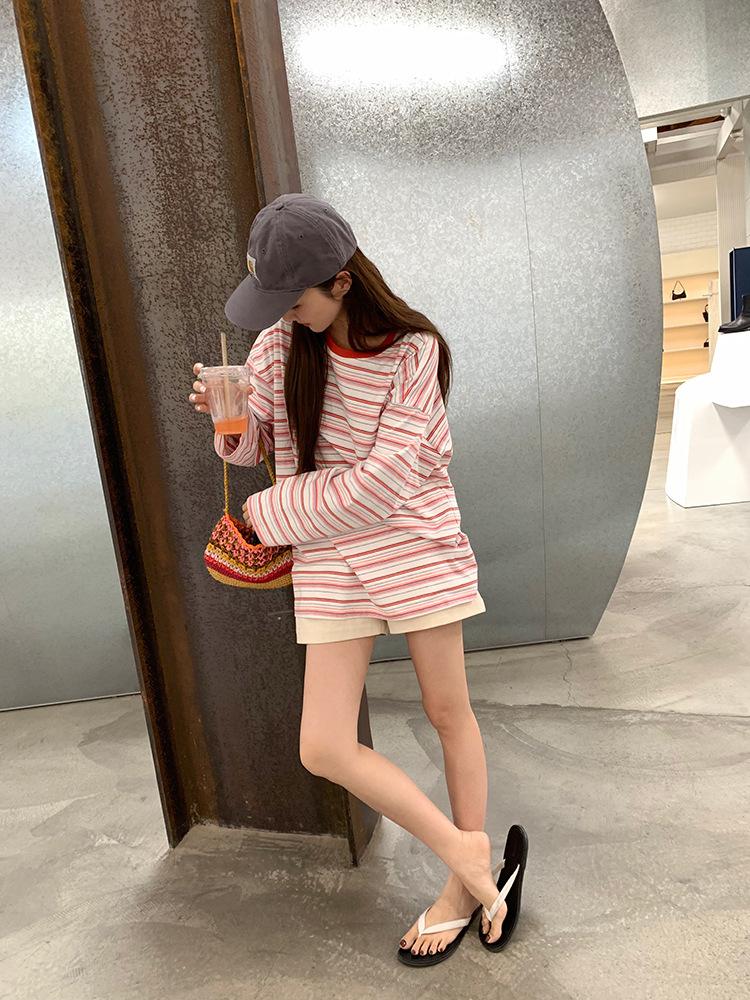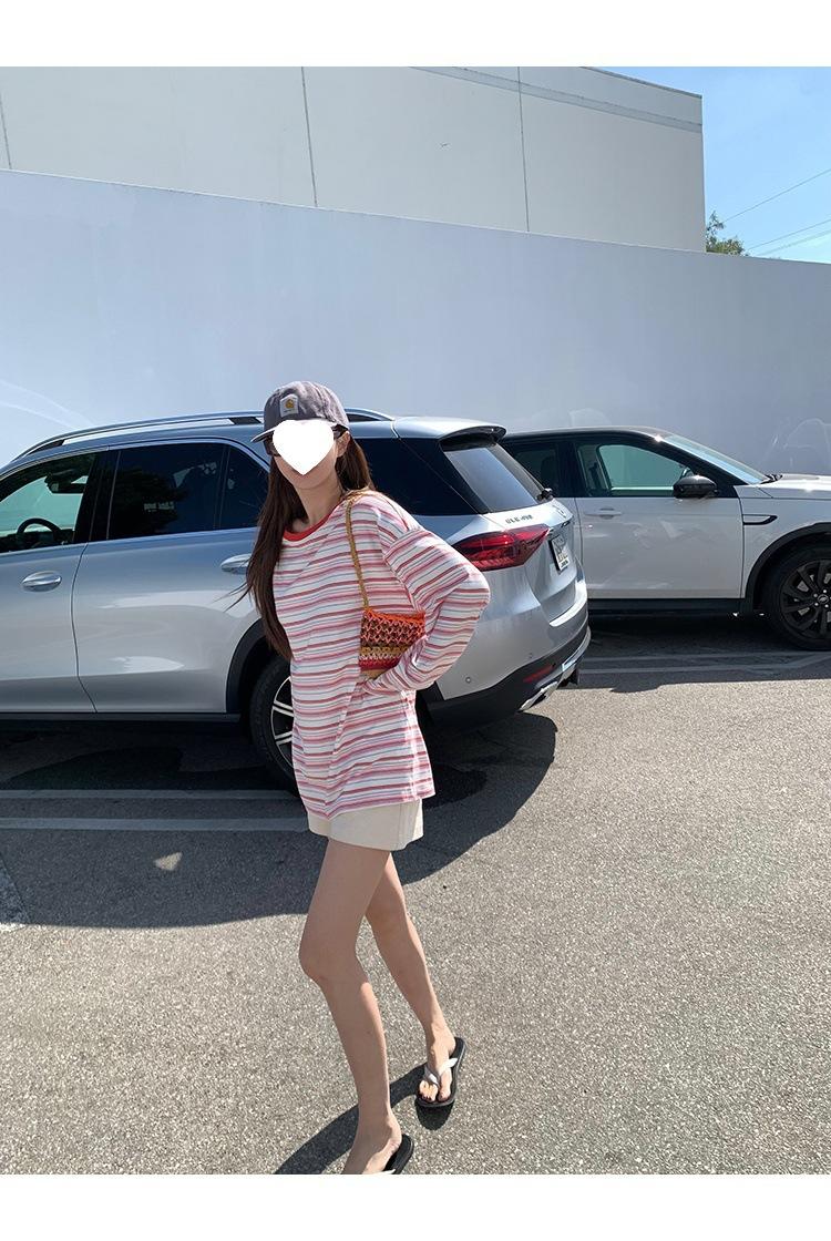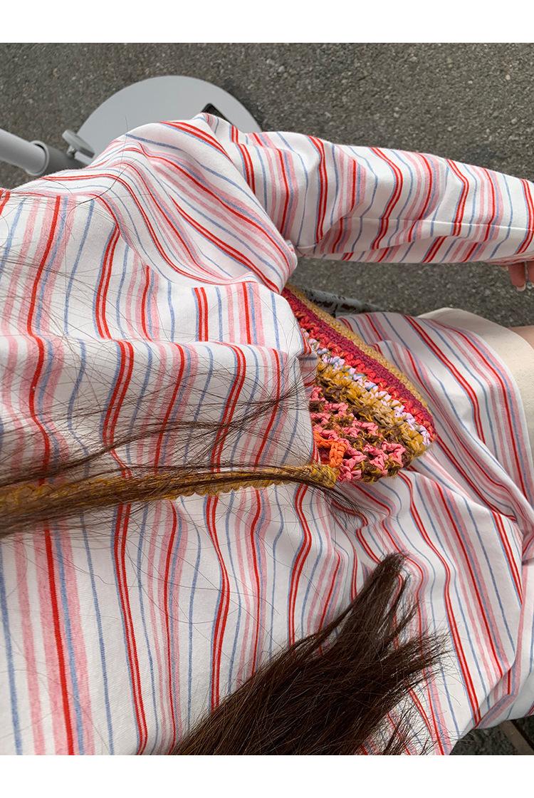 Las rayas son principalmente en tonos rojo-rosa, creando un efecto de rayas coloridas.