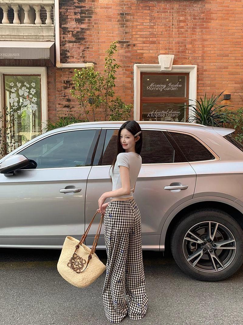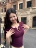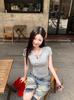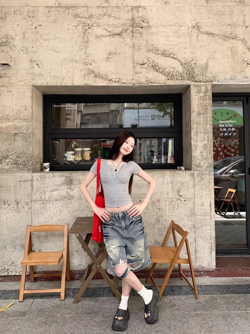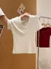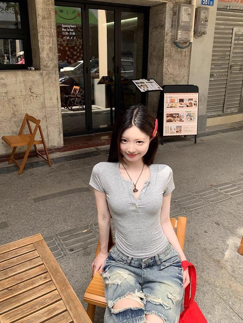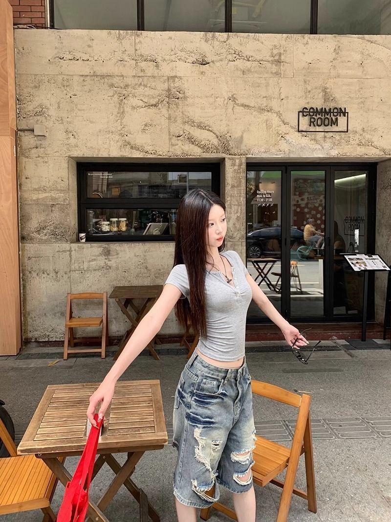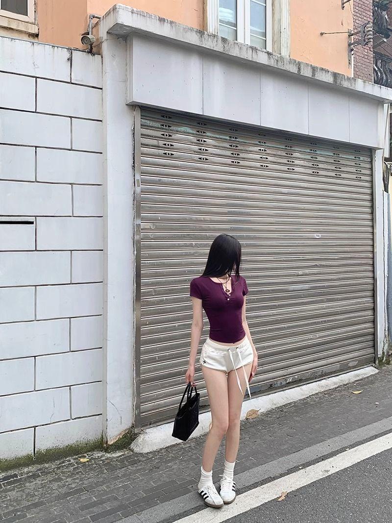 Playera de Hombro con Cuello en V para Mujer Manga Corta Verano Ajustada Sentido del Diseño Puro Cuello Medio Abierto con Botones Ajustada Corta Básica