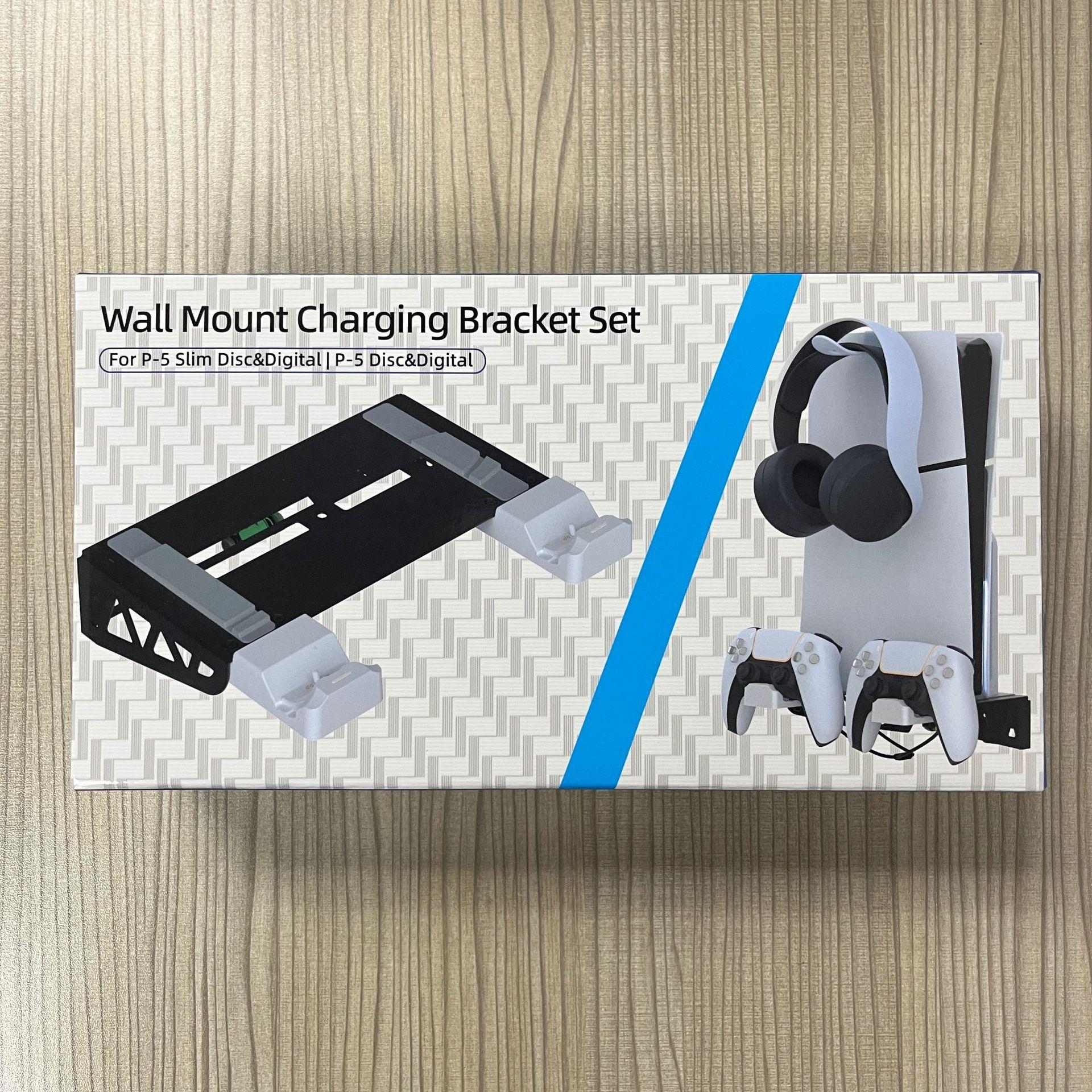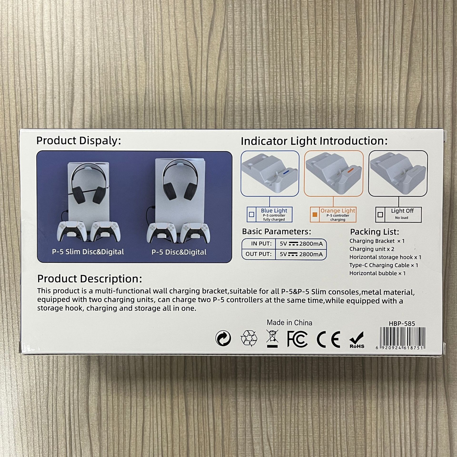 Este producto es un soporte de carga de pared multifunción, adecuado para la consola PS5 versión con unidad óptica/versión digital y PS5 slimVersión con unidad óptica/versión digitalLa consola está equipada con 2 bases de carga que pueden cargar 2 controles de PS5 al mismo tiempo, y un gancho de almacenamiento para auriculares