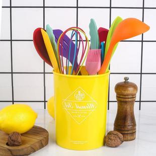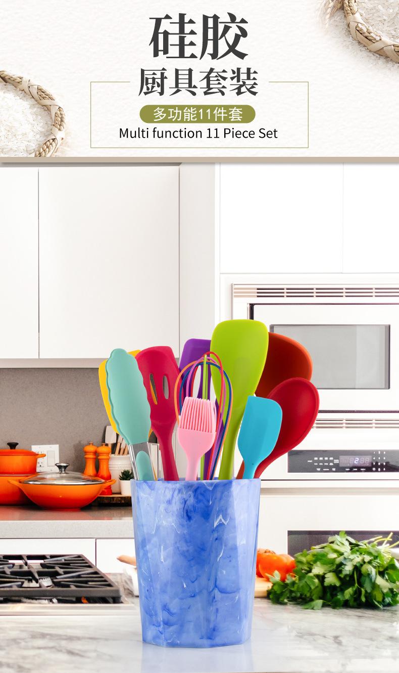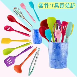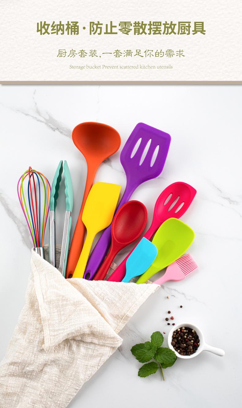 Juego de 11 piezas de pala y cuchara de cocina antiadherente de silicona FDA de nuevo color creativo con juego de cubo de almacenamiento