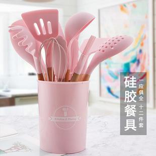 Juego de utensilios de cocina de silicona con mango de madera transfronterizo de 12 piezas, sartén antiadherente, se puede utilizar para cocinar a alta temperatura, pala, cuchara, juego de utensilios de cocina para hornear