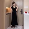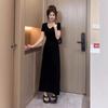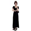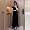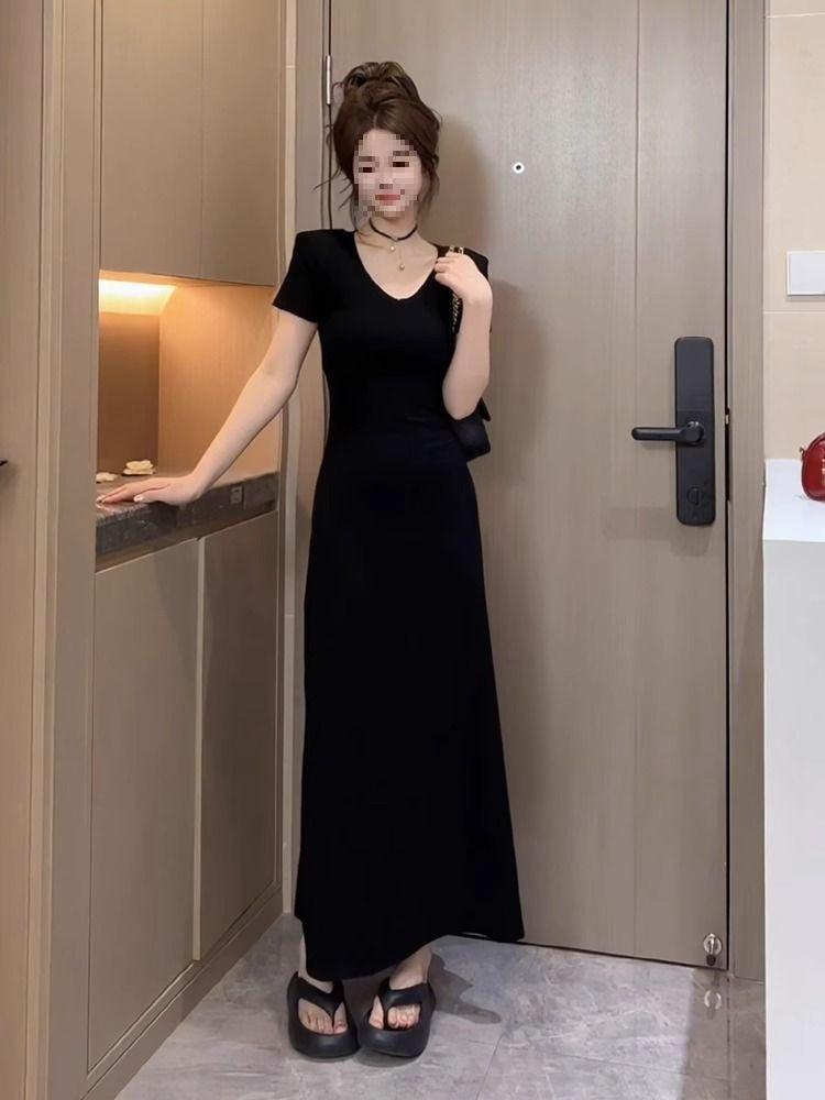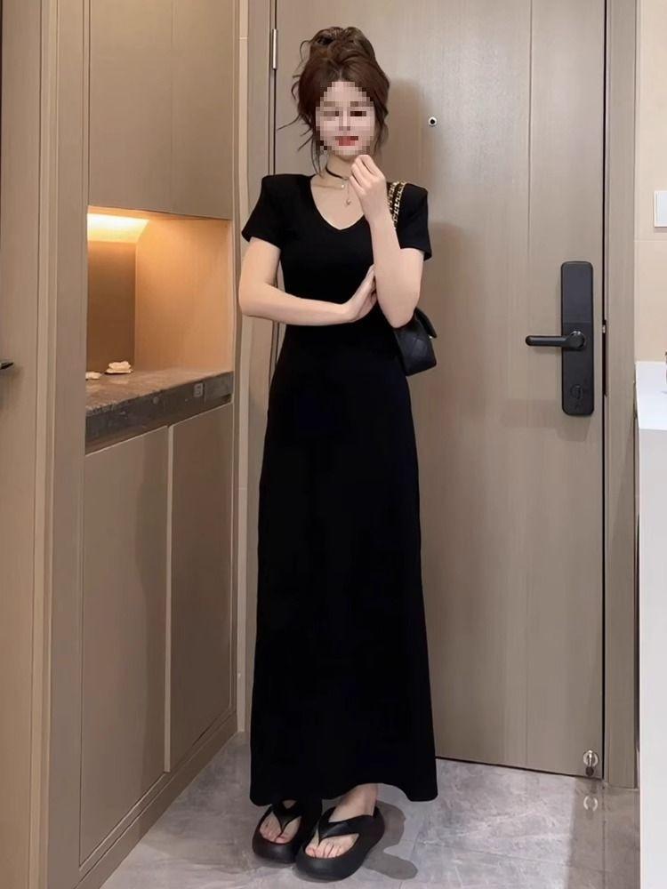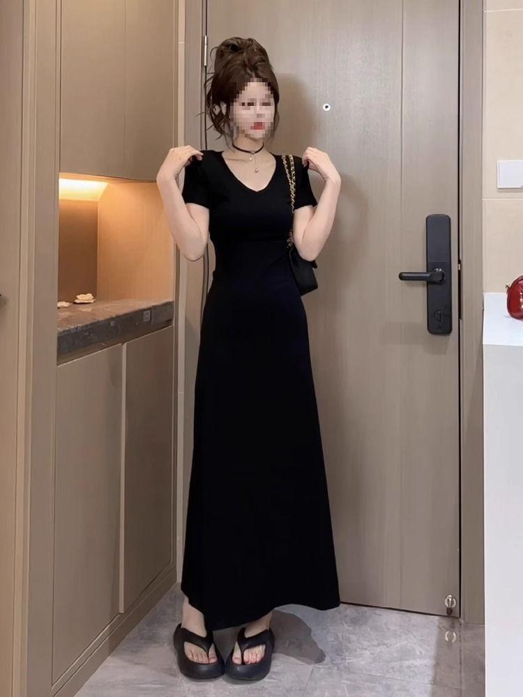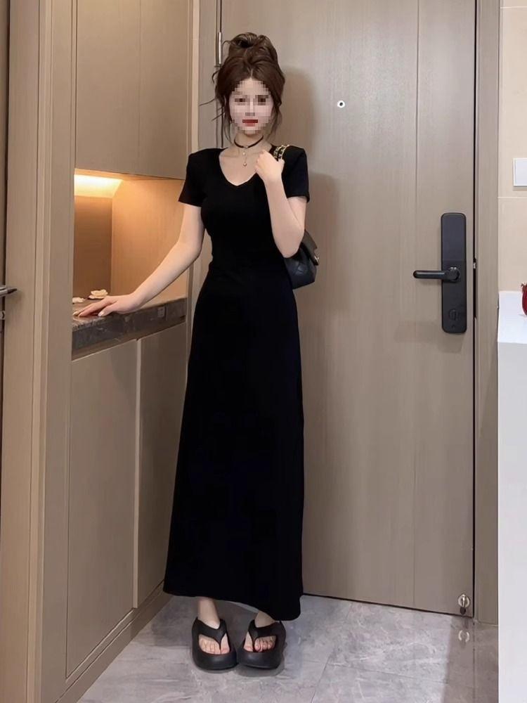 Vestido Negro de Manga Corta con Cuello en V de Estilo Casual 2025 Nueva Moda de Verano para Mujer Elegante Cintura Adelgazante Falda Línea A