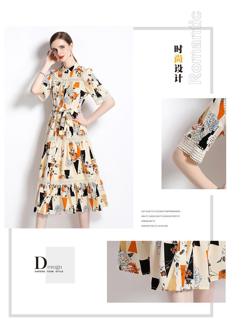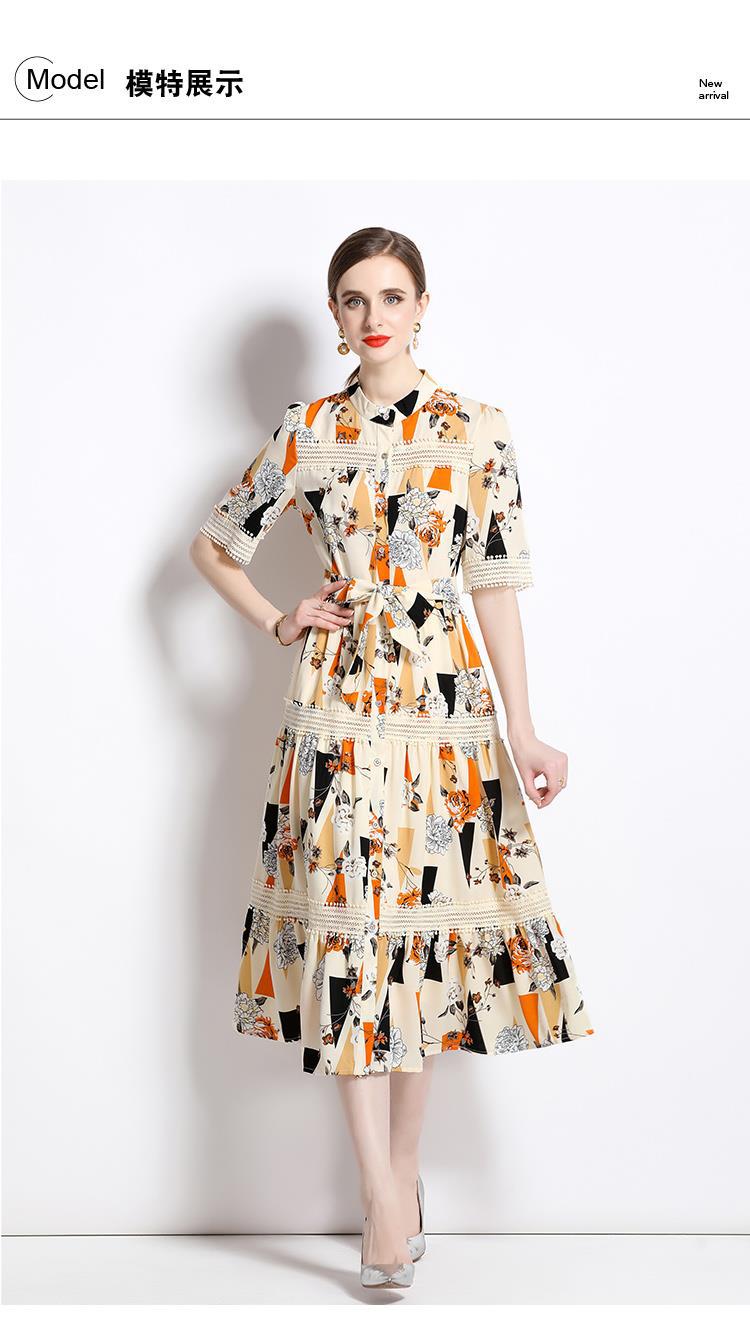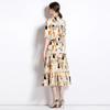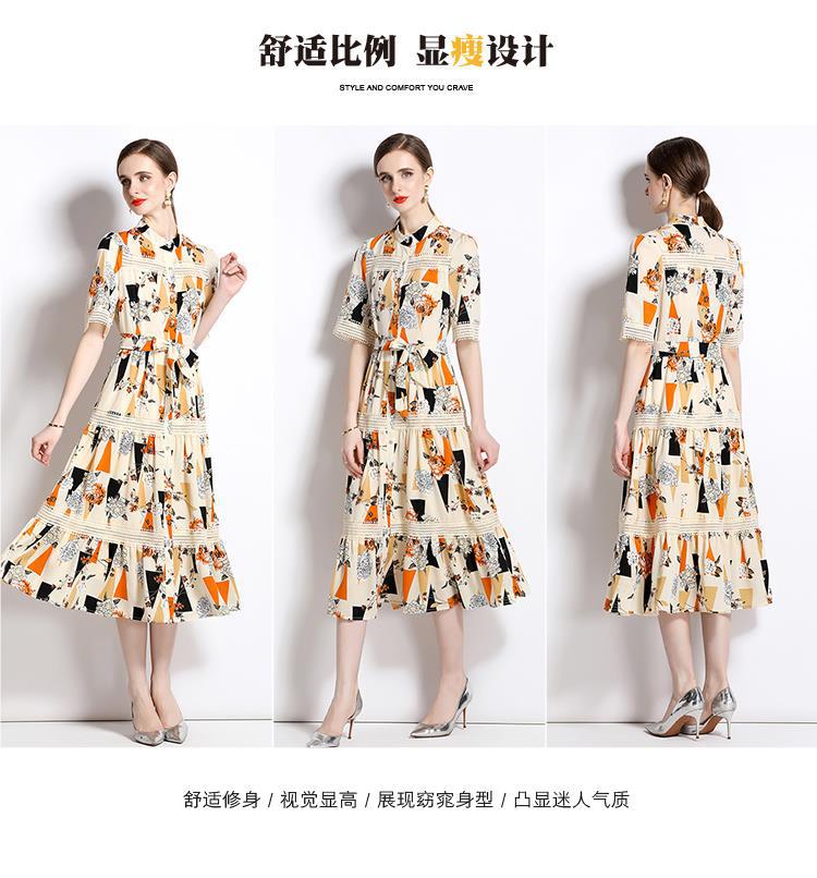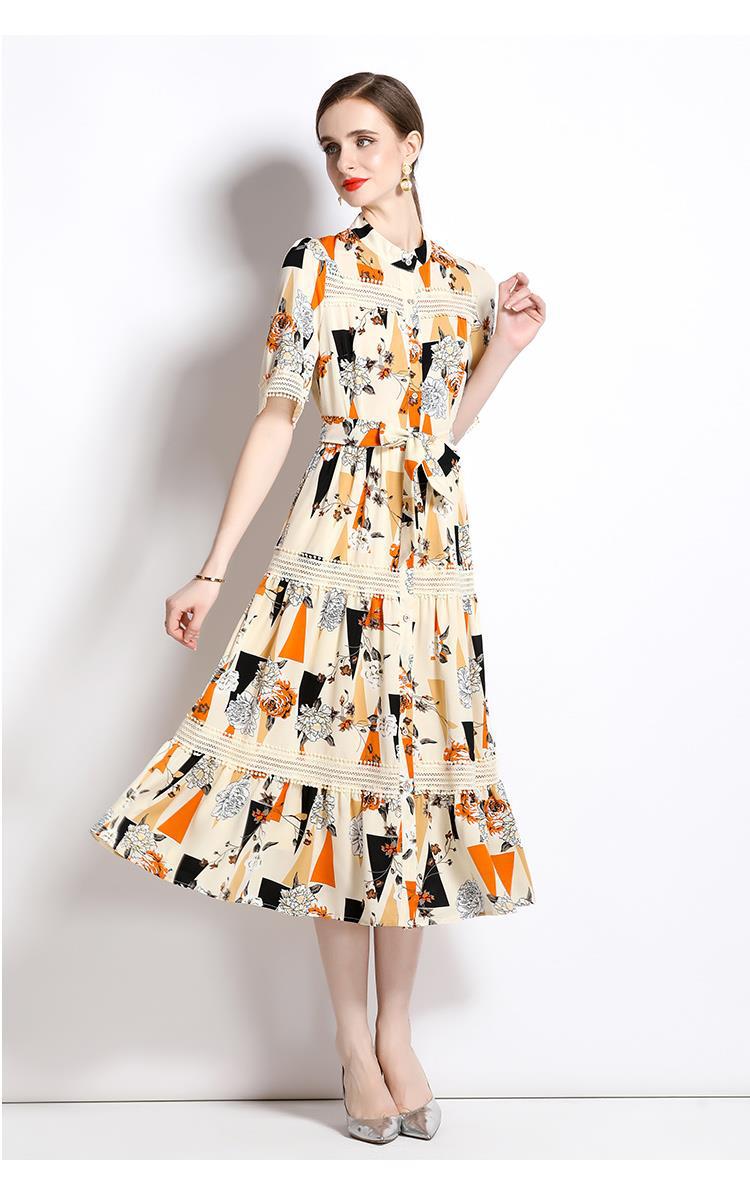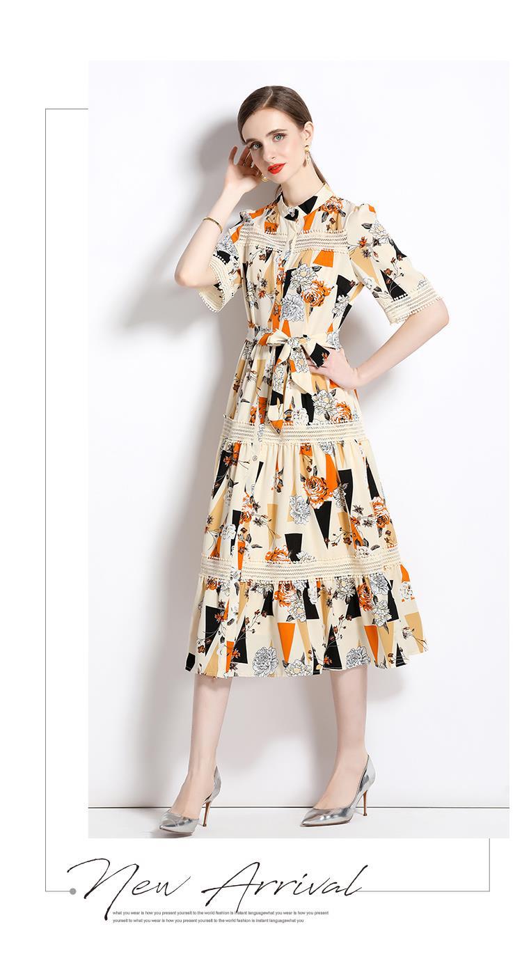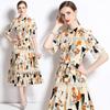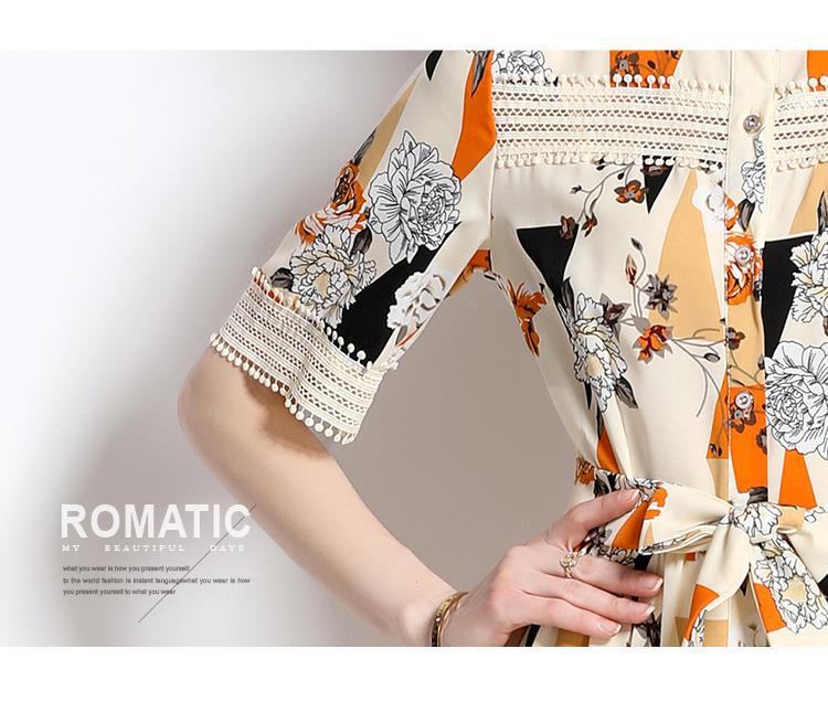 Foto real en stock verano cintura adelgazante hueco temperamento manga corta vestido de mujer chic impresionante vestido camisero estampado