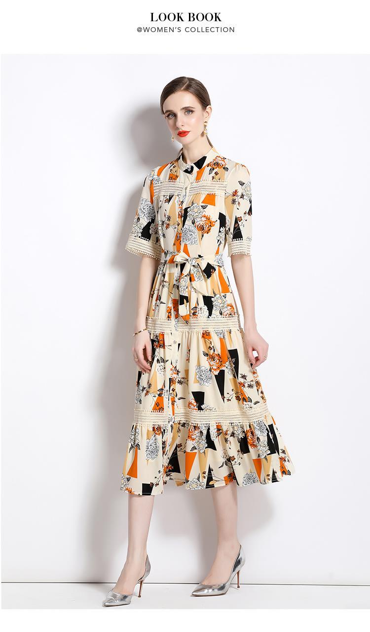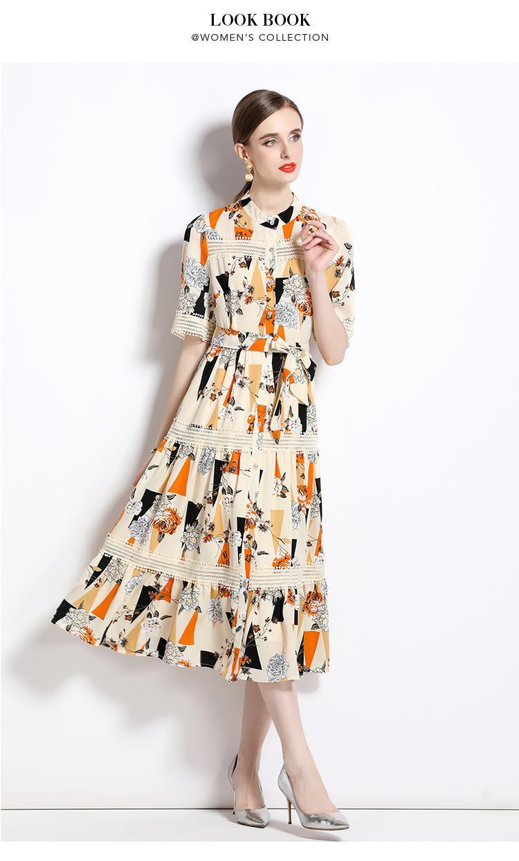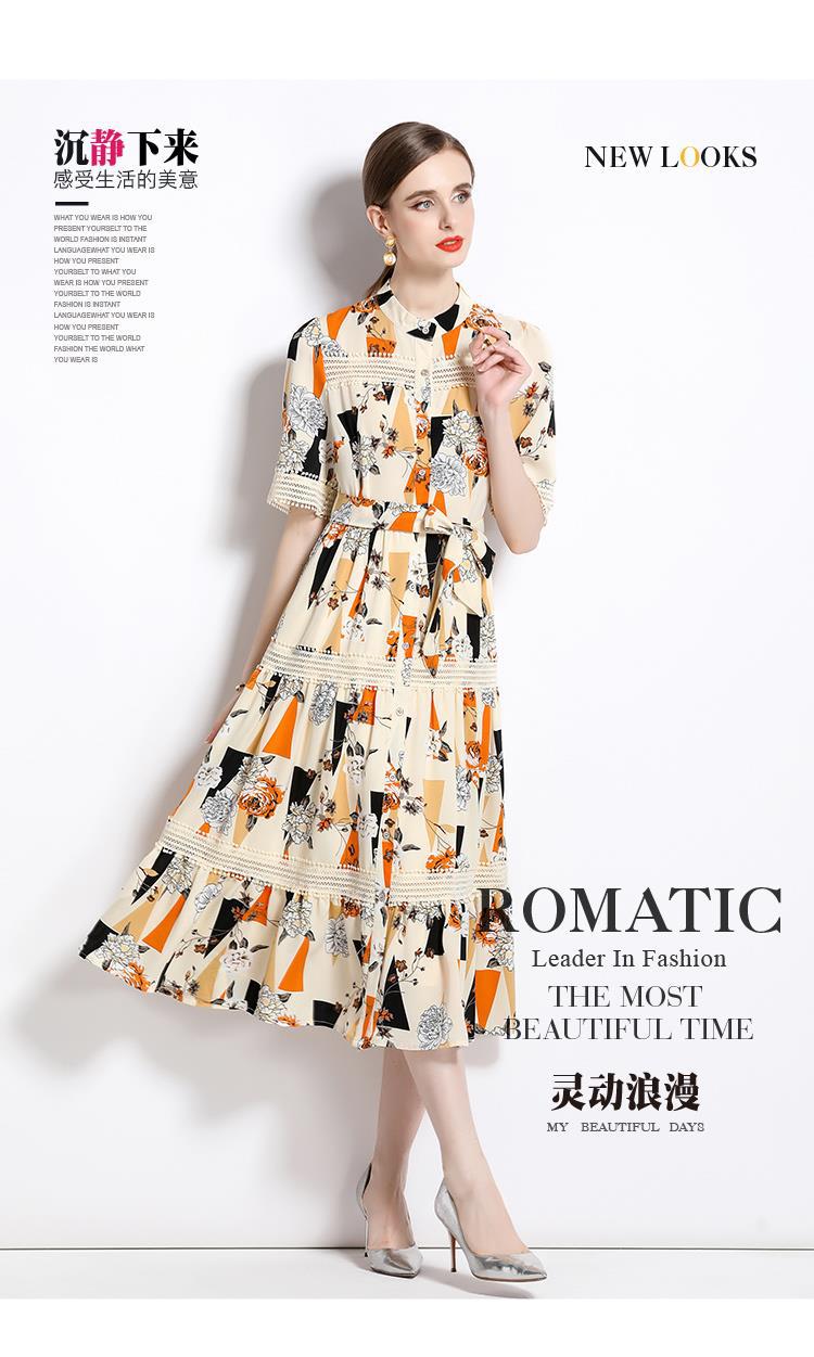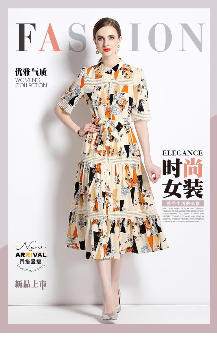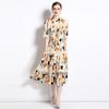 Foto real en stock verano cintura adelgazante hueco temperamento manga corta vestido de mujer chic impresionante vestido camisero estampado