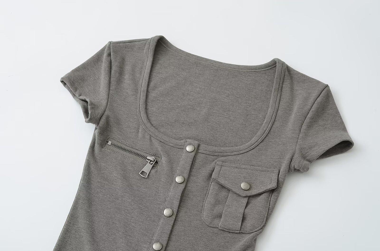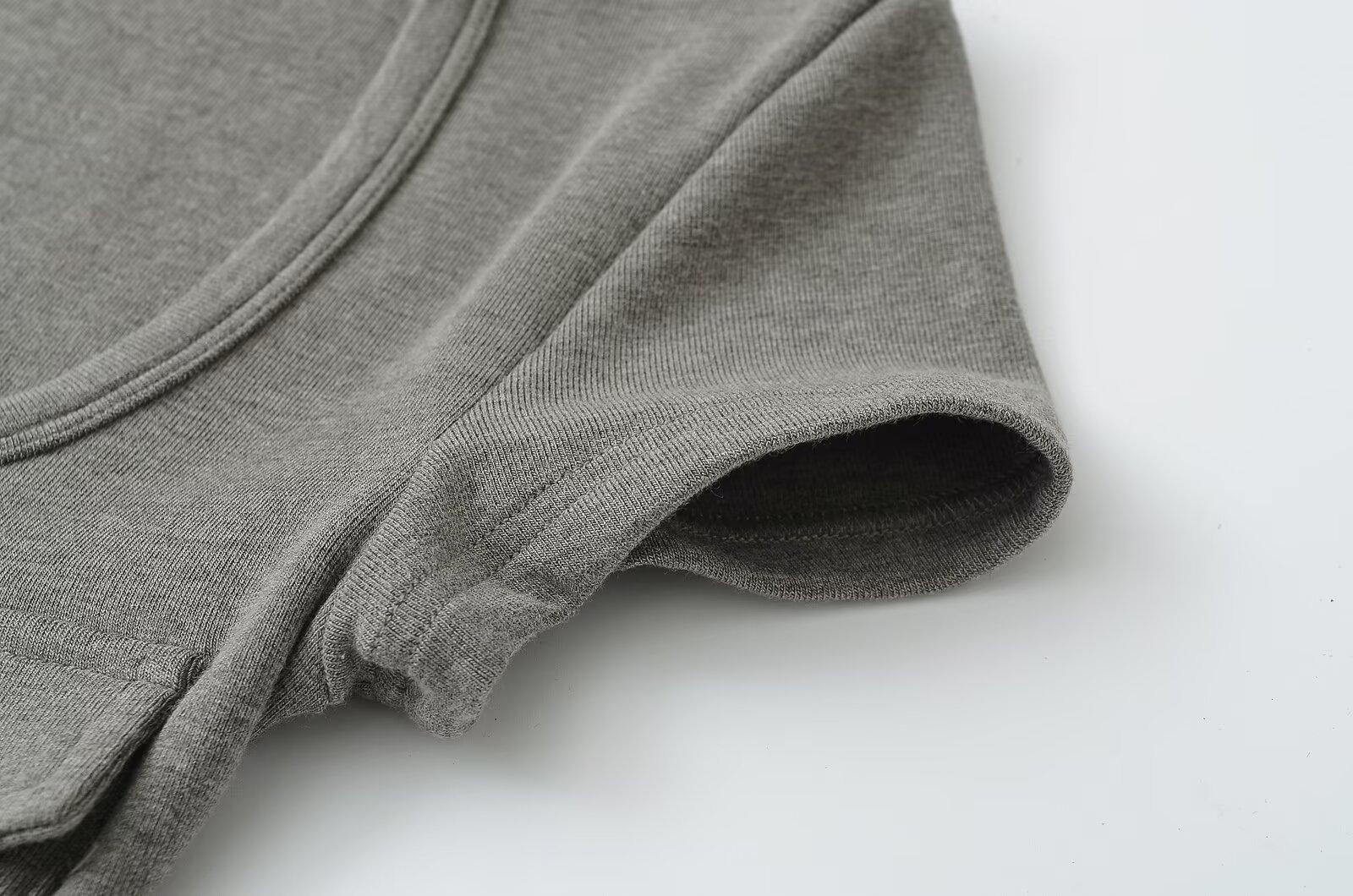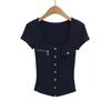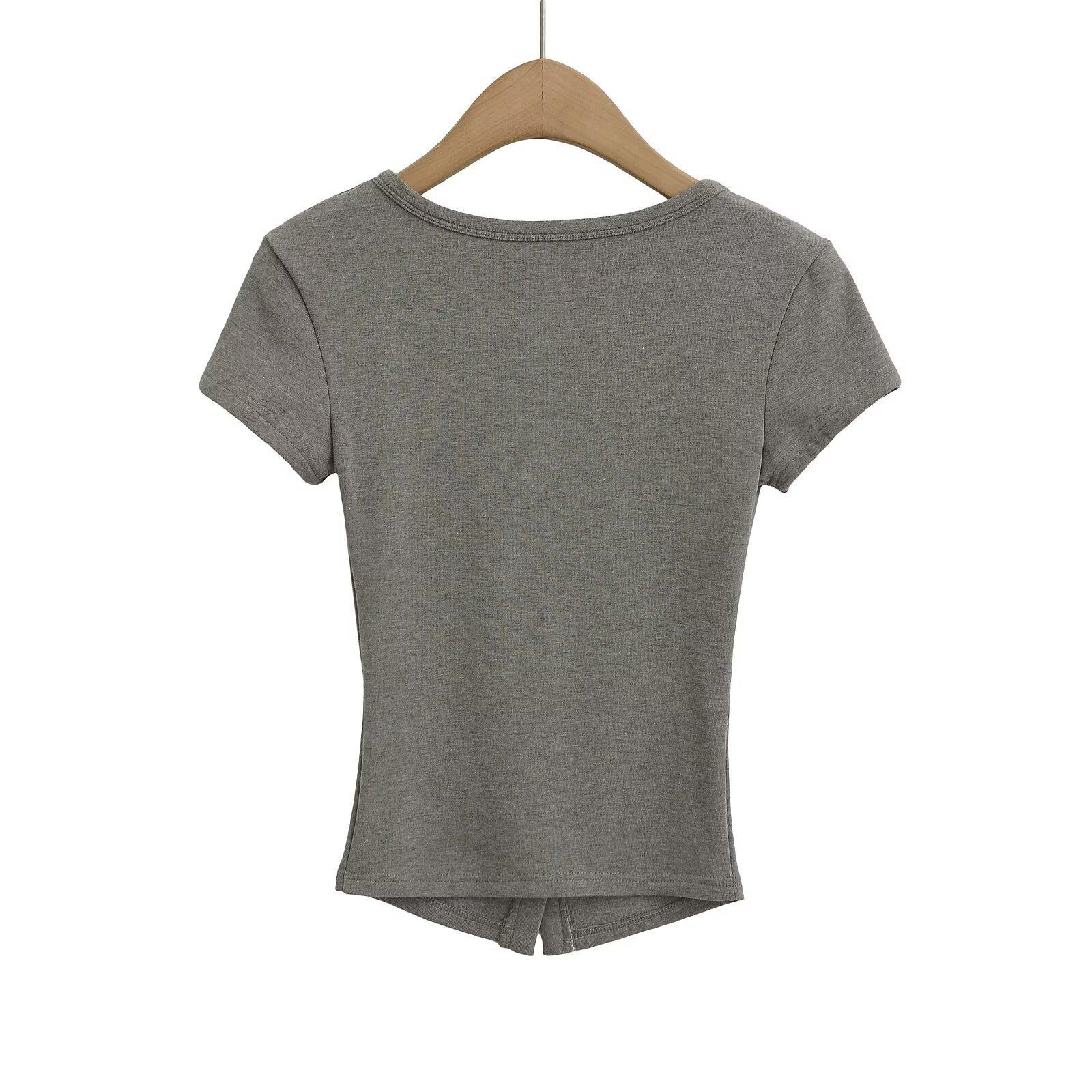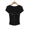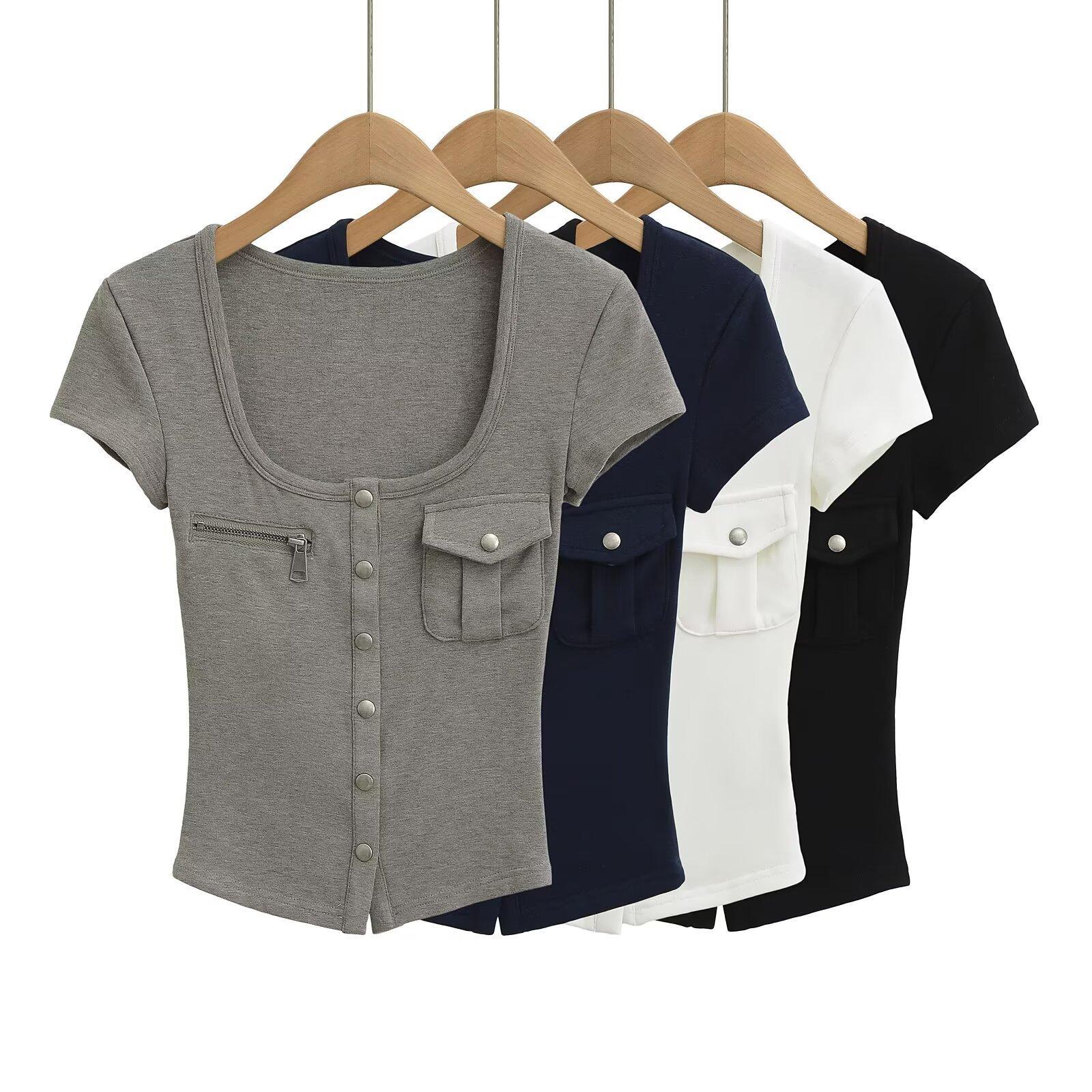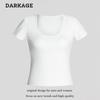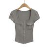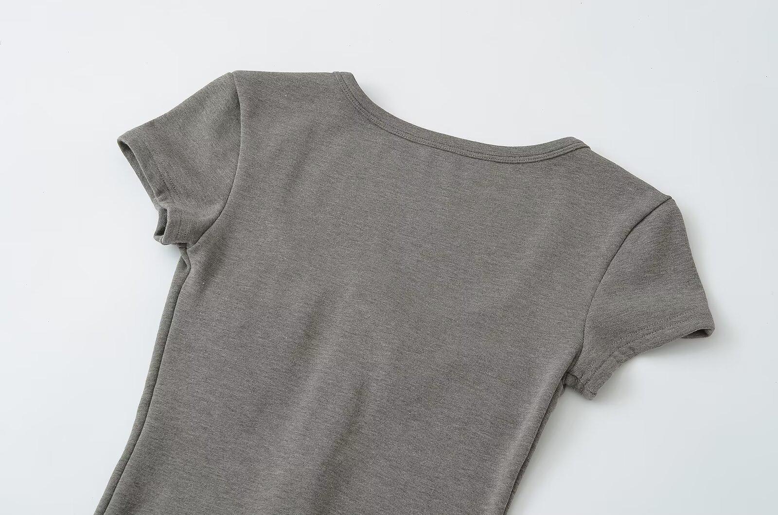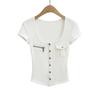 2025 Nueva Camiseta de Moda Estilo Europeo y Americano de Cuello U Versátil de Manga Corta Femenina Ajustada Hombro Derecho Camiseta Básica Top