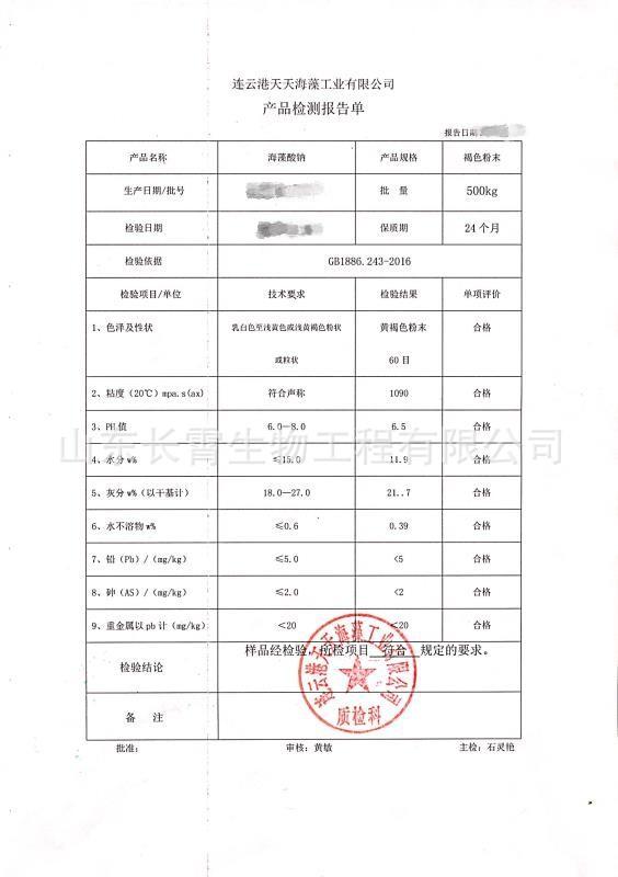 1、Solubilidad: El alginato de sodio es soluble en agua, insoluble en disolventes orgánicos como etanol, éter, cloroformo. Se disuelve en agua para formar un líquido viscoso, y una solución acuosa al 1% tiene un valor de pH de 6-8. La viscosidad es estable cuando pH=6-9
