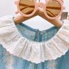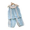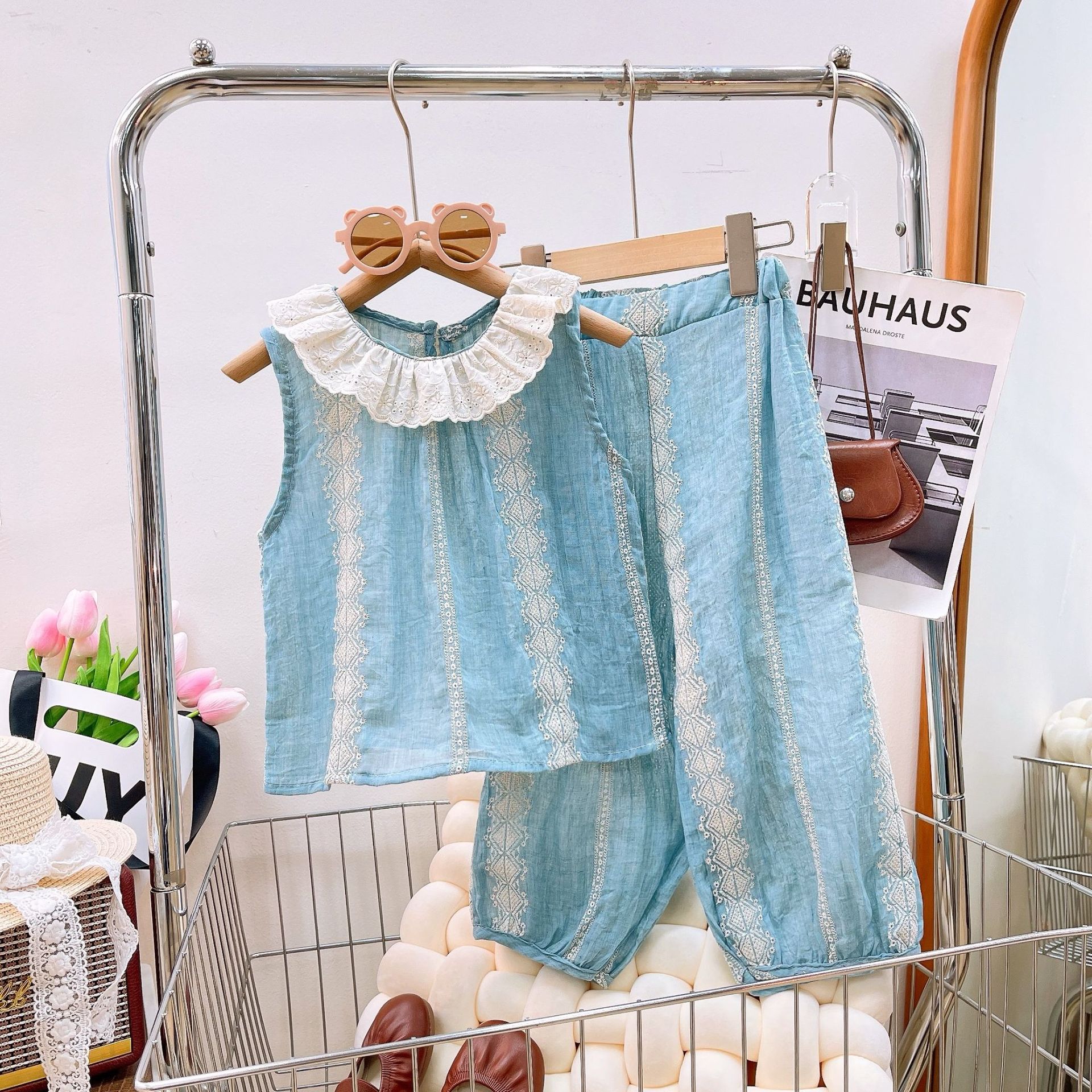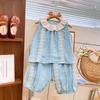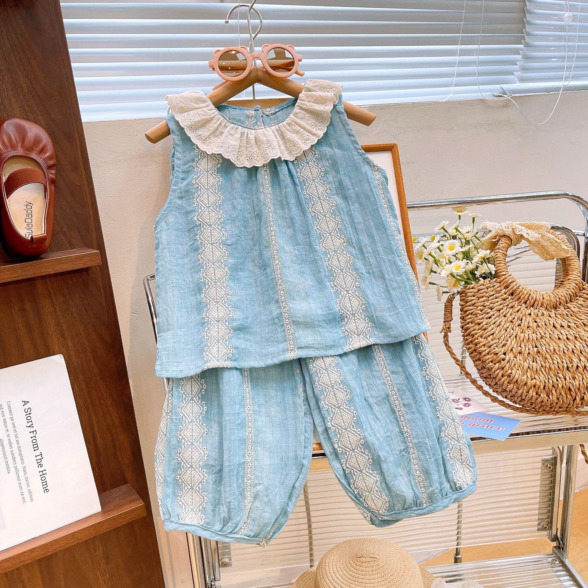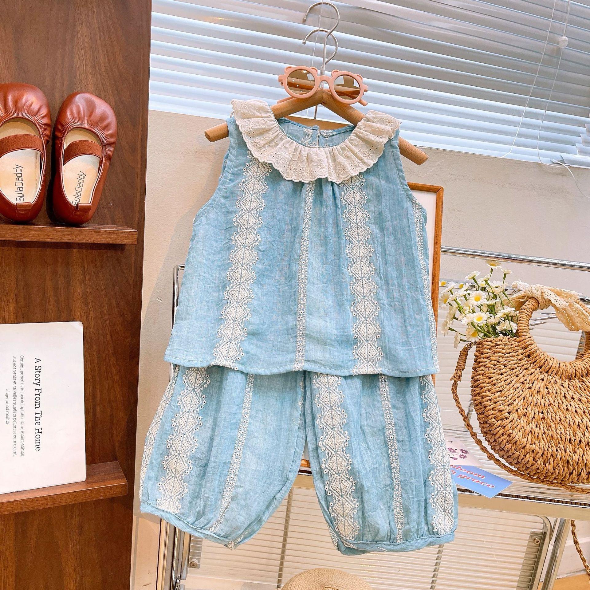 Venta al por mayor de ropa infantil transfronteriza Trajes de niña Verano 24 Nuevos Tops sin mangas con encaje y patchwork para niños más bragas