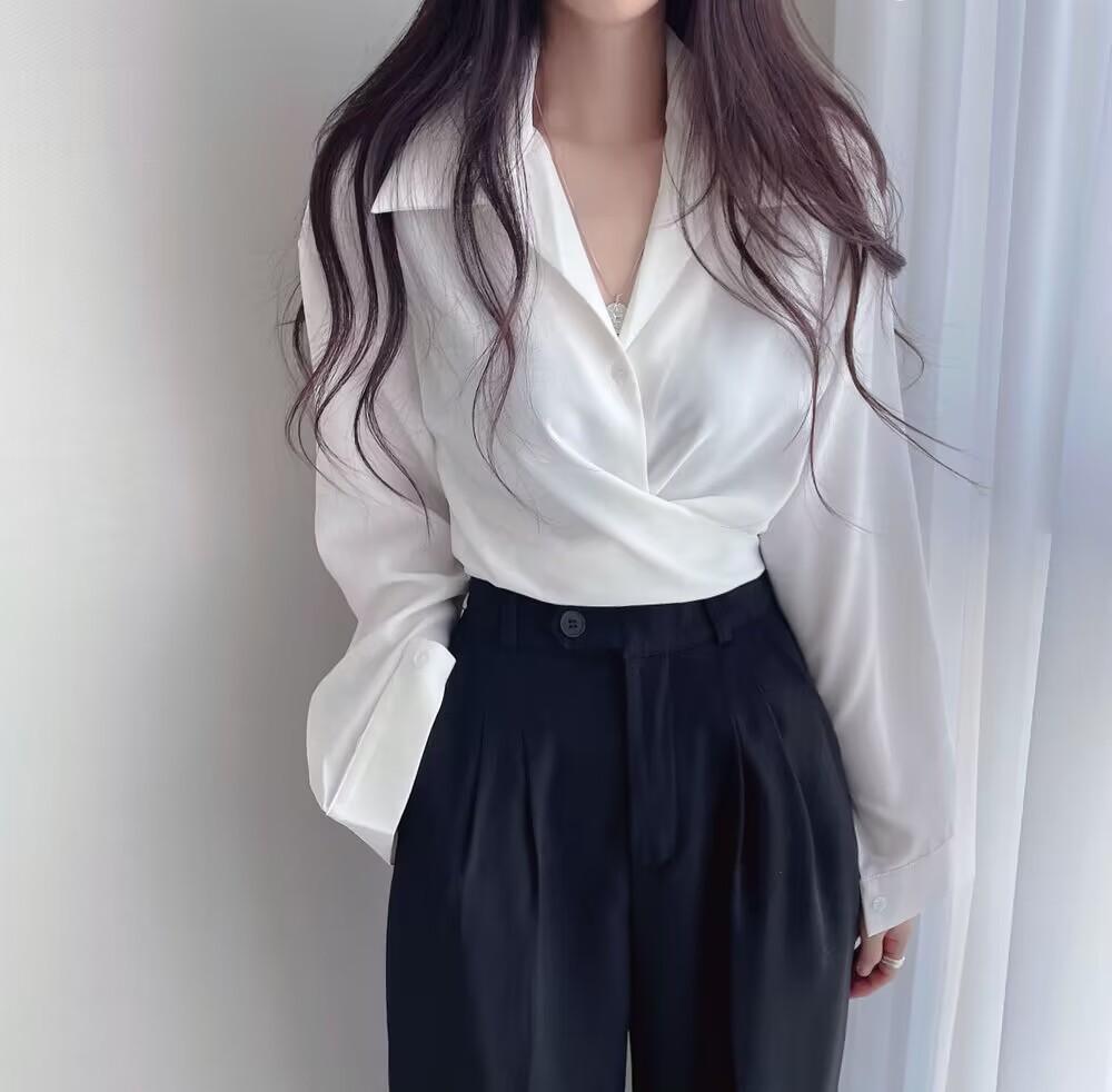 Camisa corta de un solo pecho con cordones y estilo retro elegante que adelgaza la cintura, ideal para primavera y otoño de 2025.