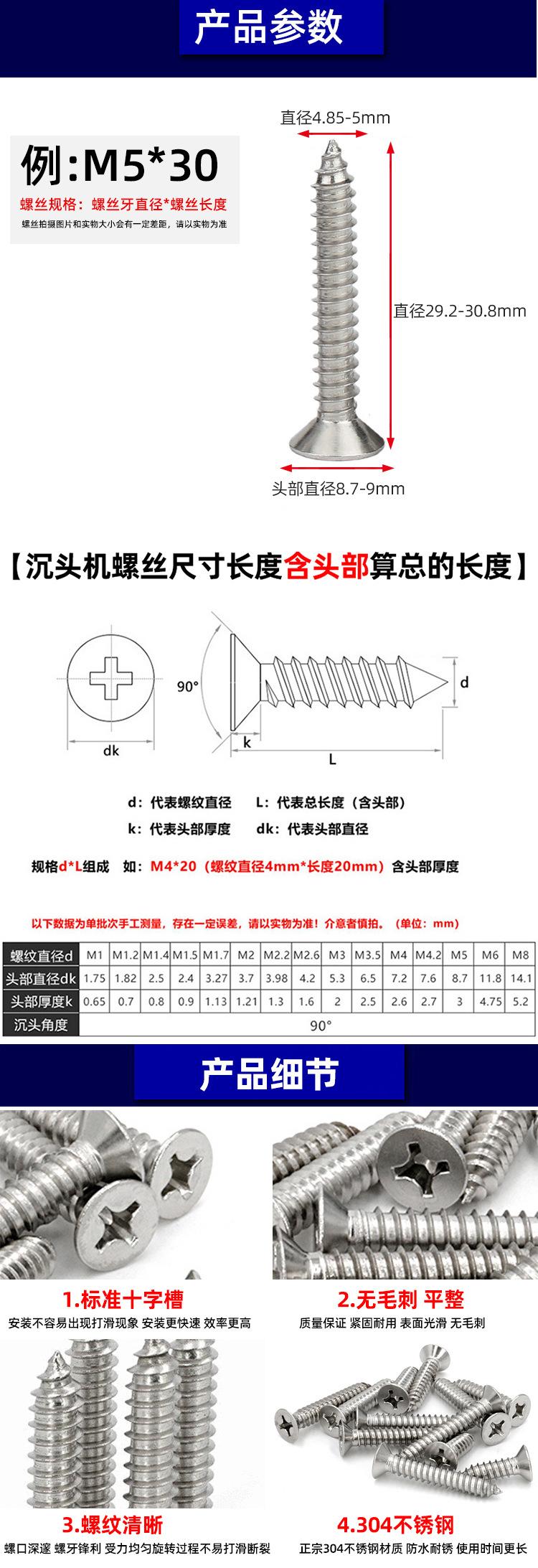 Tornillos autorroscantes de acero inoxidable 304, Tornillos autorroscantes de cabeza avellanada cruz, Tornillos autorroscantes, Tornillos autorroscantes de cabeza avellanada cruz