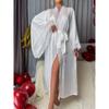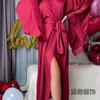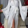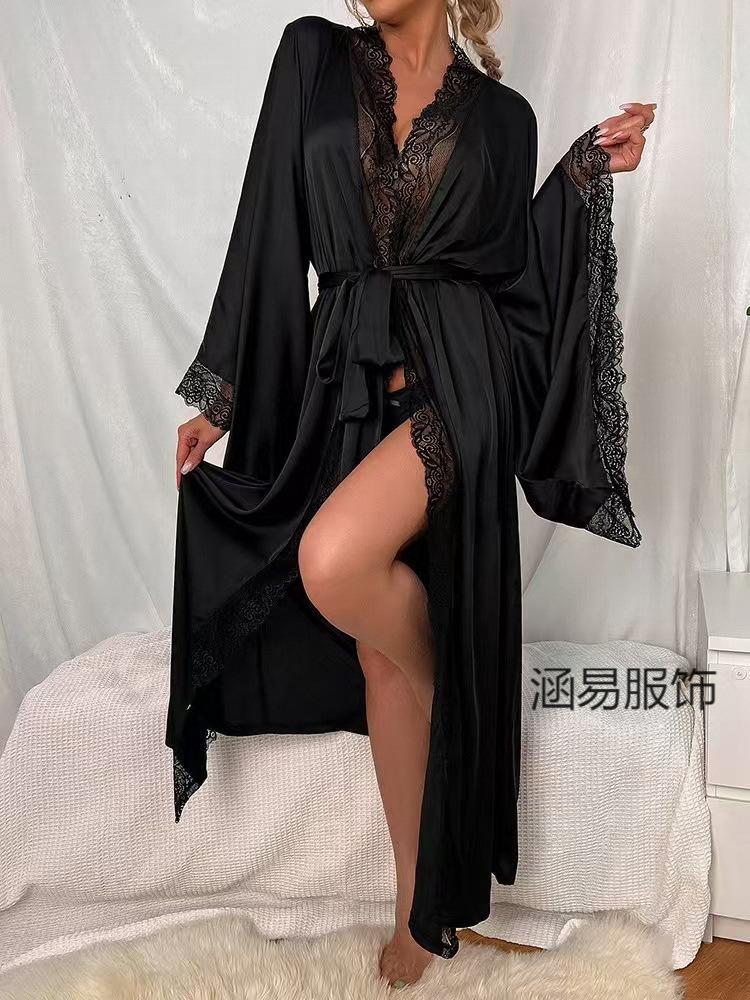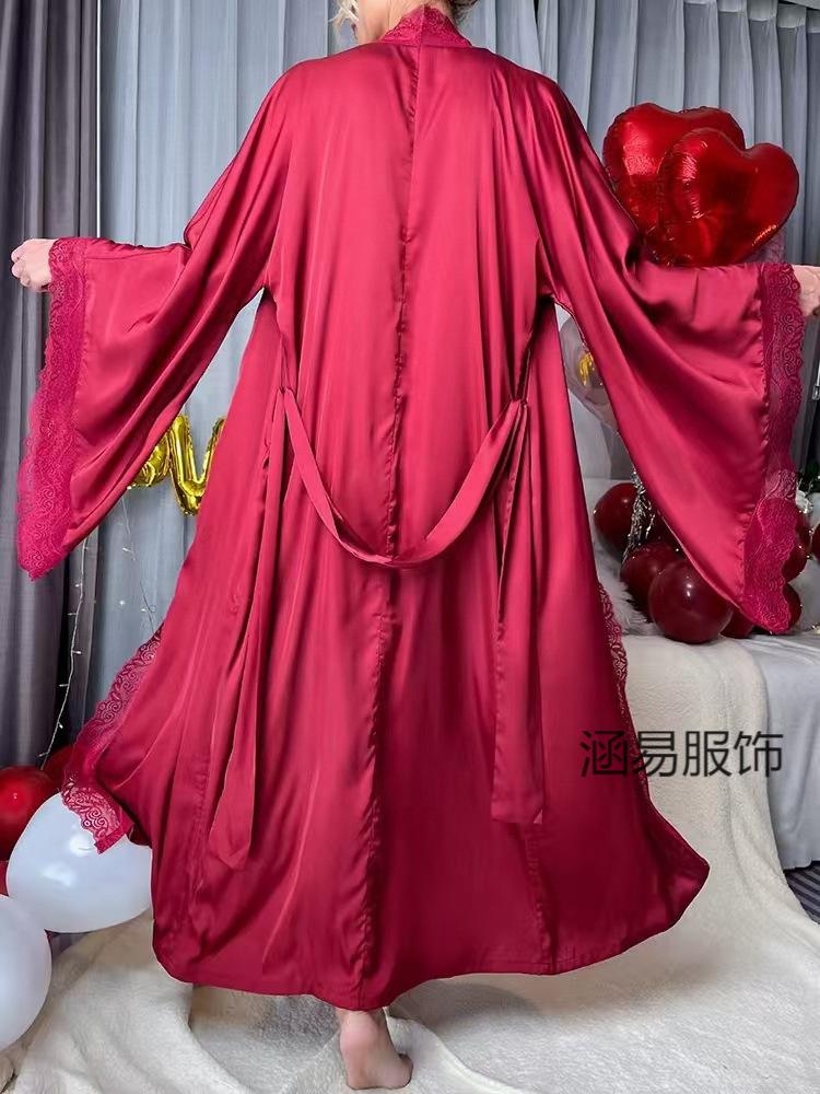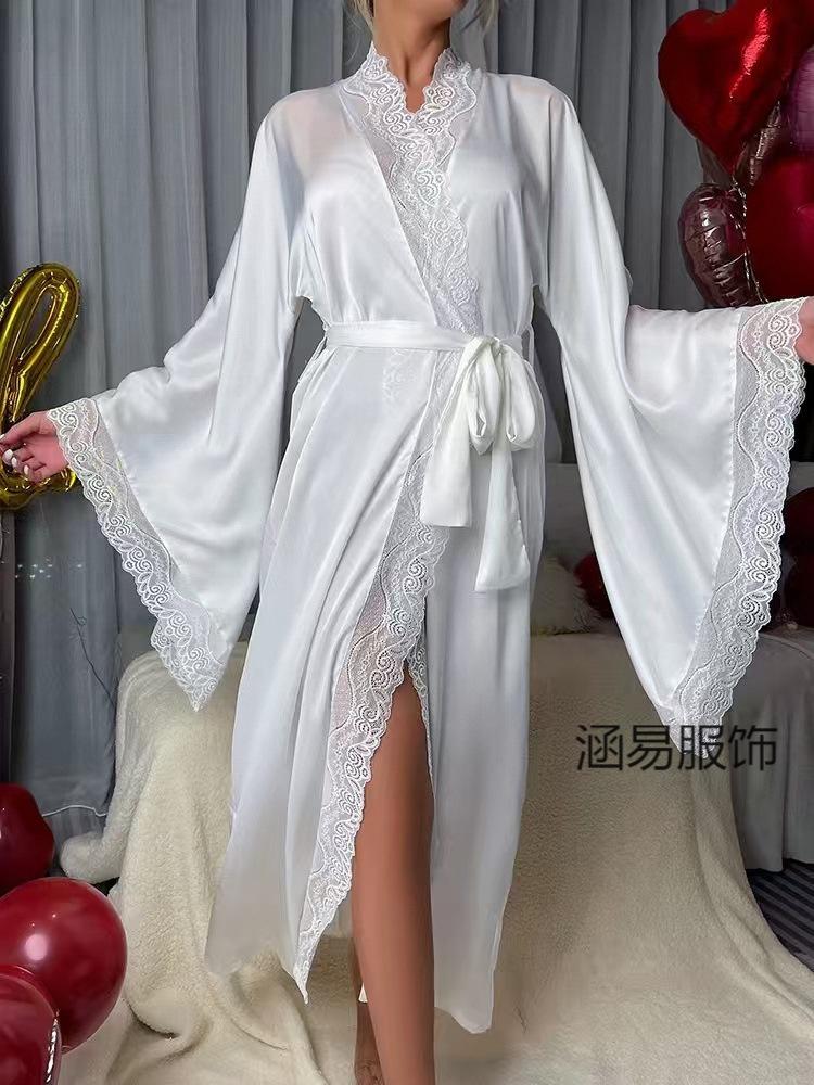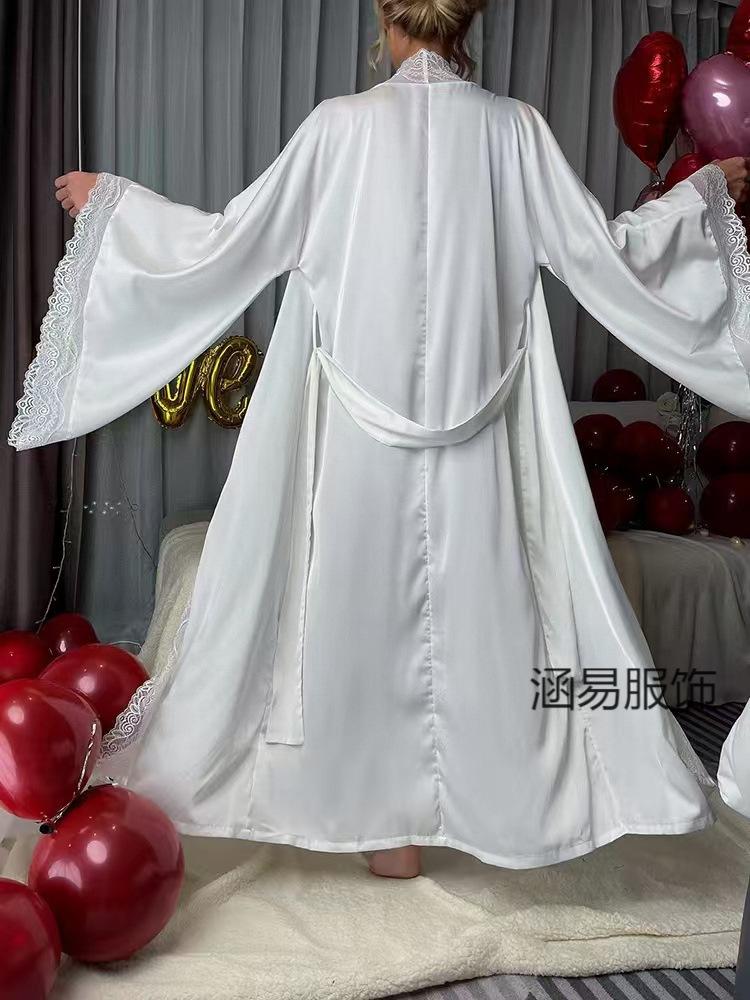 Pijama de Satén Transfronterizo Nuevo de Hanyi para Mujer Primavera y Verano Encaje Lujo Ligero Camisón Fresco Bata Manga Larga para Casa