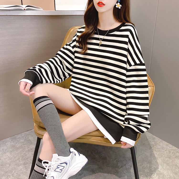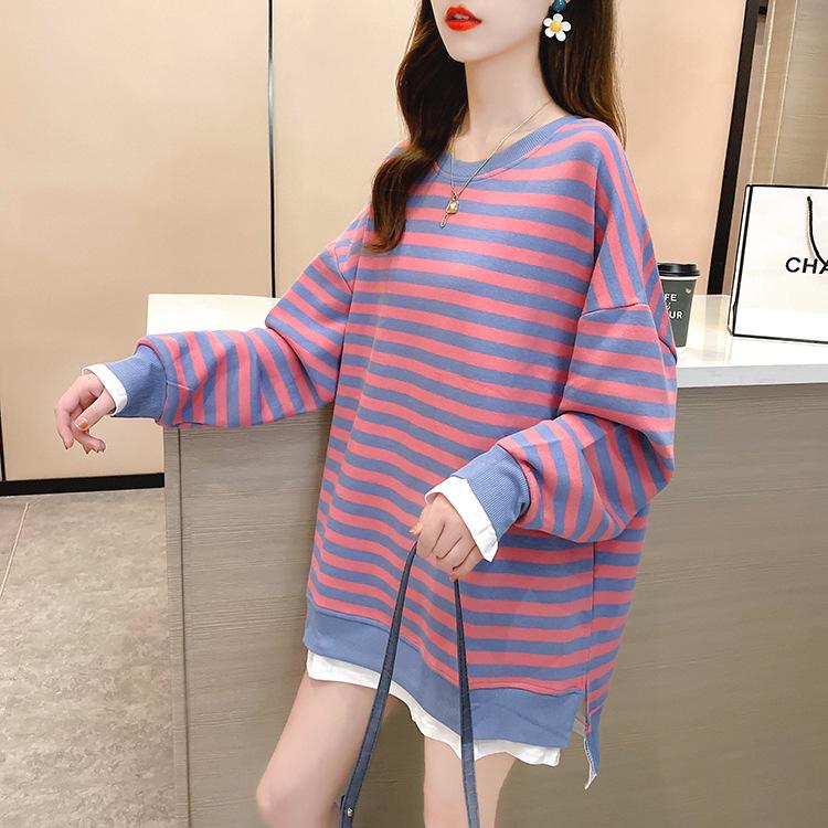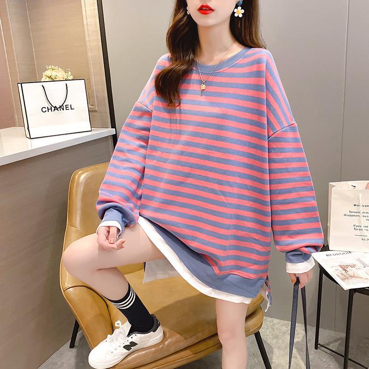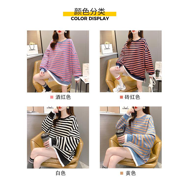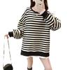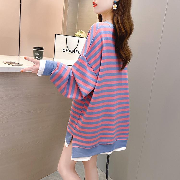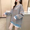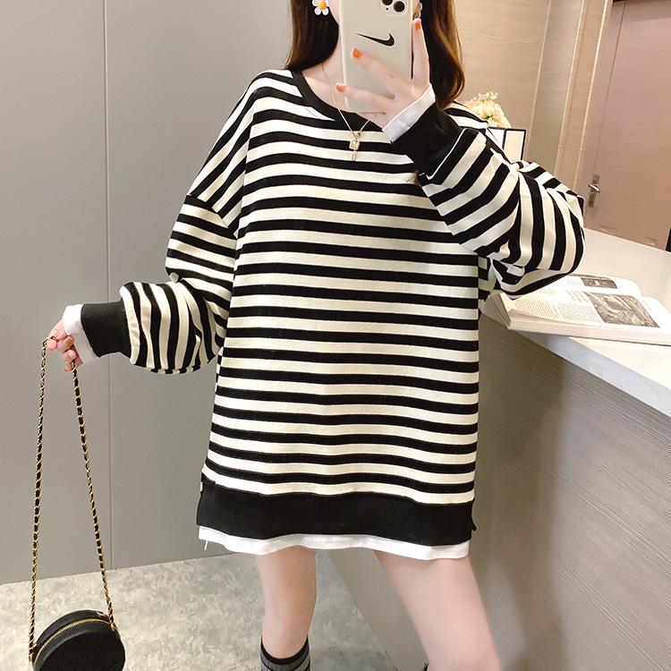 Tops de Maternidad 2022 Otoño Moda Coreana Versátil Talla Grande Ropa de Maternidad Sudadera Holgada de Cuello Redondo a Rayas de Imitación de Dos Piezas