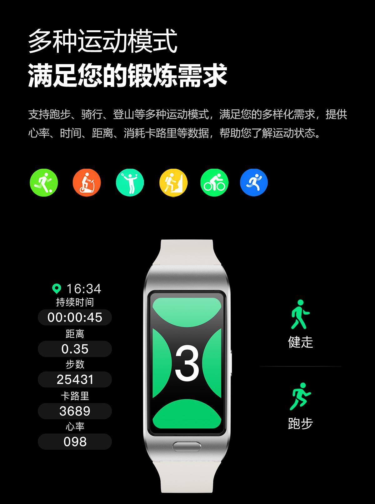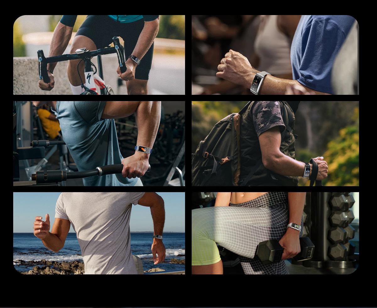 Deportes: Podómetro, caminata rápida, correr, fútbol, bádminton, tenis, baloncesto, tenis de mesa, ciclismo, montañismo, salto de cuerda, yoga, etc. Más de 100 modos deportivos