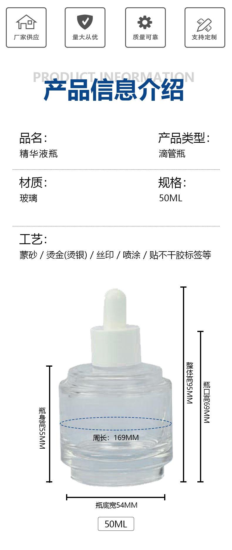 Botella de vidrio para aceite esencial de 50 ml de gran venta con tapón gotero, corta y rechoncha, roscada, botella de muestra de esencia de loción cosmética, transparente