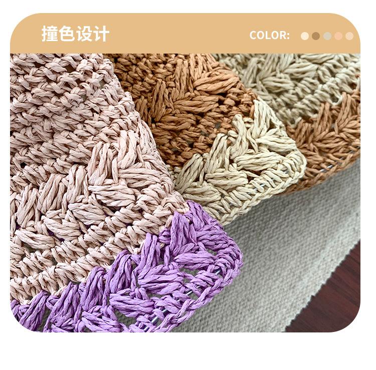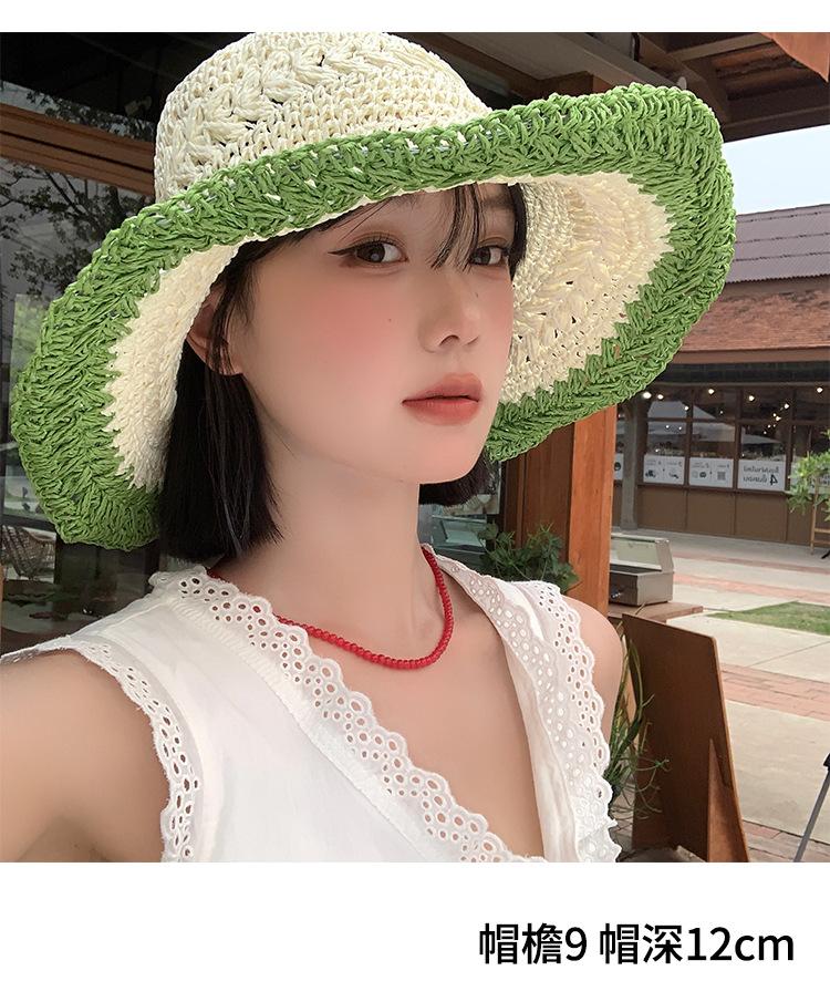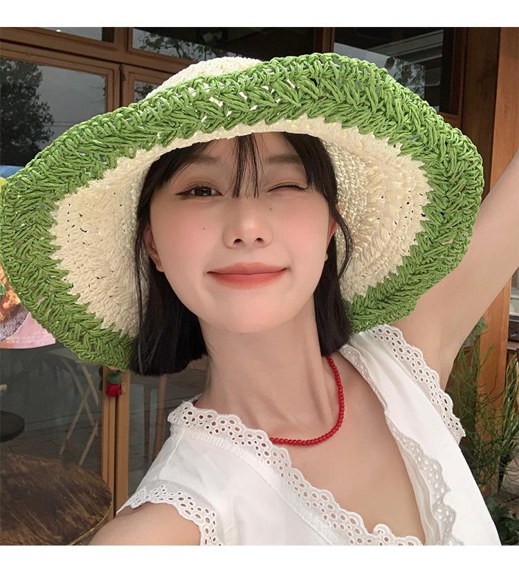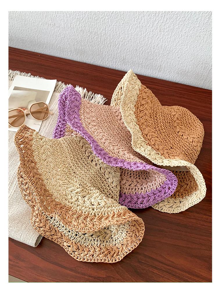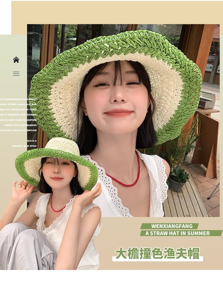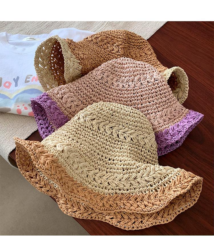 Compra Sombrero de Paja Tejida de Bloques de Color Estilo Japonés para Mujer Verano Nuevo Ala Ancha Parasol Sombrero de Cubeta Hueco Sombrero Protector Solar para la Playa al por mayor en Joom.pro