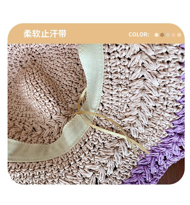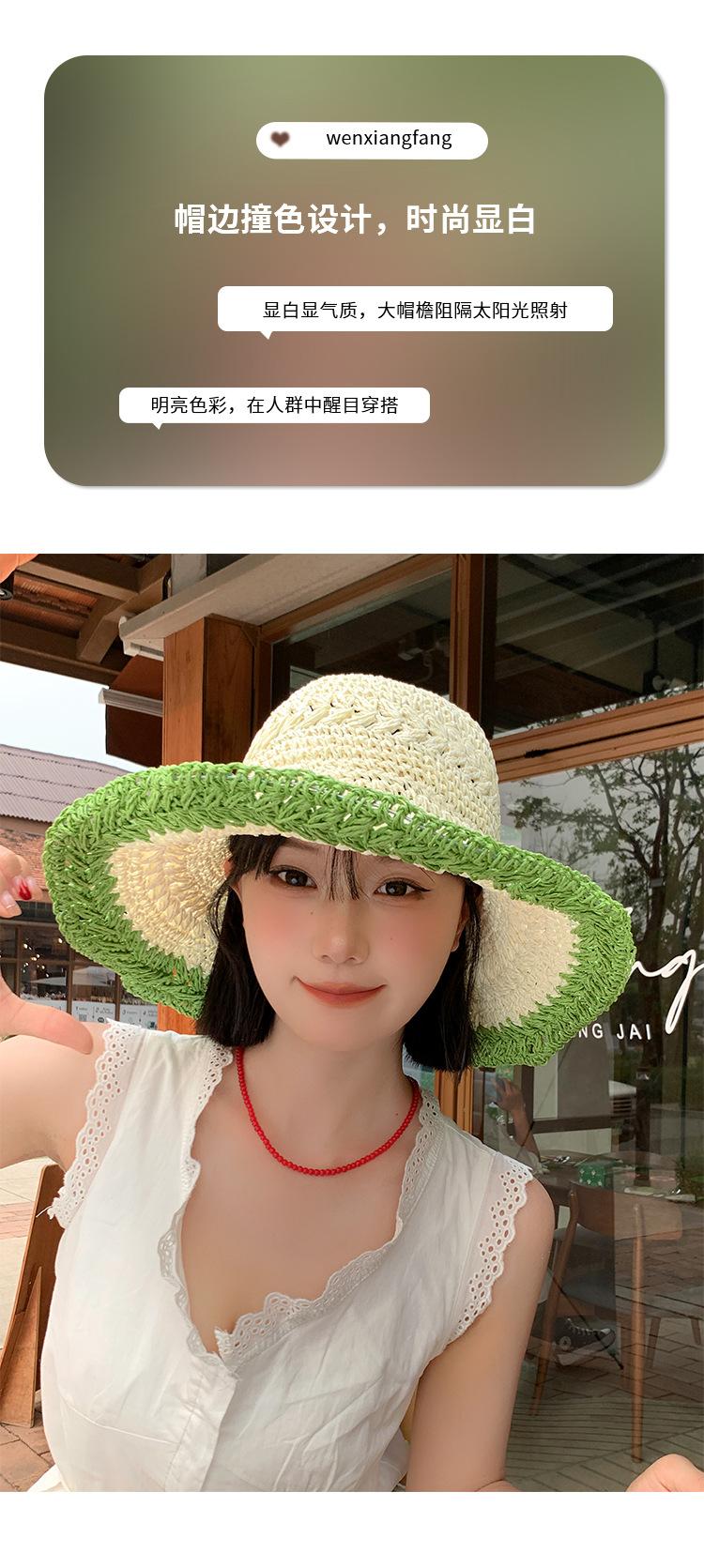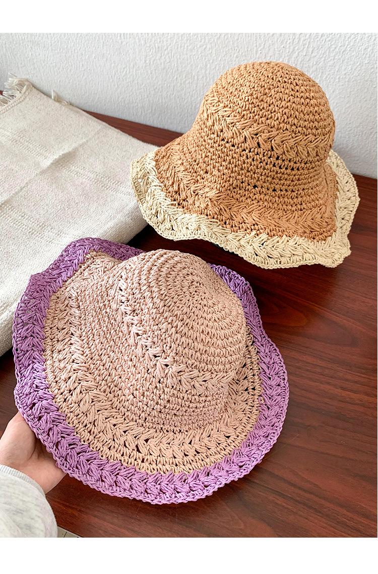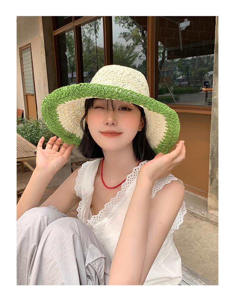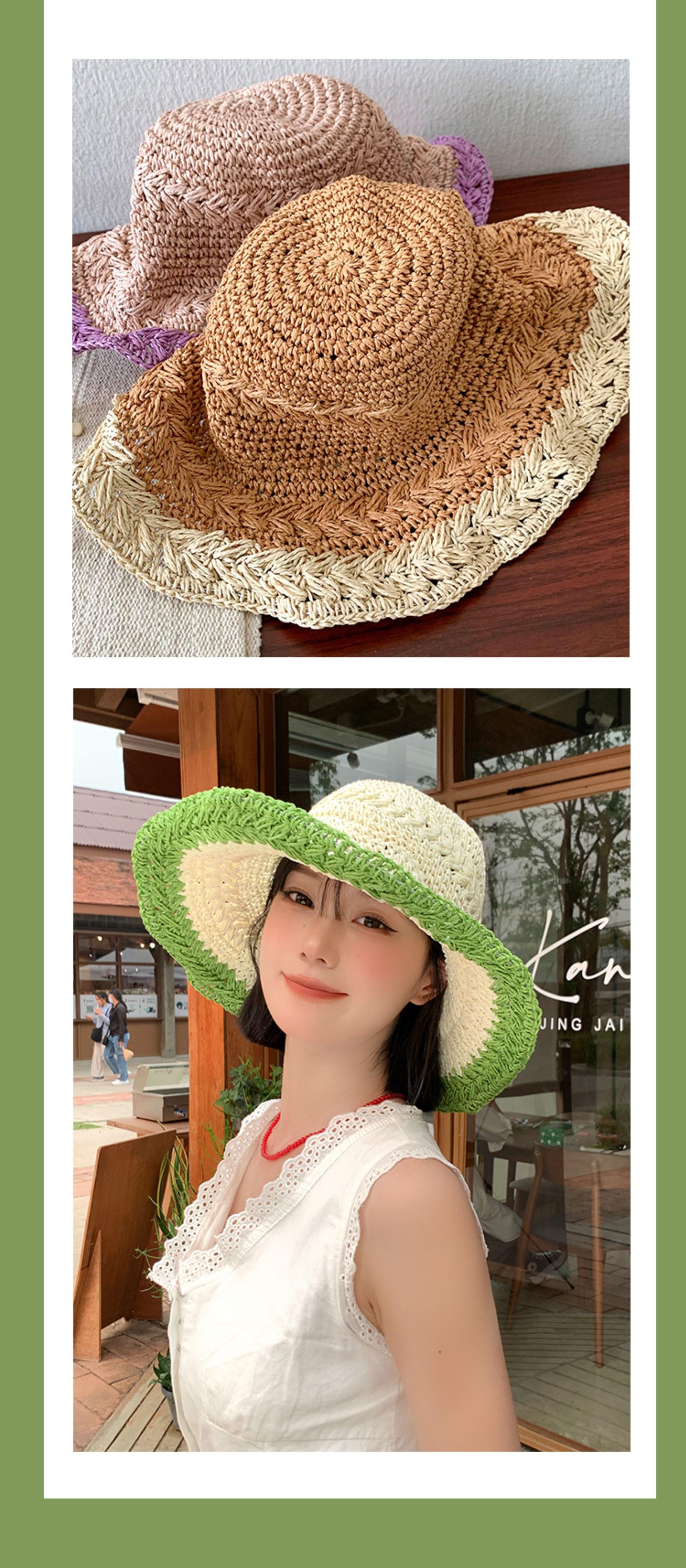 Compra Sombrero de Paja Tejida de Bloques de Color Estilo Japonés para Mujer Verano Nuevo Ala Ancha Parasol Sombrero de Cubeta Hueco Sombrero Protector Solar para la Playa al por mayor en Joom.pro