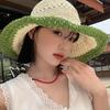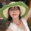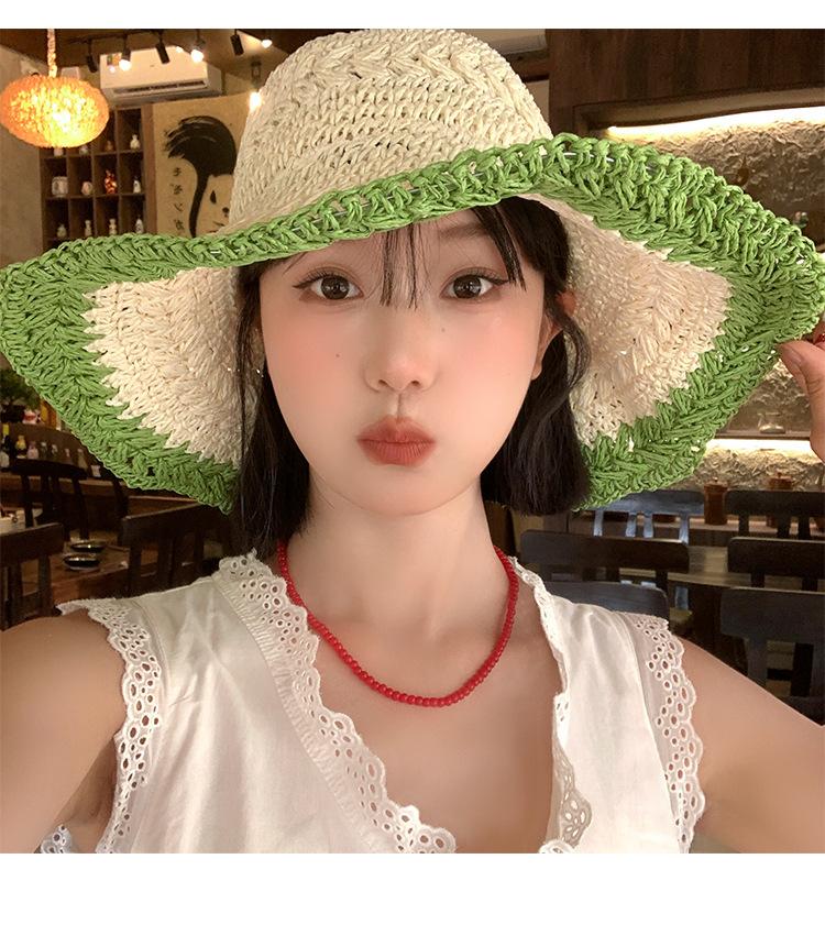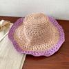 Sombrero de Paja Tejida de Bloques de Color Estilo Japonés para Mujer Verano Nuevo Ala Ancha Parasol Sombrero de Cubeta Hueco Sombrero Protector Solar para la Playa