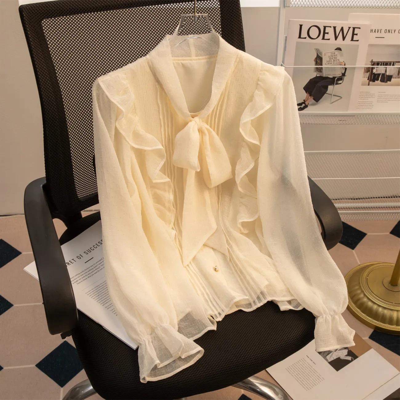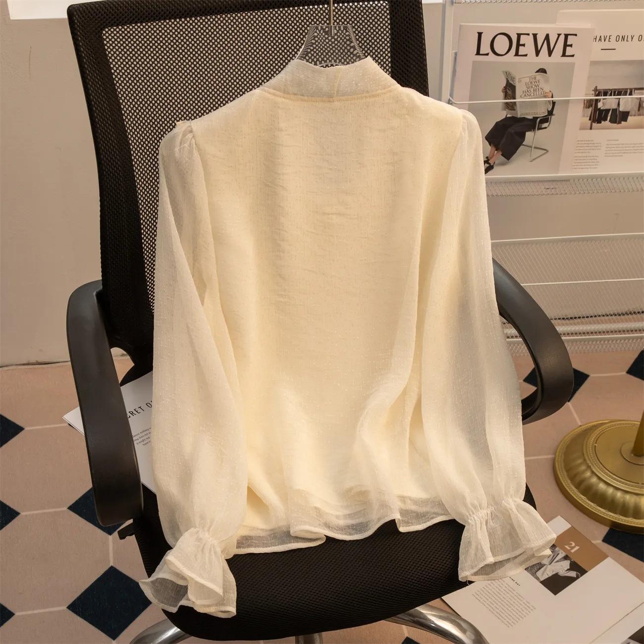 Camisa de Gasa Francesa para Mujer Primavera y Otoño 2024 Nuevo Diseño de Moda Sentido Nicho Top Lazo Manga Larga Ropa Exterior