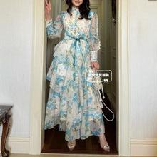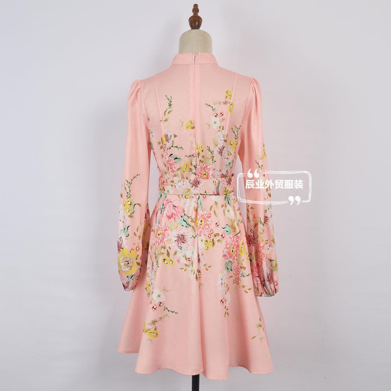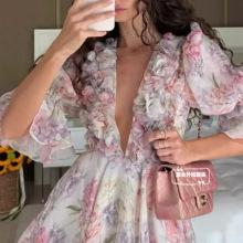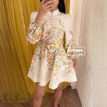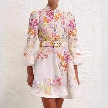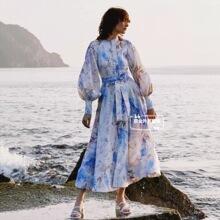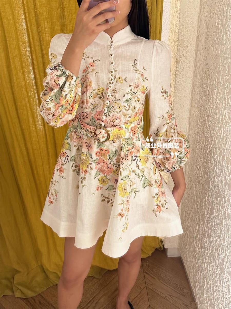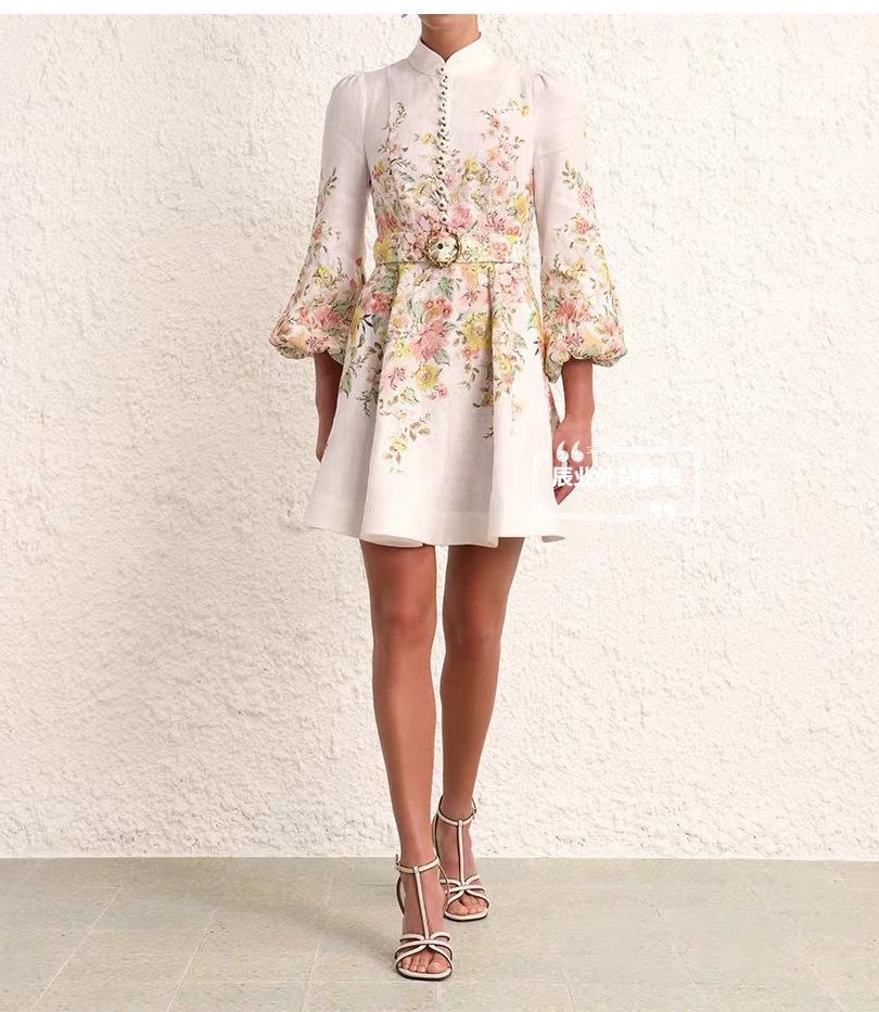 Nuevo Estilo Primavera Verano 2025 Transfronterizo Cuello Alto Cruzado Manga Linterna Vestido Estampado Femenino Versátil Falda Corta