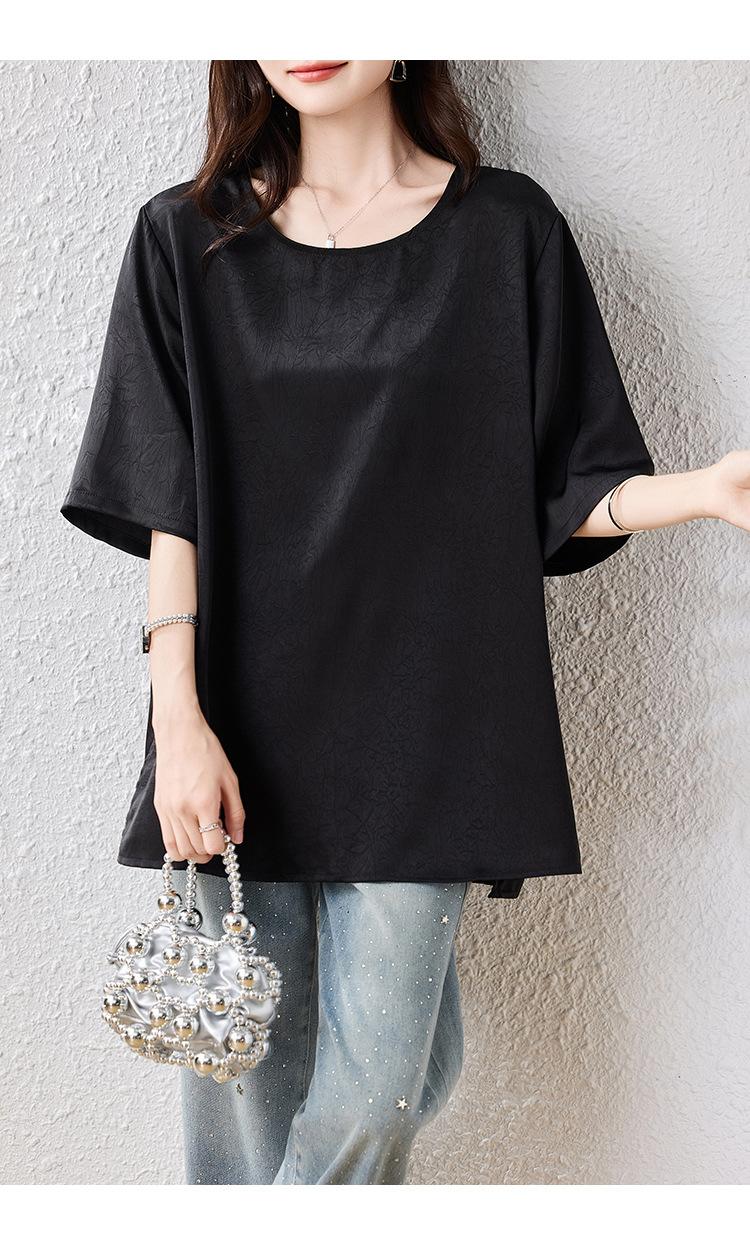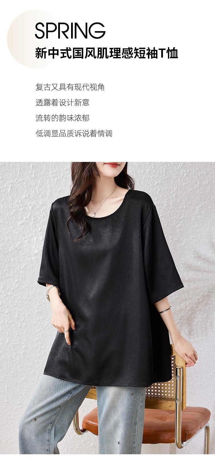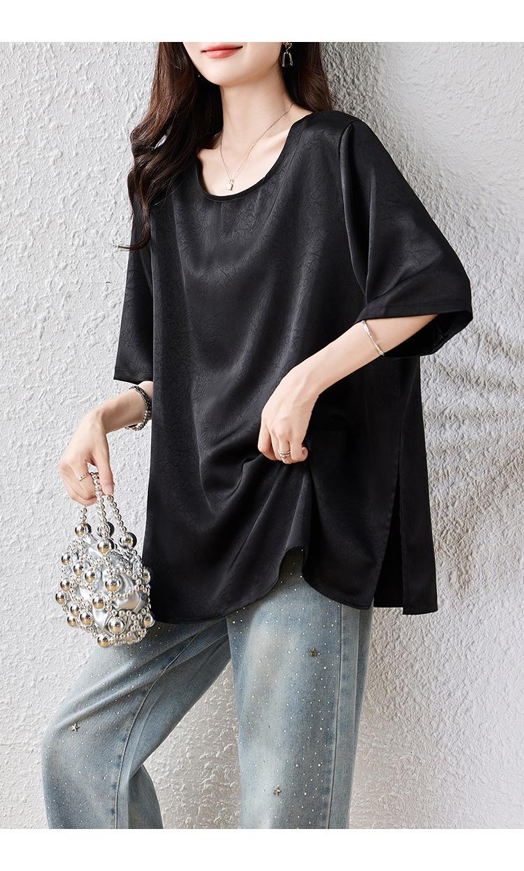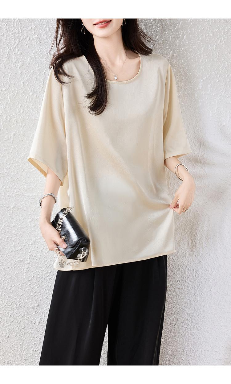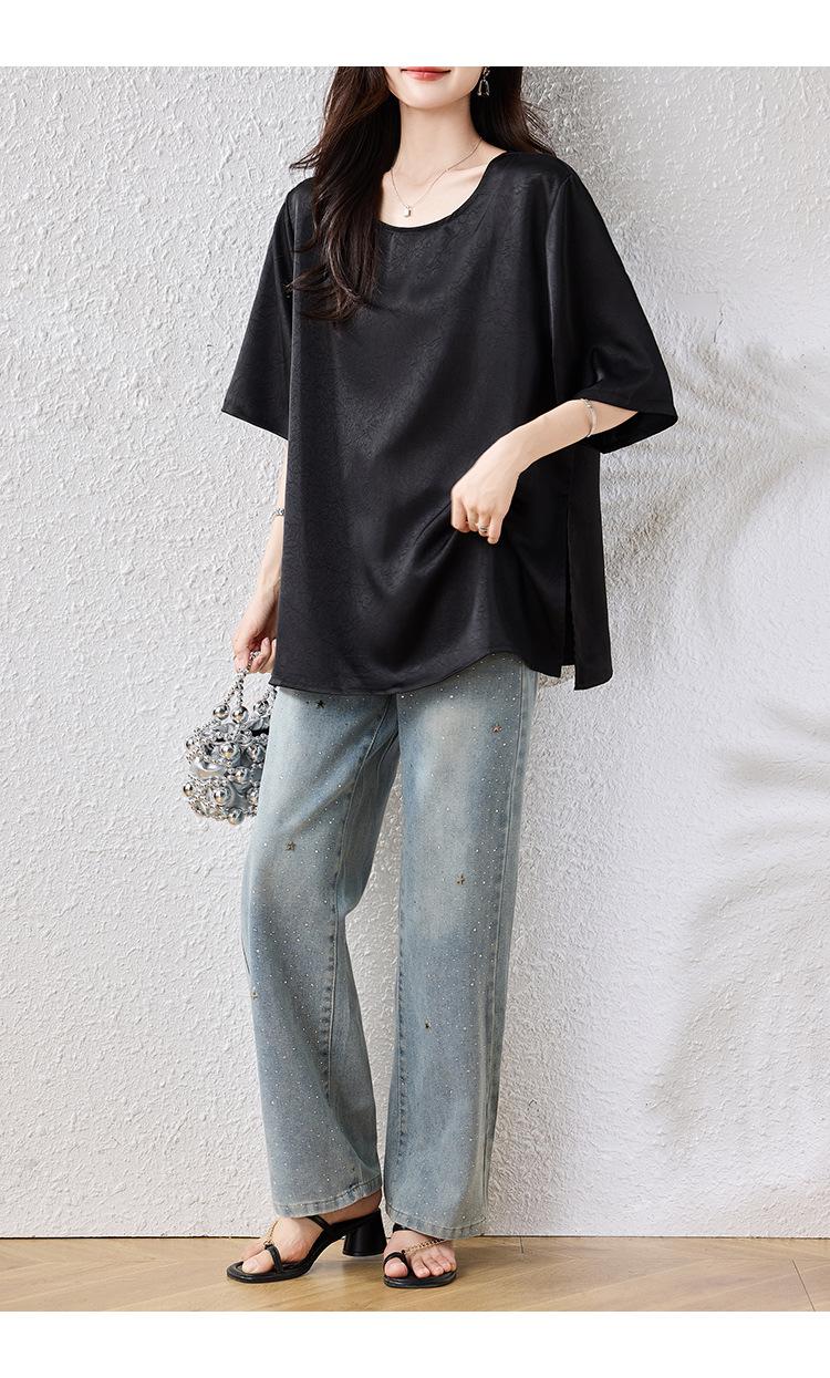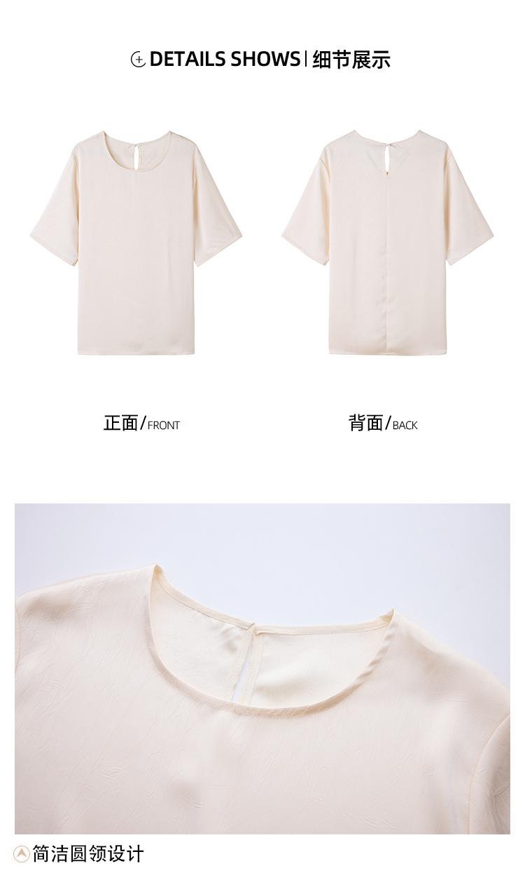 Foto Real de Camiseta Simple de Cuello Redondo y Manga Corta para Mujer Verano Nuevo Top de Satén de Acetato Holgado Adelgazante