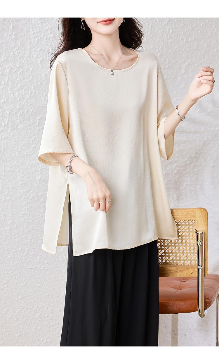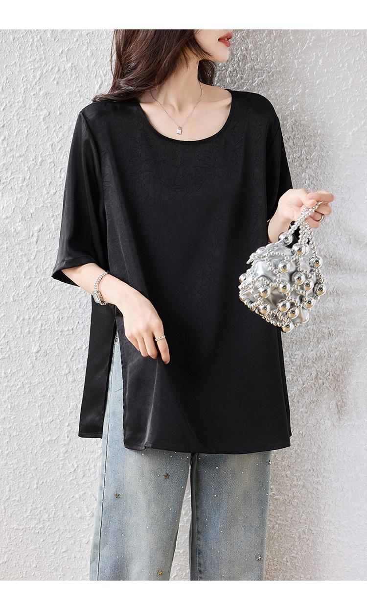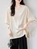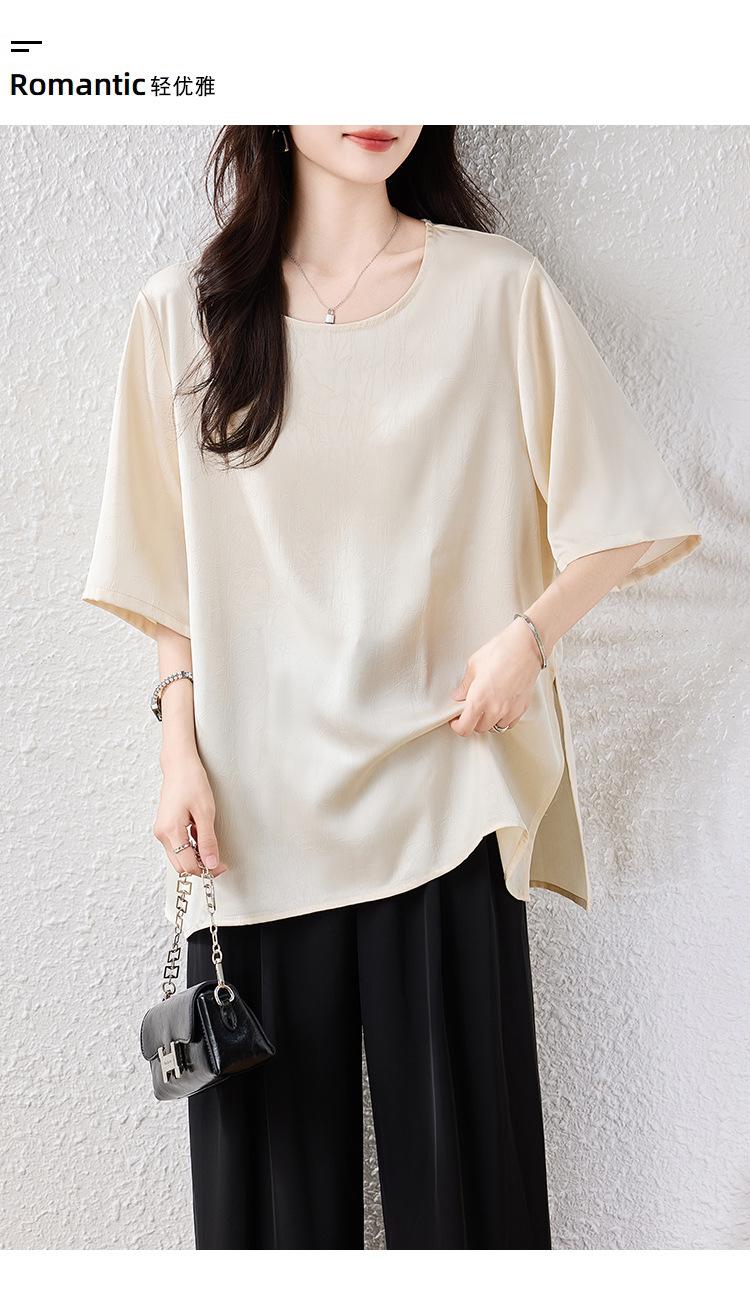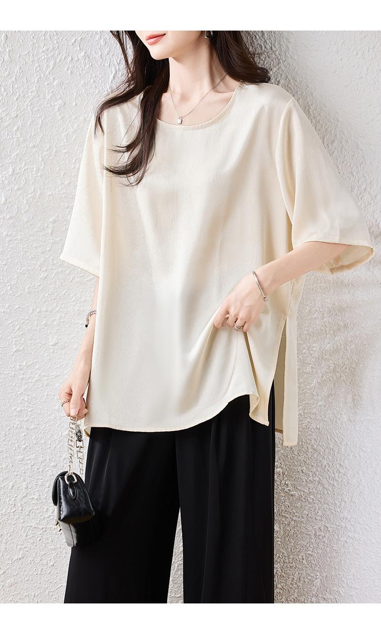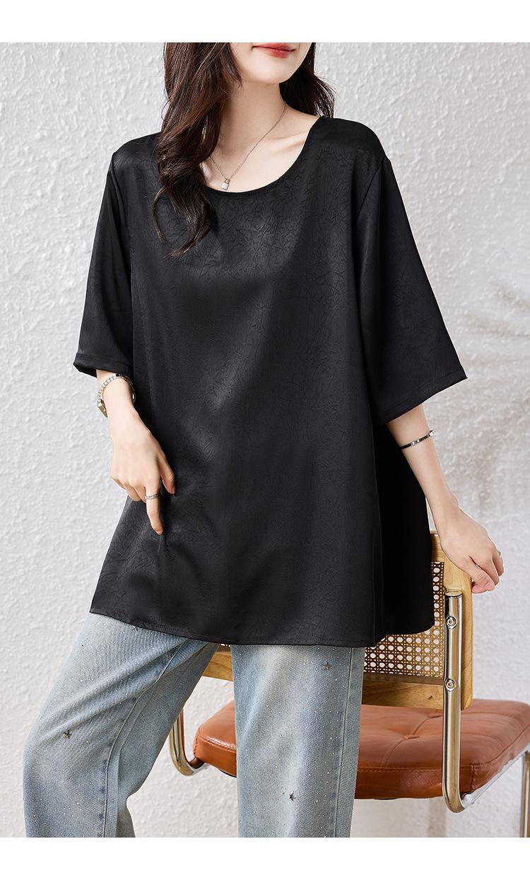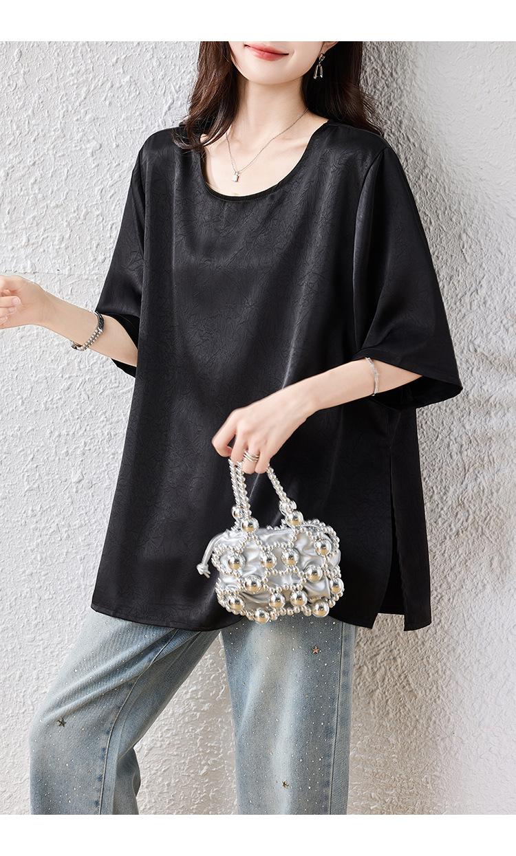 Foto Real de Camiseta Simple de Cuello Redondo y Manga Corta para Mujer Verano Nuevo Top de Satén de Acetato Holgado Adelgazante