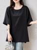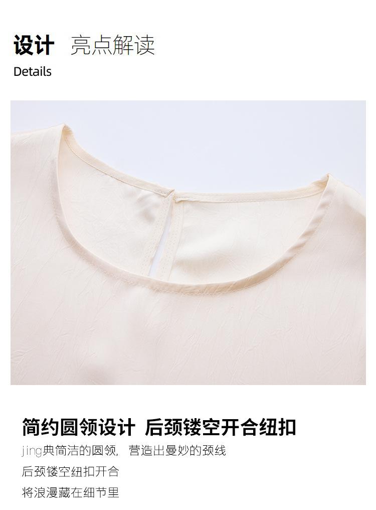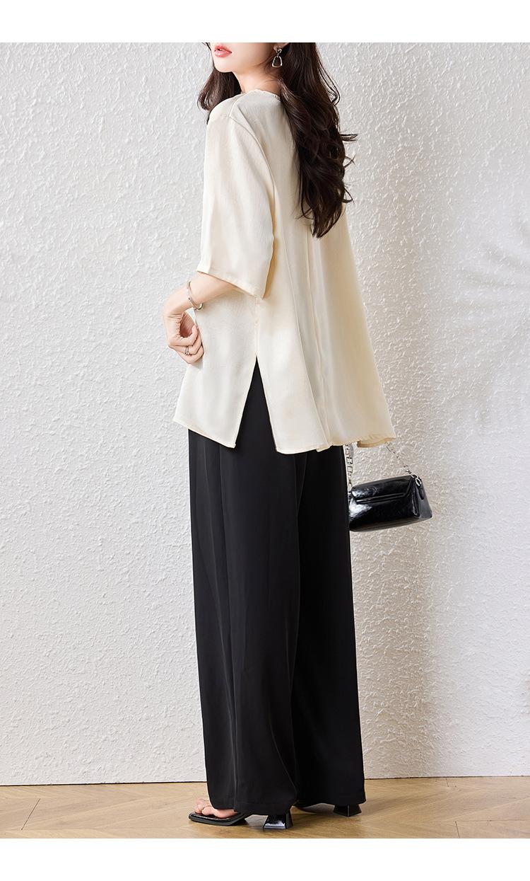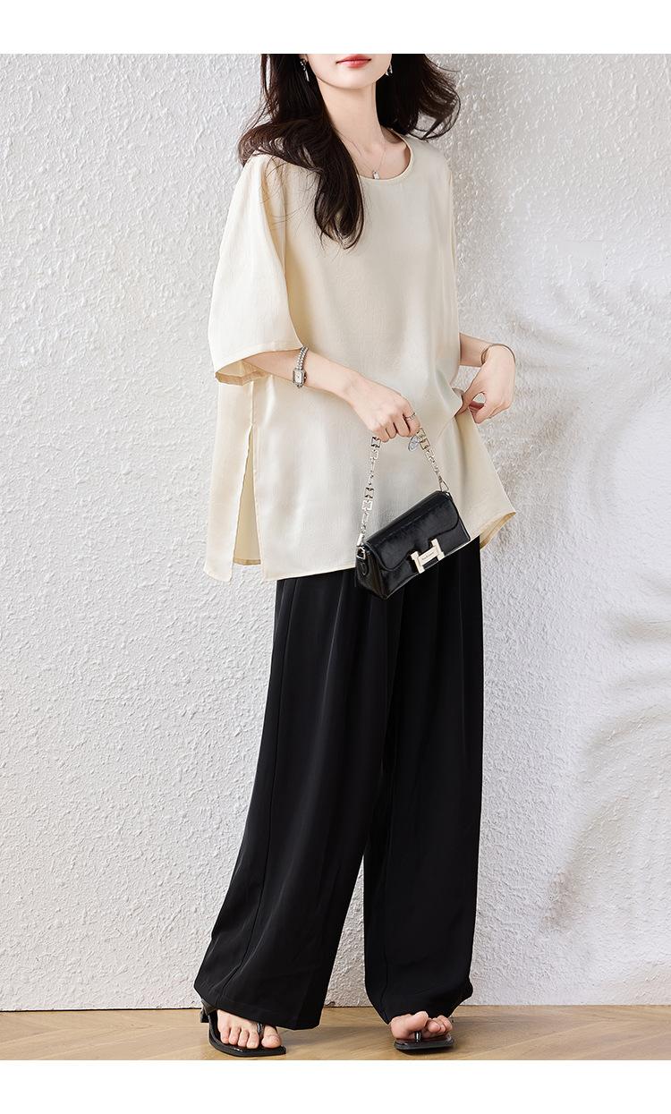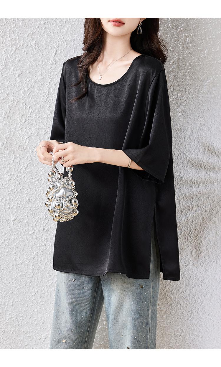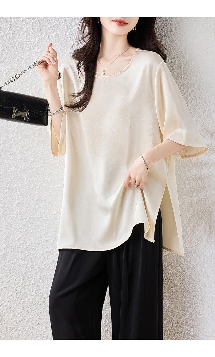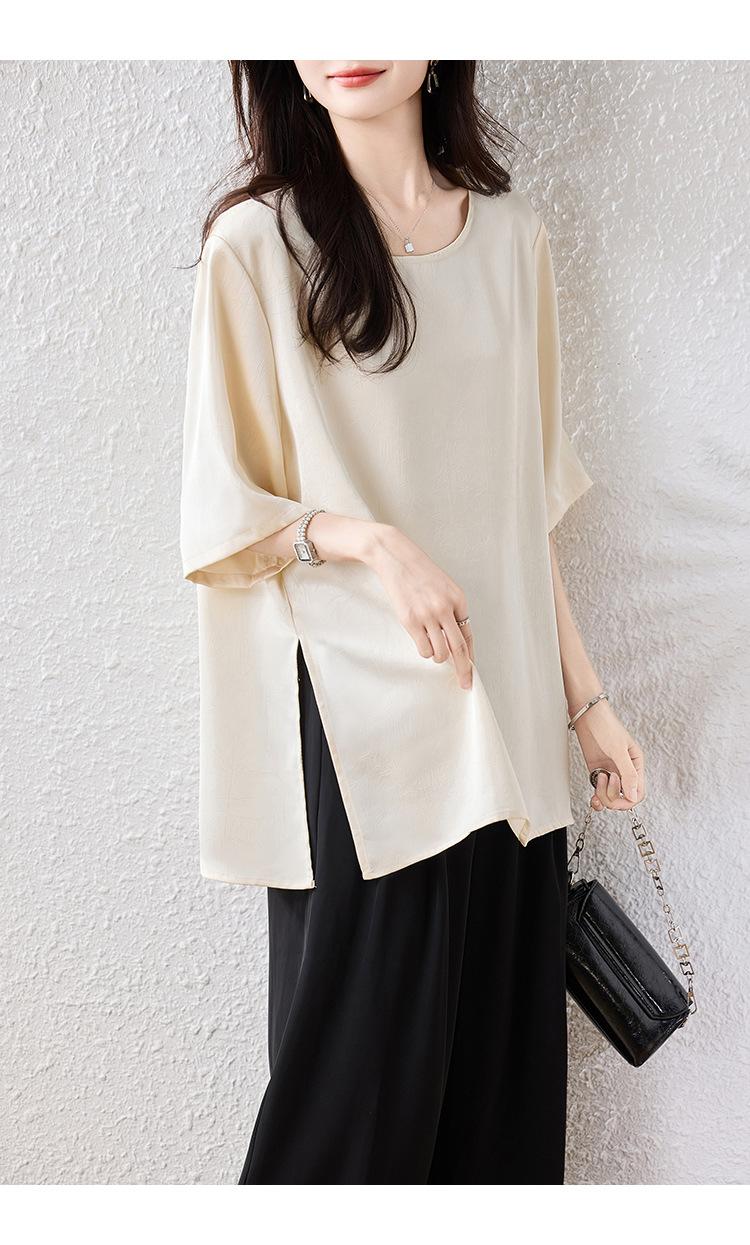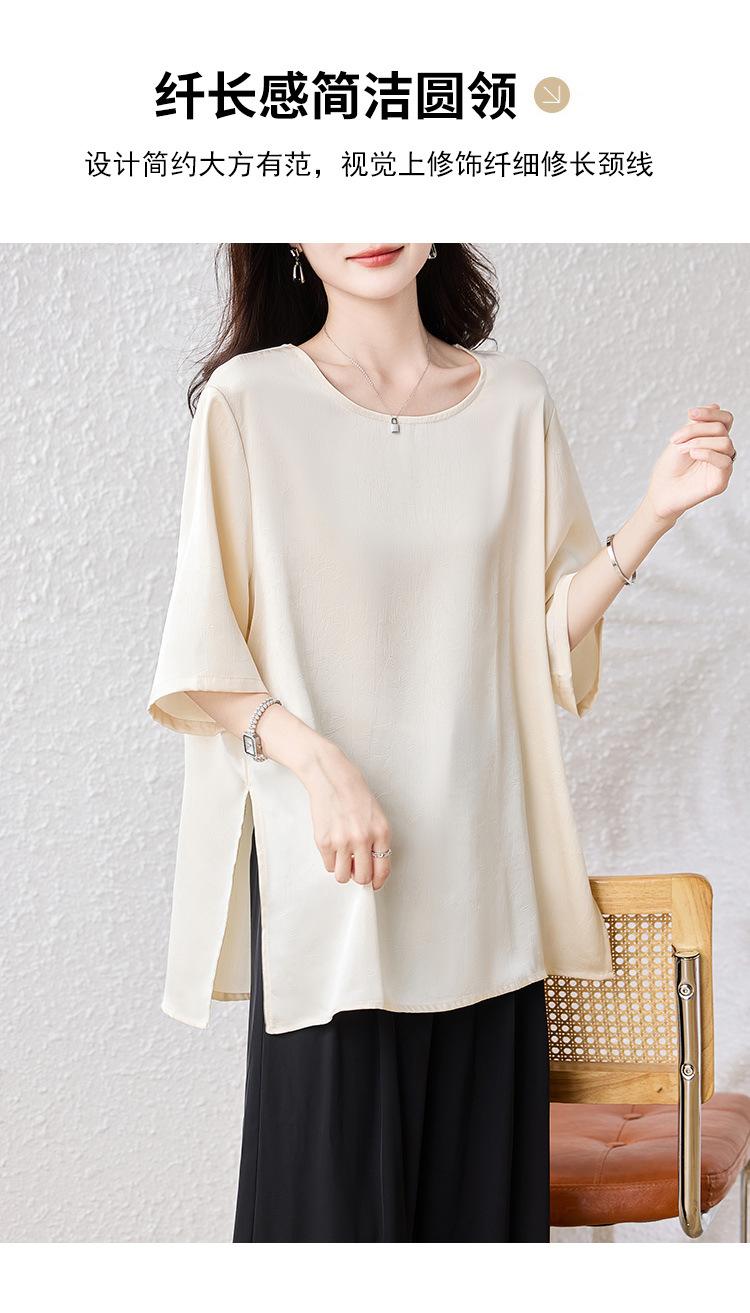 Foto Real de Camiseta Simple de Cuello Redondo y Manga Corta para Mujer Verano Nuevo Top de Satén de Acetato Holgado Adelgazante