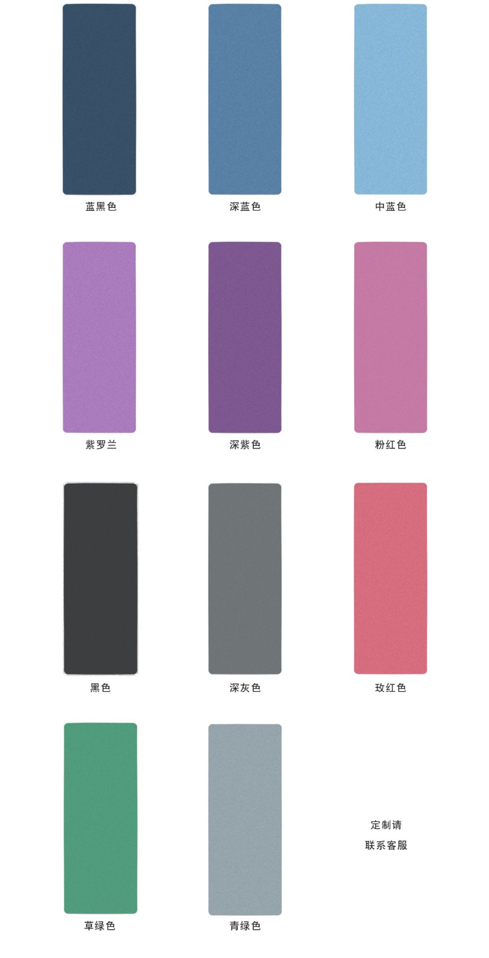 Mustard green, Green, Grass green, Dark green, Lake blue, Milk tea, Orange, Bean paste purple, Soft powder, Dark gray black