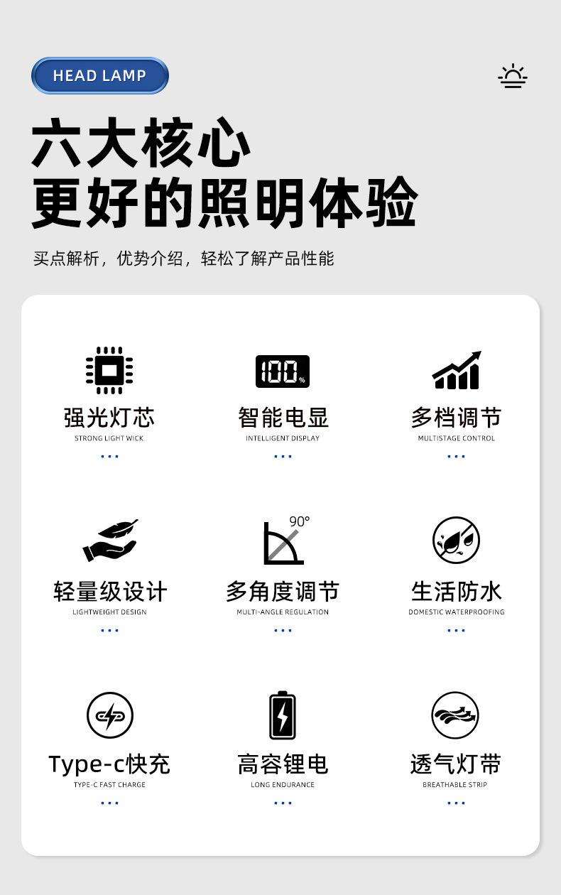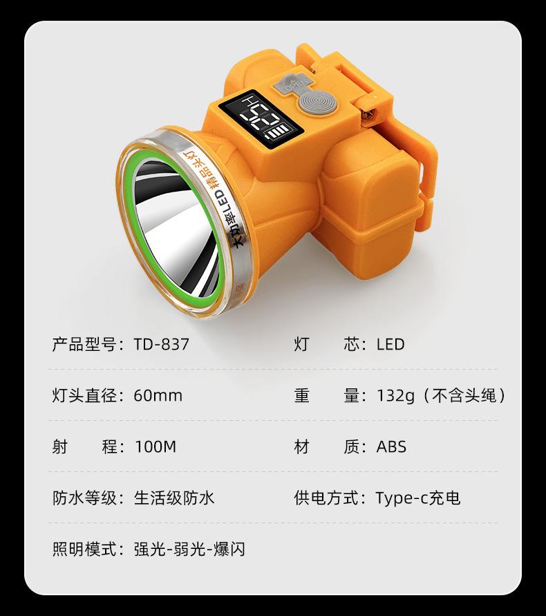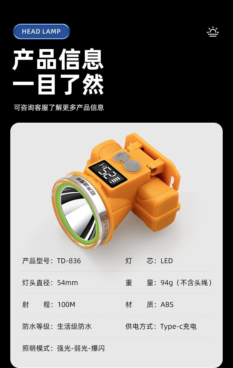 Td836 headlamp + headband + built-in 1800 mah lithium battery + charging cable + packaging box, Td837 headlamp...