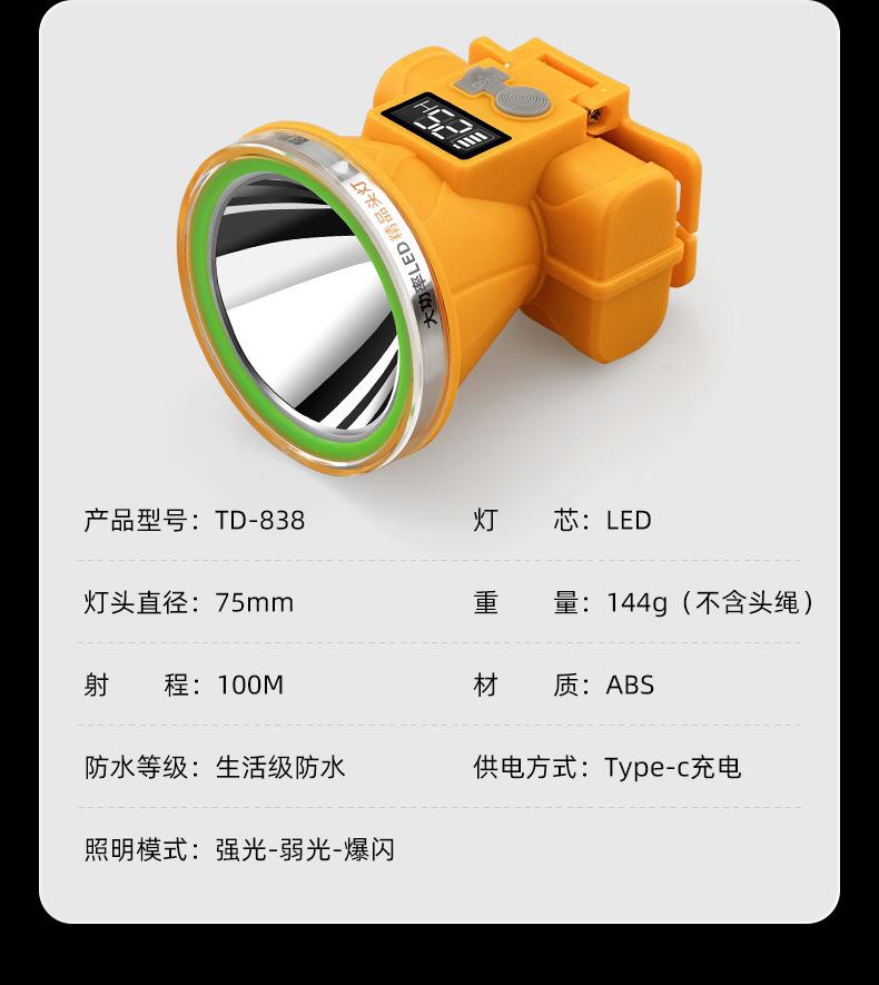 Td838 headlamp + headband + built-in 2400 mah lithium battery + charging cable + packaging box