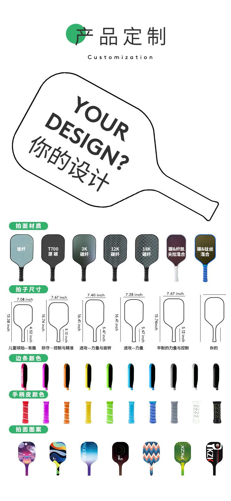 Diseño humanizado:Ofrecemos servicio de paletas de pickleball personalizadas. Desde los materiales hasta los diseños, todo se puede personalizar según tus necesidades. ¡Podemos crear tu propia paleta única y hacerte el centro de atención en la cancha!