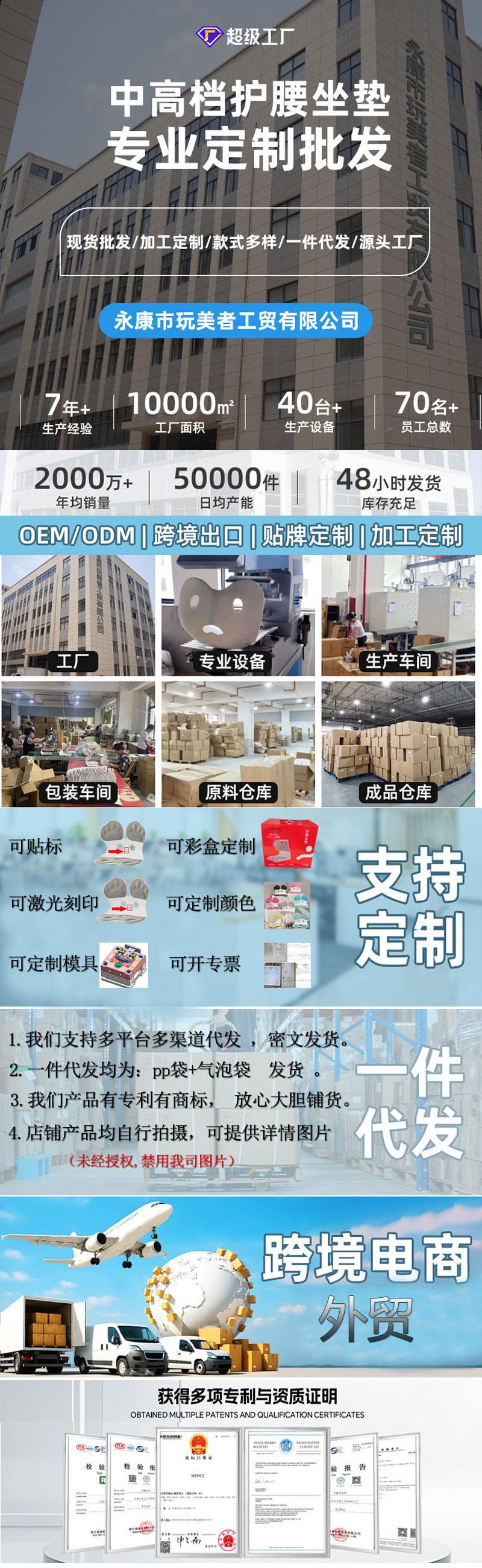 Yongkang Wanmeizhe Industry and Trade Co., Ltd. es una empresa moderna especializada en la investigación y desarrollo y producción de cojines de soporte lumbar. Integramos I+D, diseño, producción y ventas. Fundada en 2018, se encuentra en la ciudad de Yongkang, Jinhua, Zhejiang.