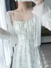 Vestido de Tirantes Estilo Lujuria Pura con Encaje Empalmado Estampado para Mujer Verano Estilo Francés Vacaciones Falda Larga Cárdigan Conjunto de Dos Piezas