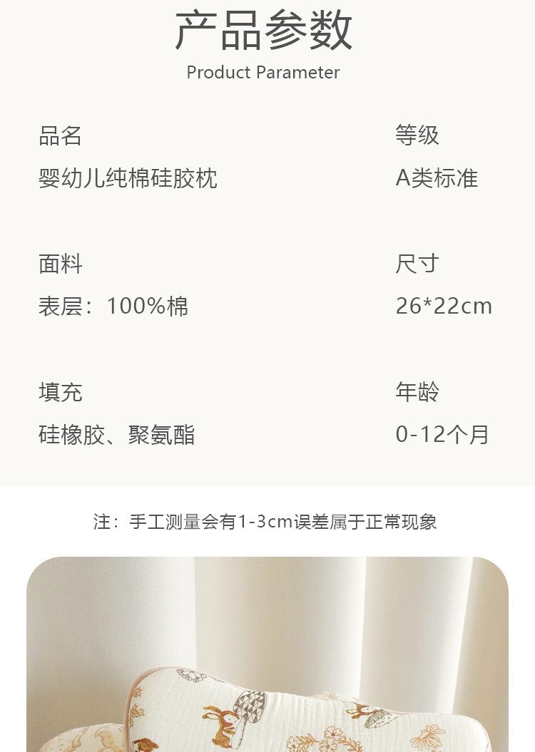 Material: Superficie 100% algodón Relleno interior 75% caucho de silicona + 25% poliuretano Tamaño: 26*22cm (adecuado para bebés de 0 a 12 meses) Consejos de lavado: Lavar a mano a 30°C, ciclo suave. Lavar a máquina en ciclo suave, no enjuagar, no hervir en agua a alta temperatura. Nota: La medición plana manual con error de 1-3 cm está dentro del rango normal哦~