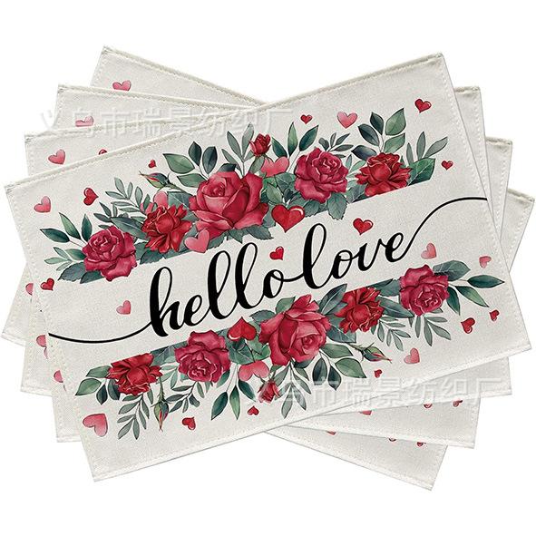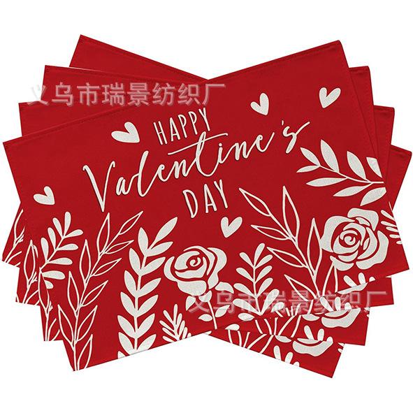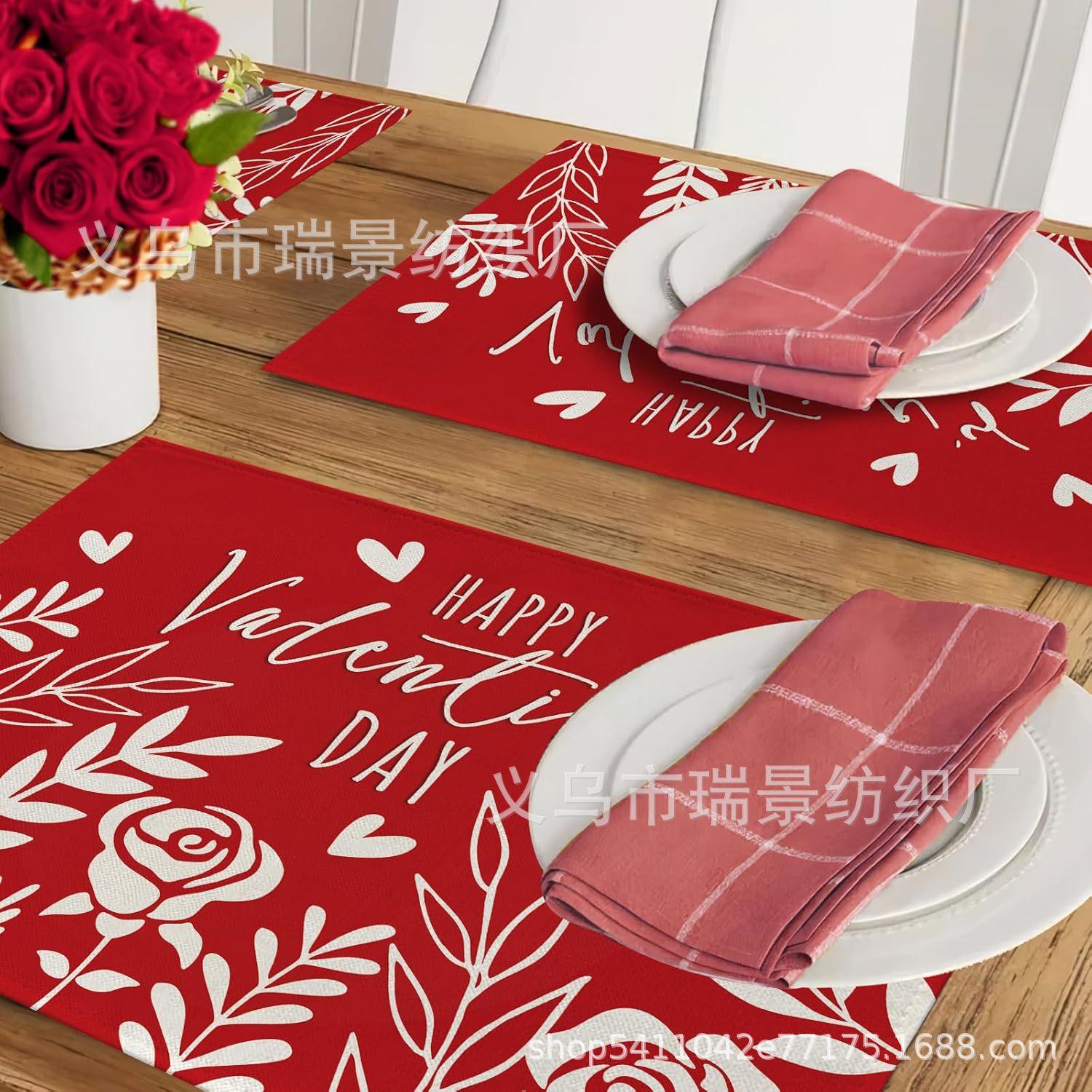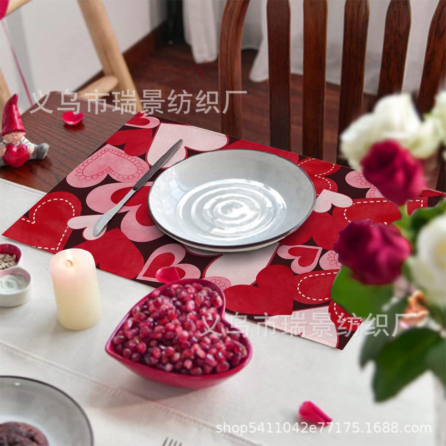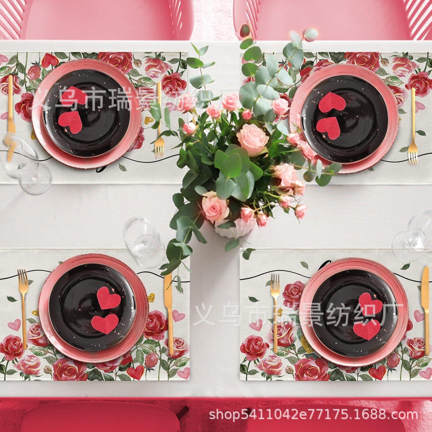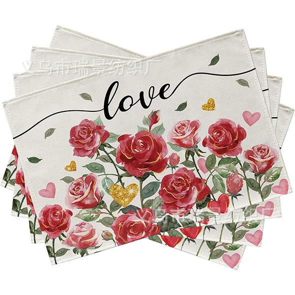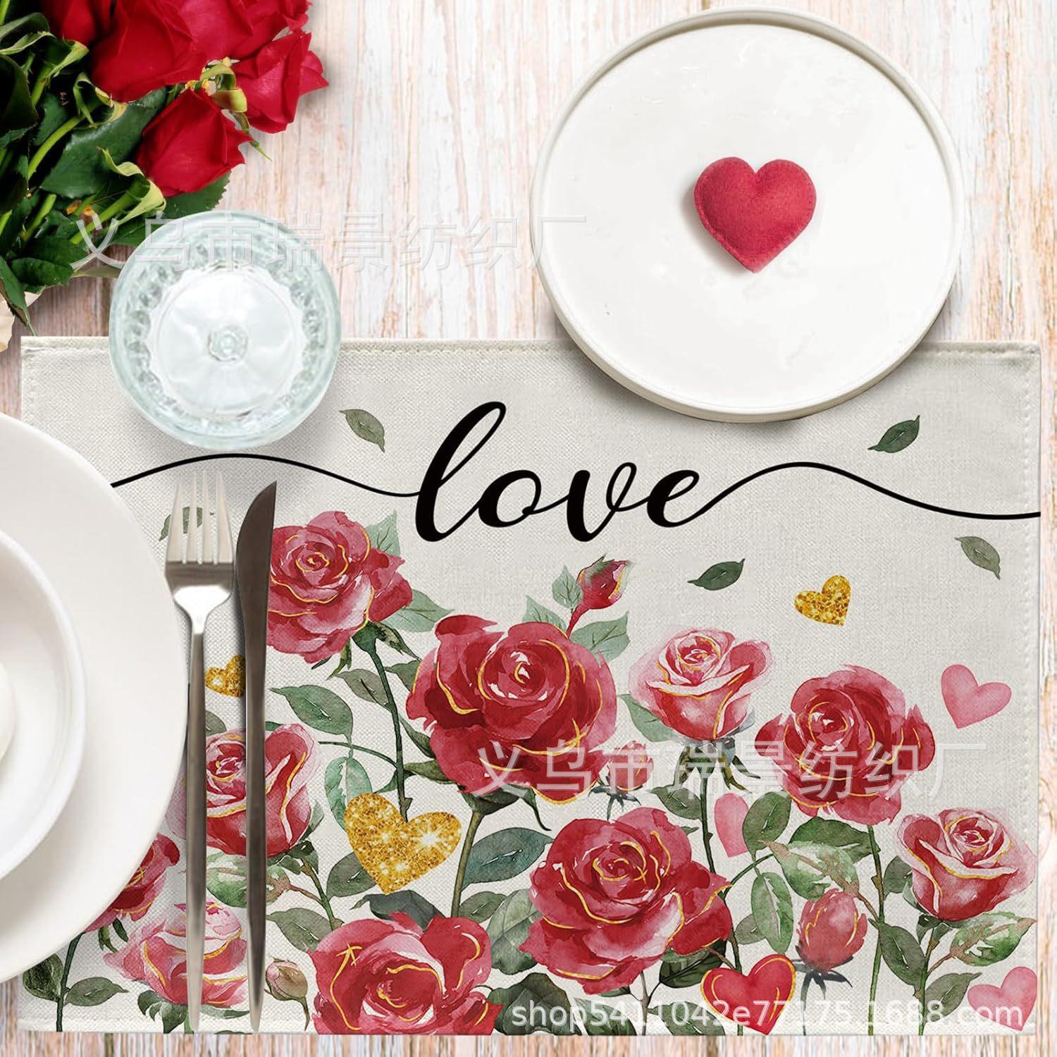 Mantel Individual de Venta Caliente Transfronterizo para el Día de San Valentín Rosa Roja Amor Decoración de Mesa de Comedor Mesa de Café Antimanchas Lino Mantel de Mesa