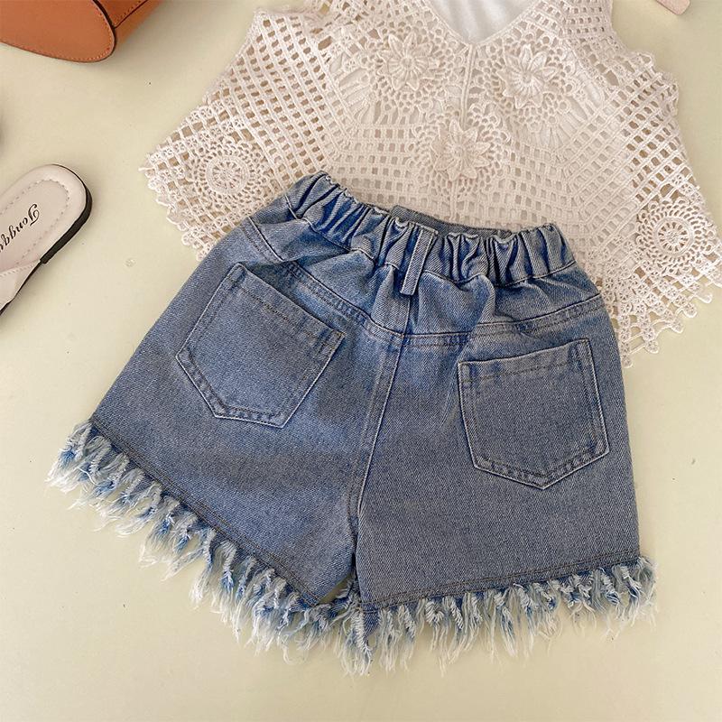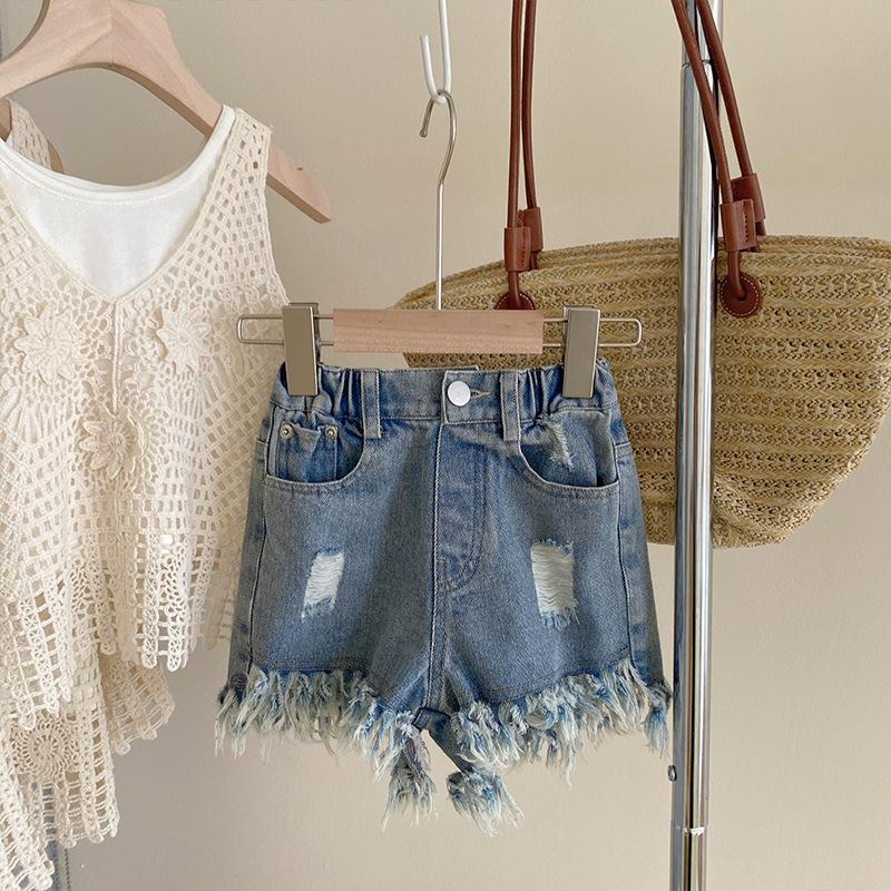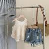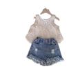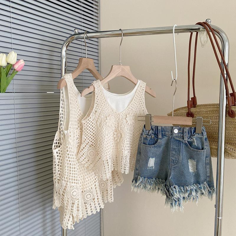 Traje para Niñas Verano 2025 Nuevo Ropa para Niños Blusa Tejida Calada para Niños Chaleco y Shorts de Mezclilla Conjunto de Tres Piezas