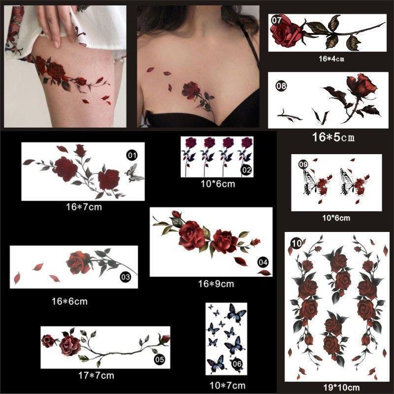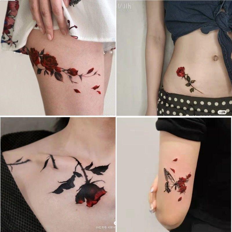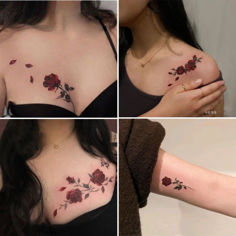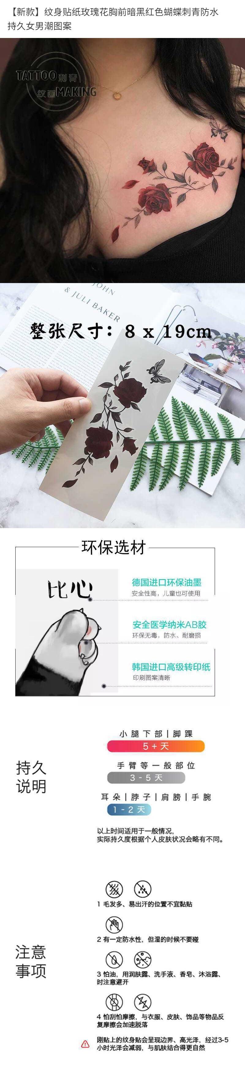 Tatuaje adhesivo de rosa en el pecho, mariposa roja oscura, resistente al agua, duradero y moderno, para mujeres y hombres.