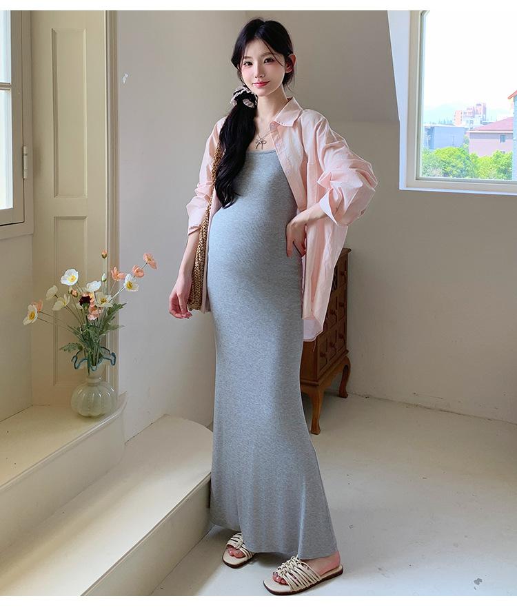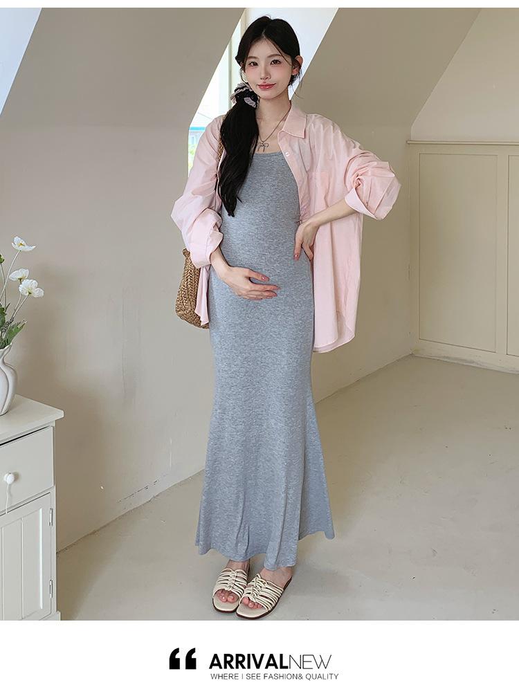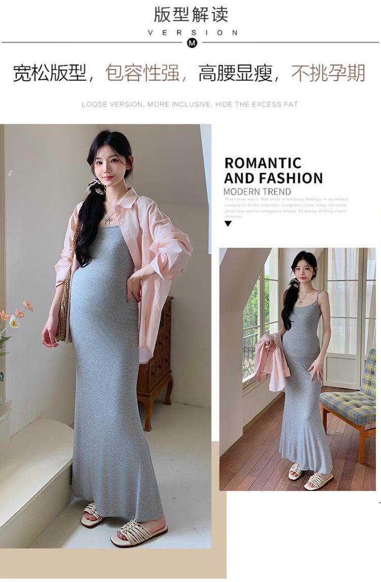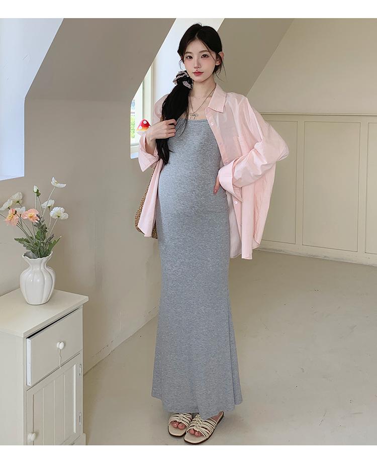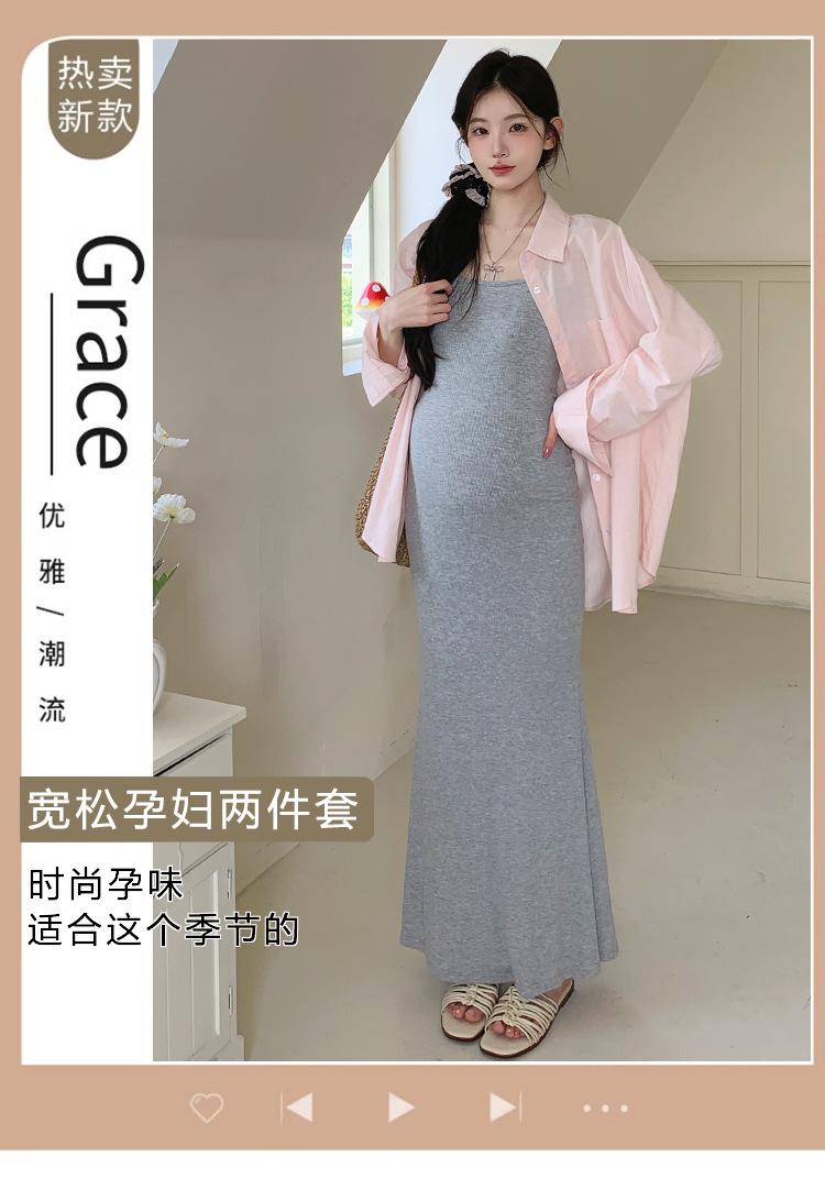 Ropa de Maternidad 2025 Nuevo Verano Algodón y Lino Camisa Rosa + Falda de Tirantes Estilo Holgazán Vestido de Maternidad de Dos Piezas