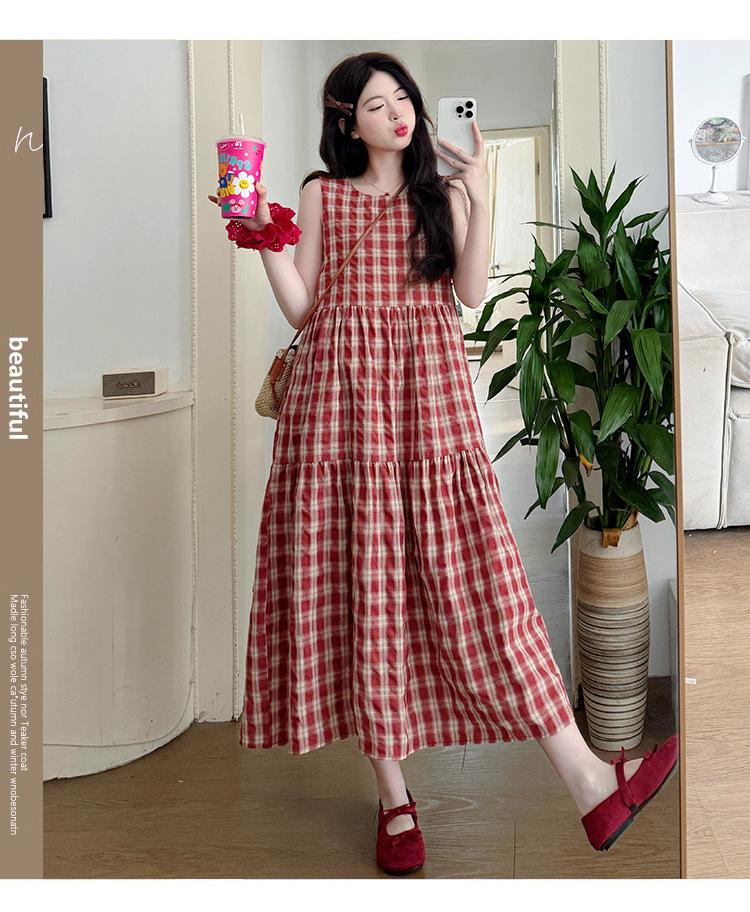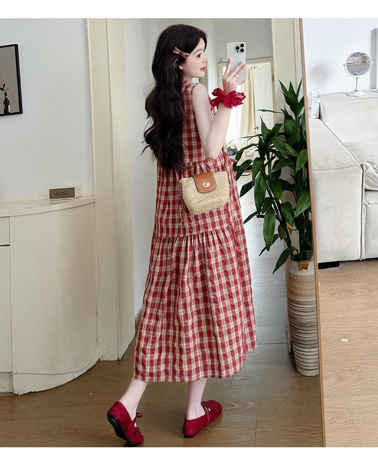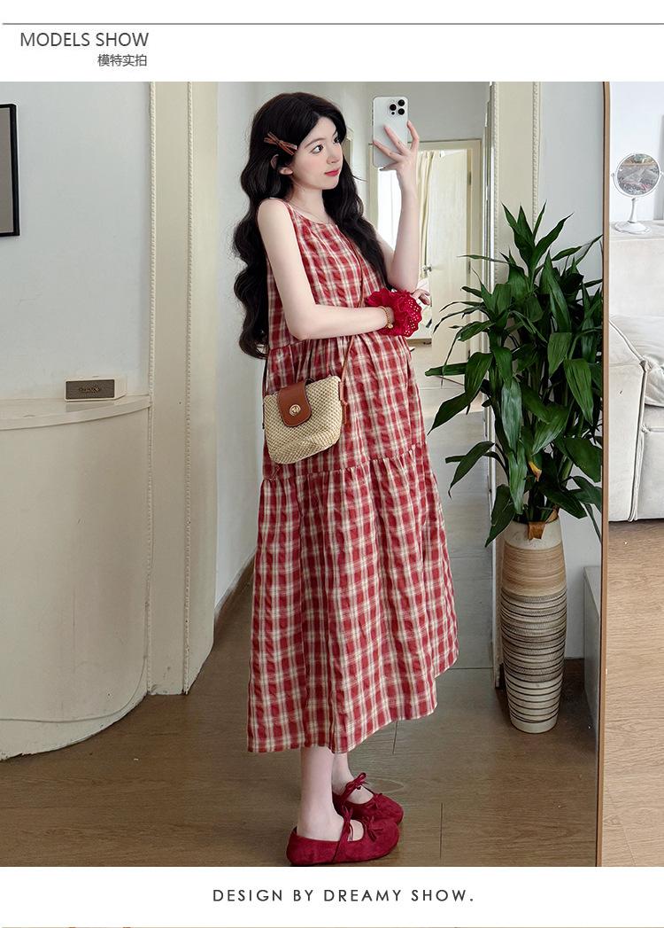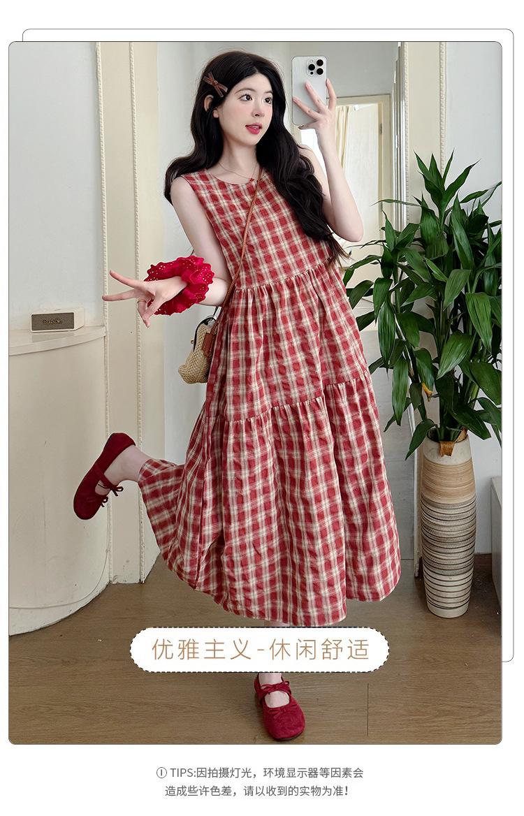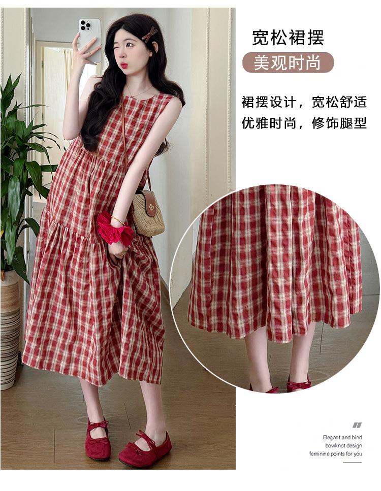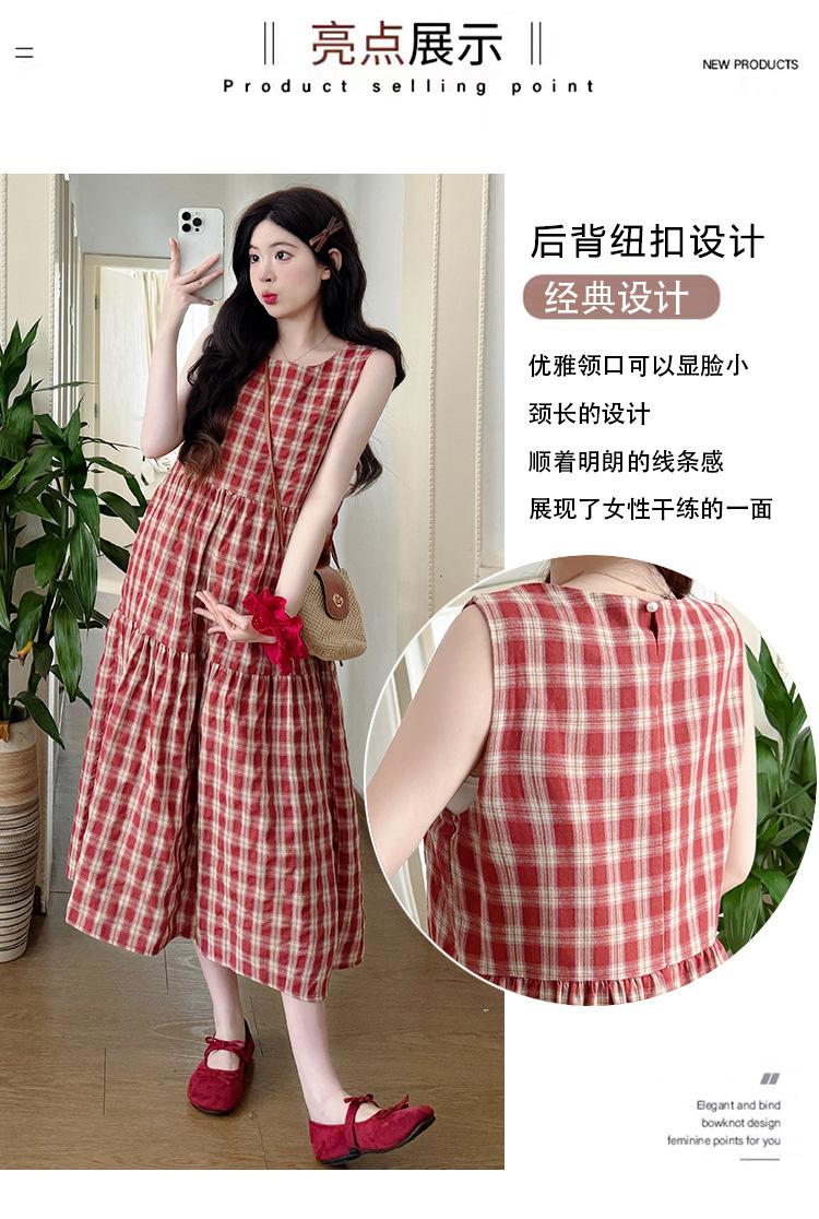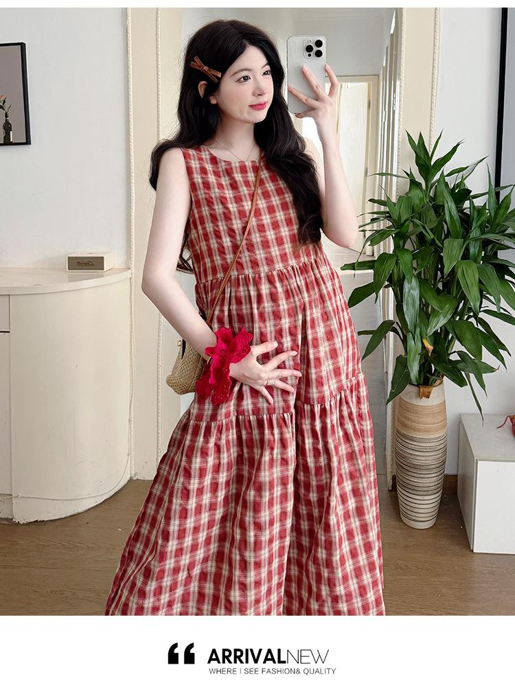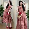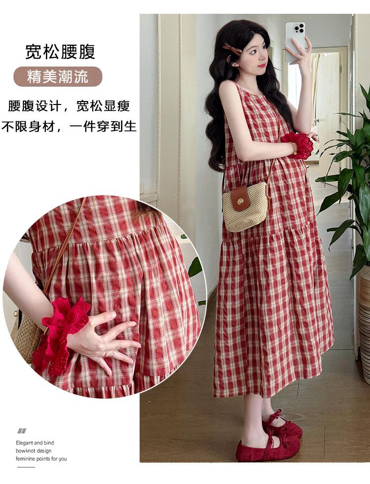 Maternidad 2025 Verano Nuevo Moda Coreana Suelto Cuello Redondo Sencillo Estilo Occidental Lindo Cuadros Vestido para Mujeres Embarazadas