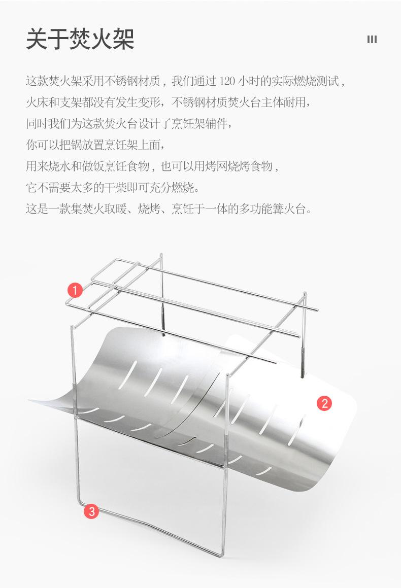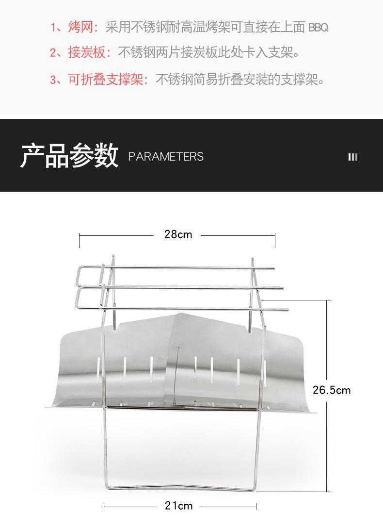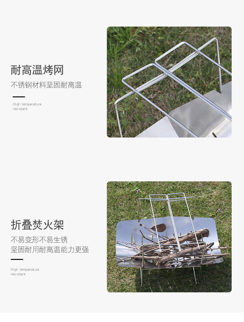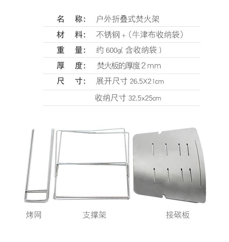 Material: Parrilla de cocción acero inoxidable 304 Soporte acero inoxidable 201 Bandeja recogecenizas acero inoxidable 430 Bolsa de almacenamiento tela Oxford