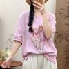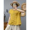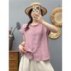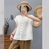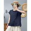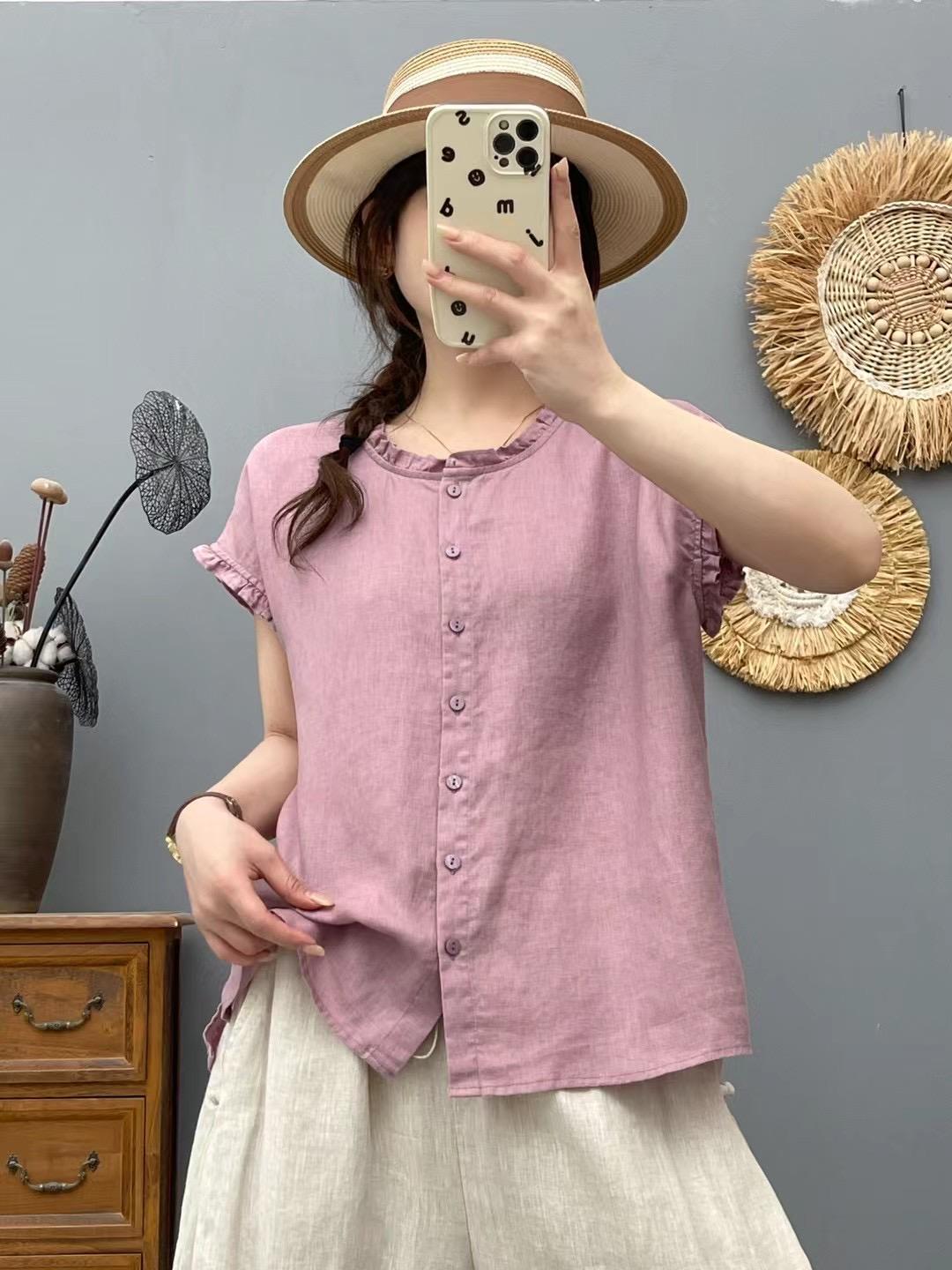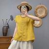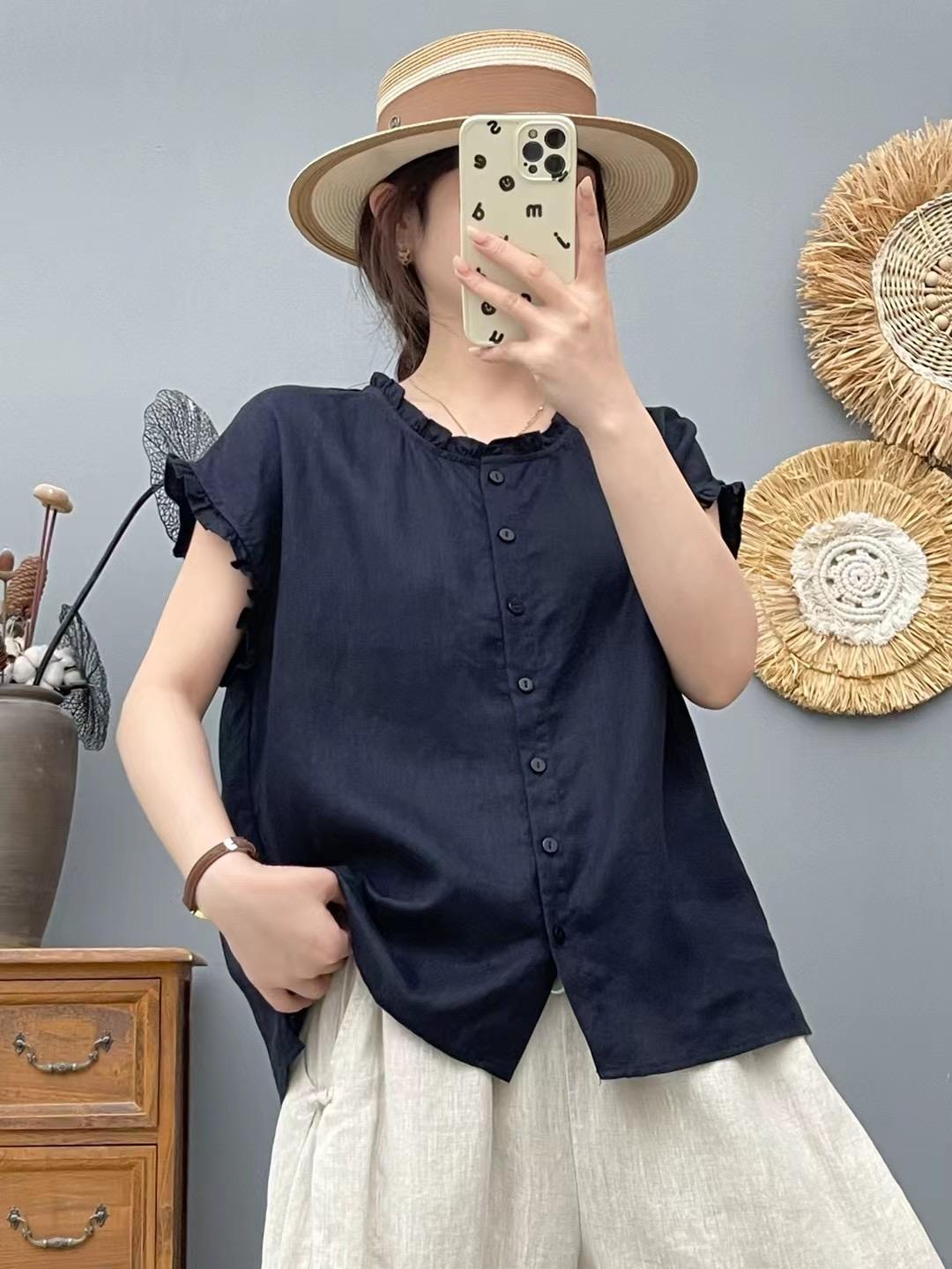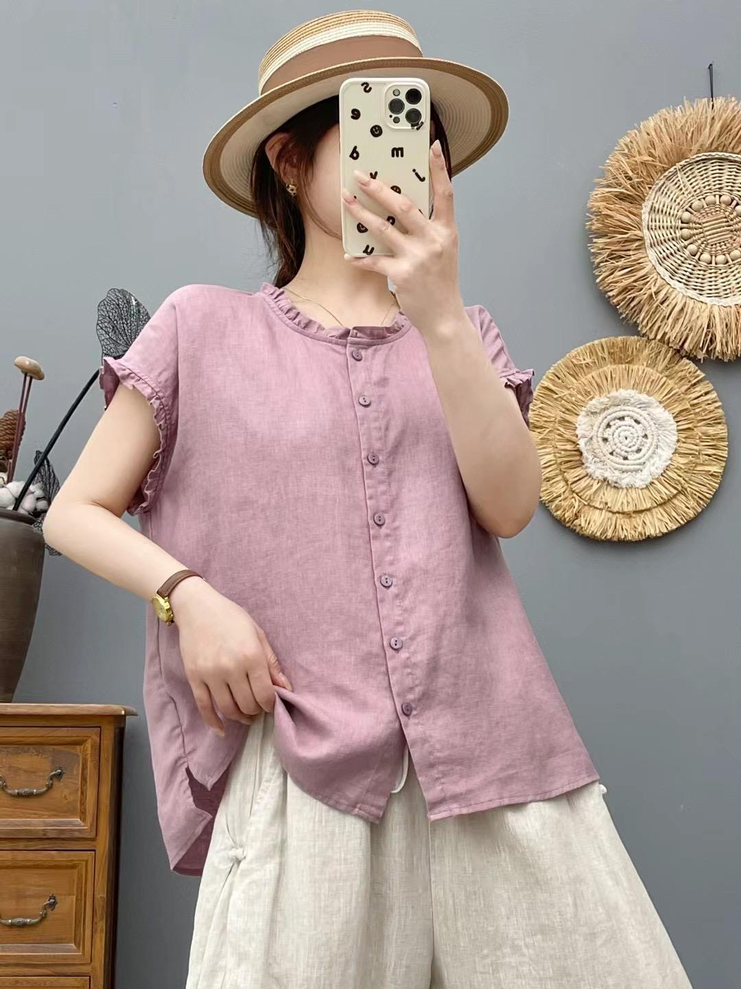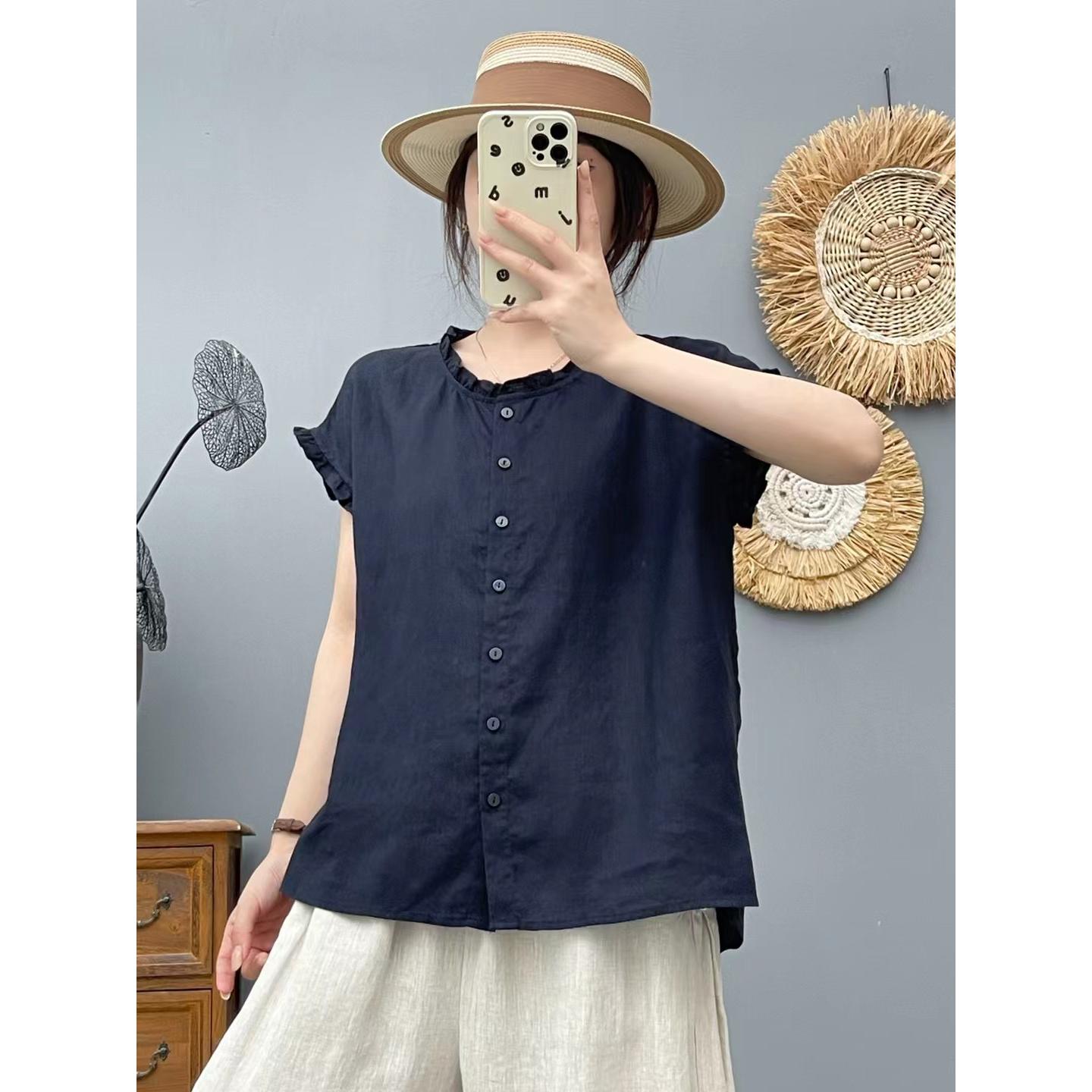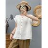 Blusas de Lino Artísticas Finas de Verano para Mujer, Camisas Holgadas Adelgazantes de Cuello Redondo y Manga Corta, Camisetas Casuales sin Mangas con Cuello de Encaje