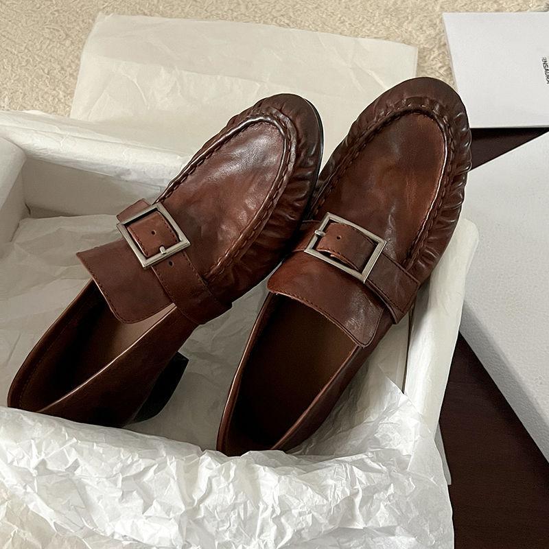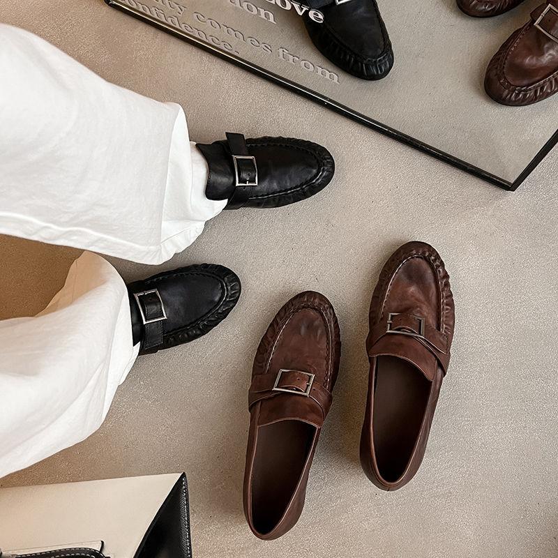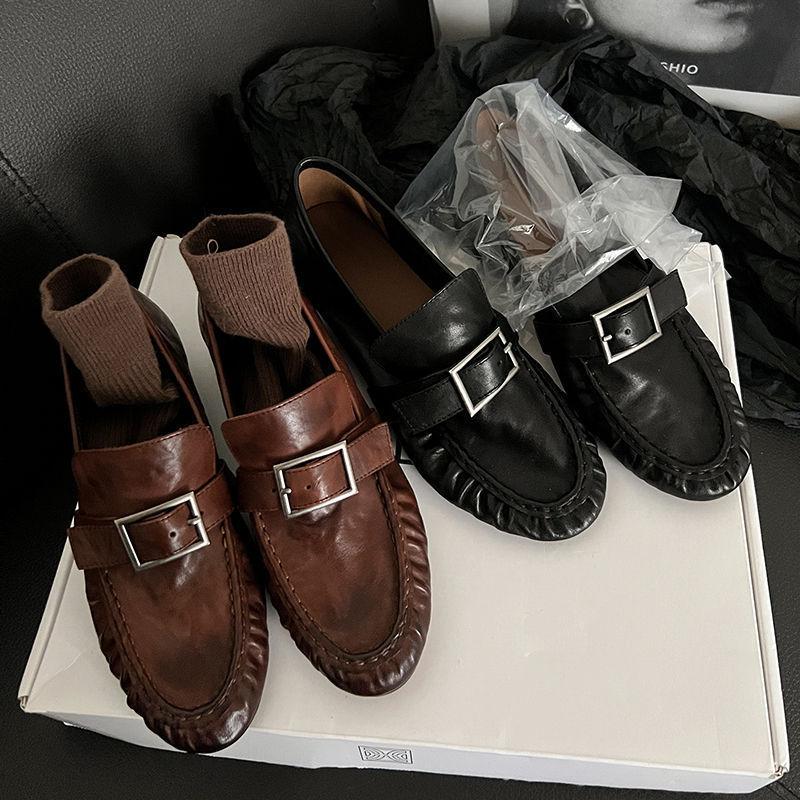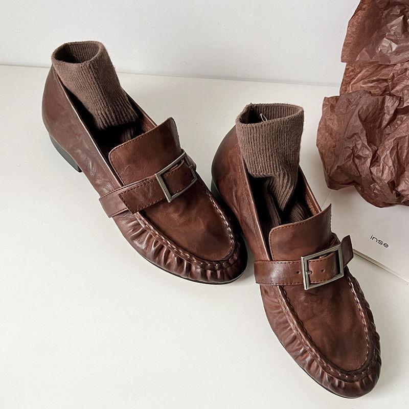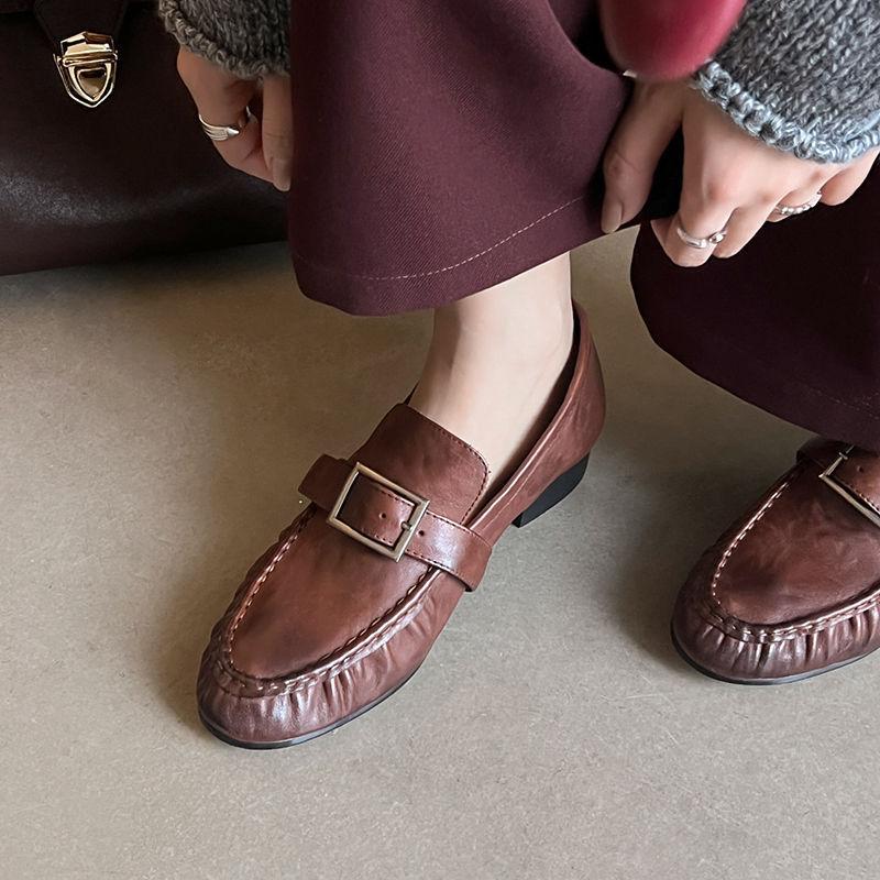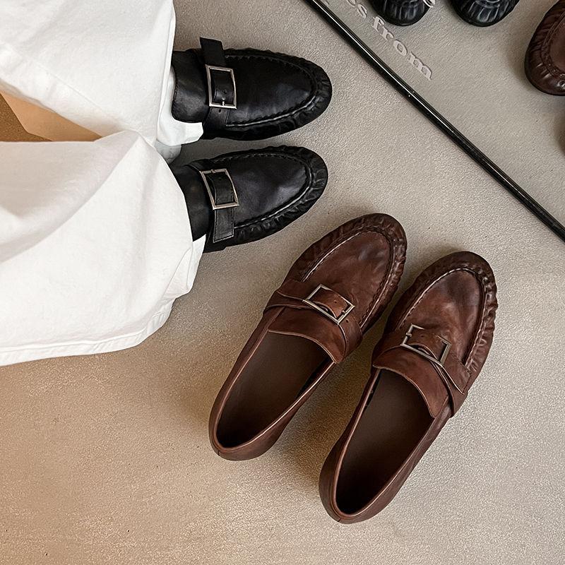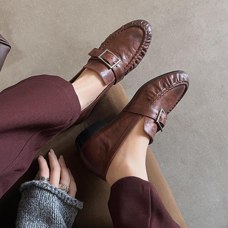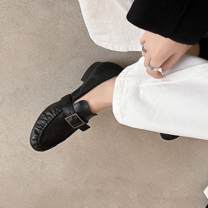 Zapatos de Moda Casual de Piel de Vaca Suave Zapatos de Moda Suela de Tendón Antideslizante Zapatos de Cuero Pequeños para Mujer Tacón Bajo Talla Grande Zapatos de Cuero Genuino para Mujer