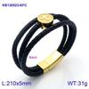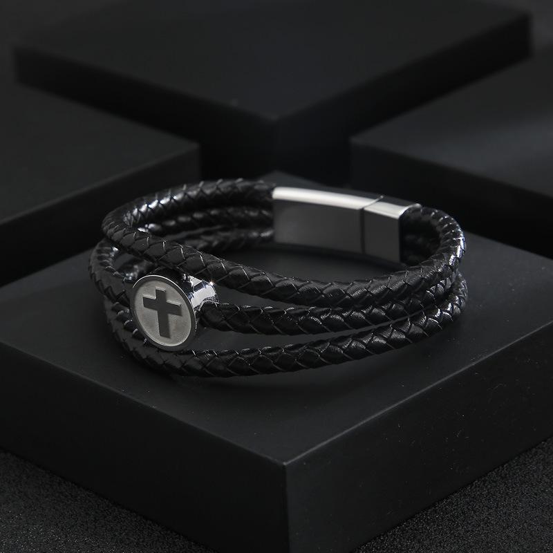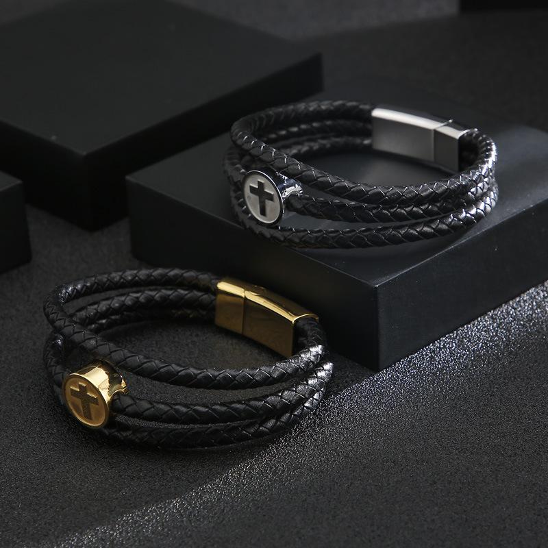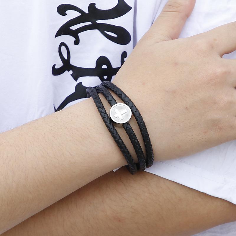 Pulsera cruzada tejida de cuerda de cuero de tres capas, de venta transfronteriza, pulsera de cuero de acero inoxidable para hombre que combina con todo.