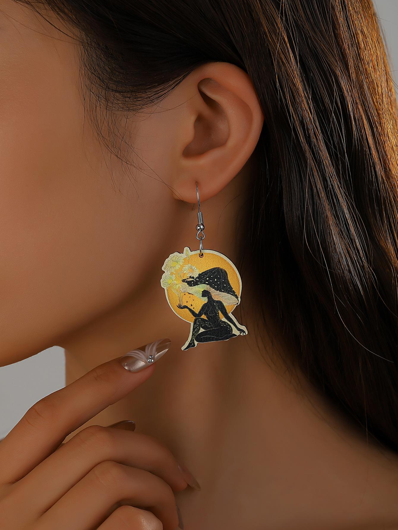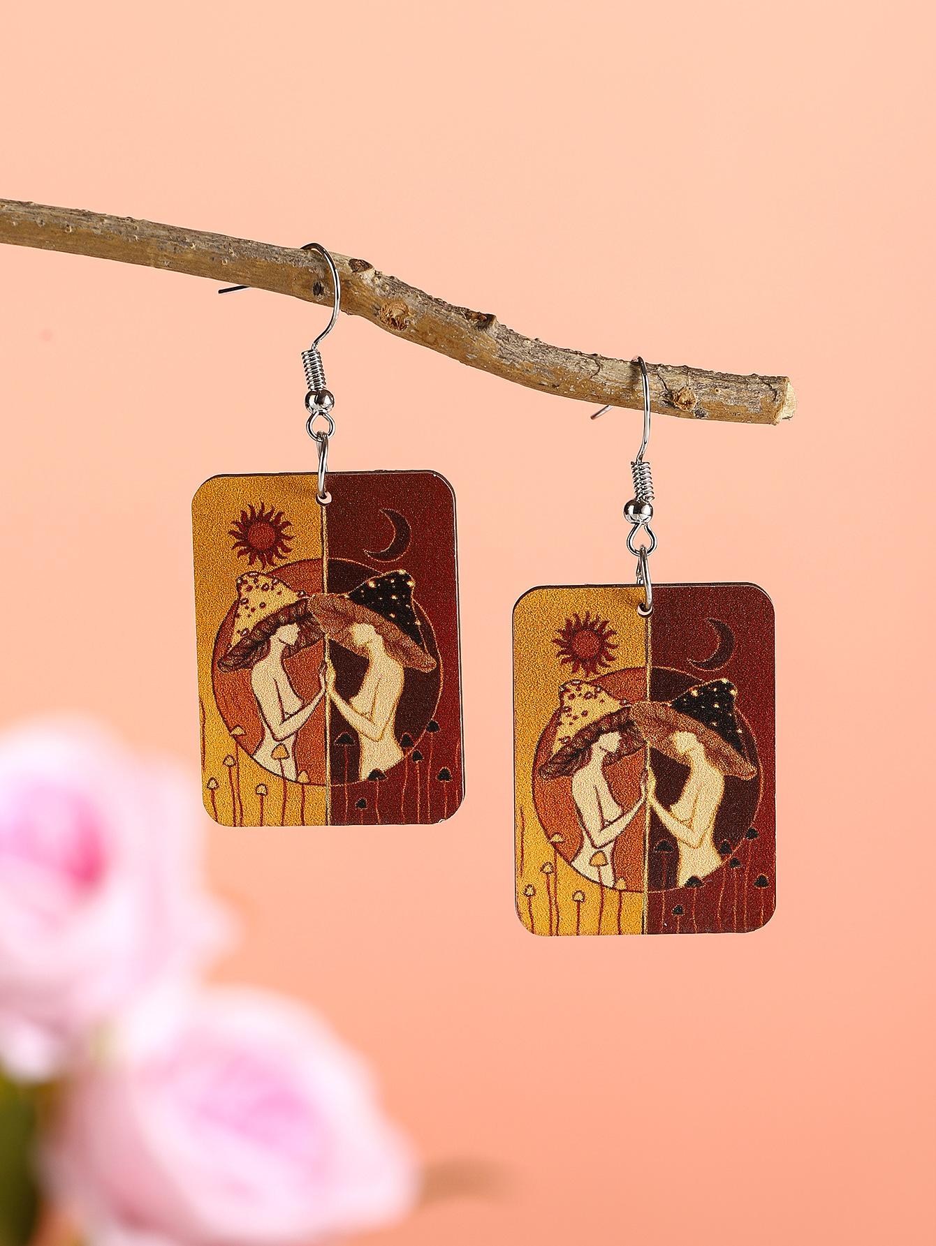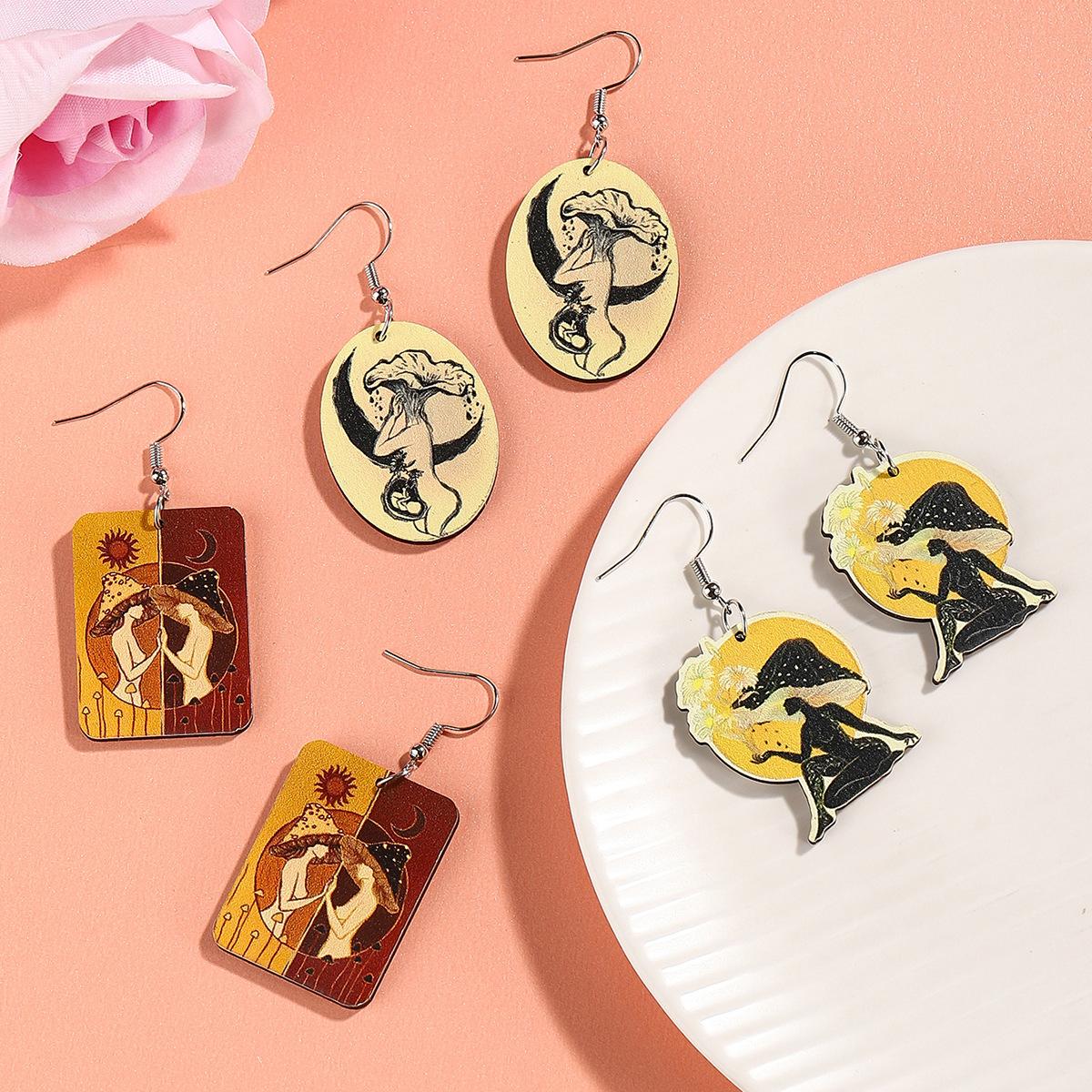 Aretes de madera creativos retro europeos y americanos para el día de la madre, aretes de retrato con impresión a color, aretes geométricos de temperamento y personalidad, aretes modernos