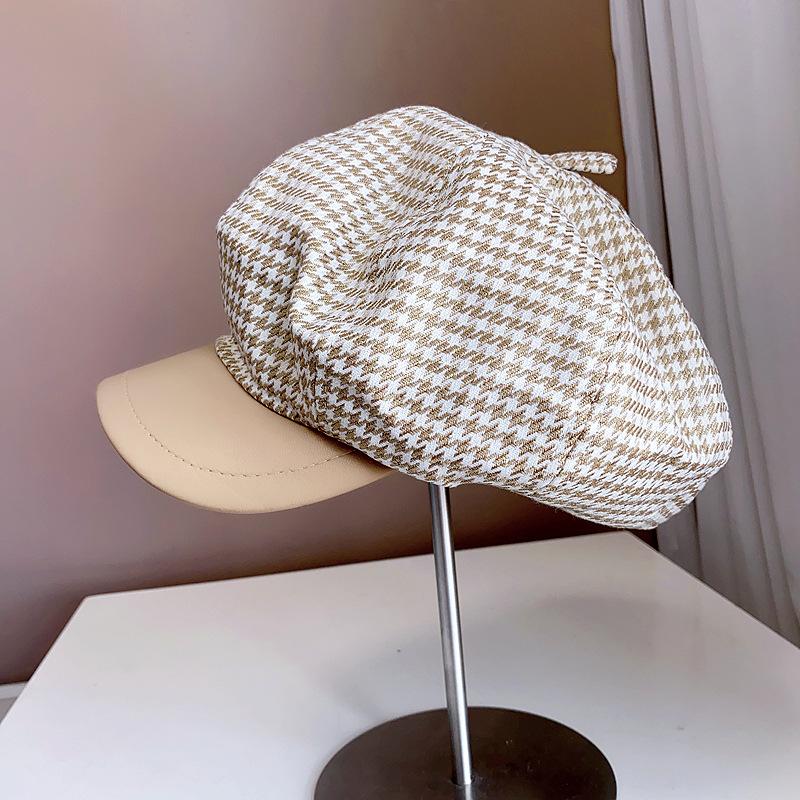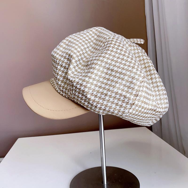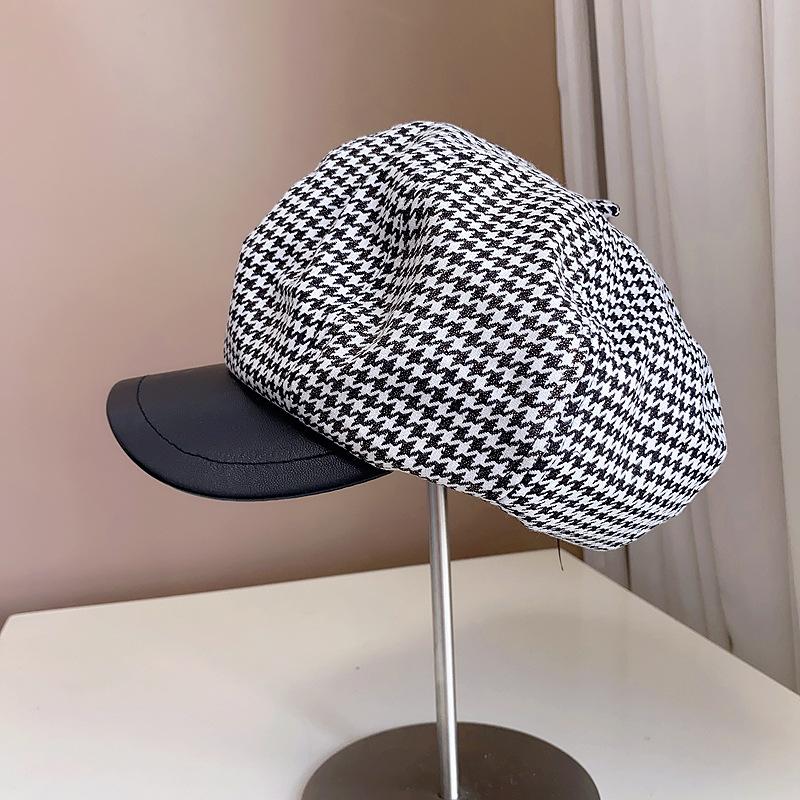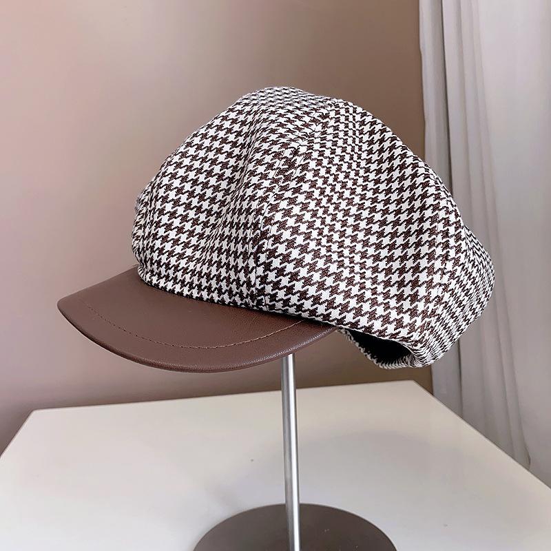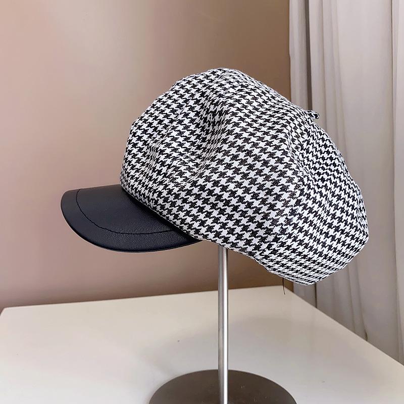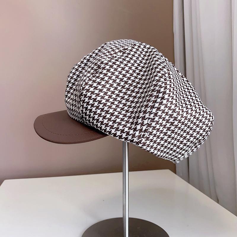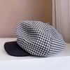 Sombrero octogonal de moda con diseño de pata de gallo y ala de cuero cosido para mujer, gorra informal combinable de otoño, sombrero de vendedor de periódicos de ala corta