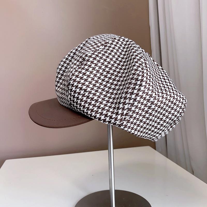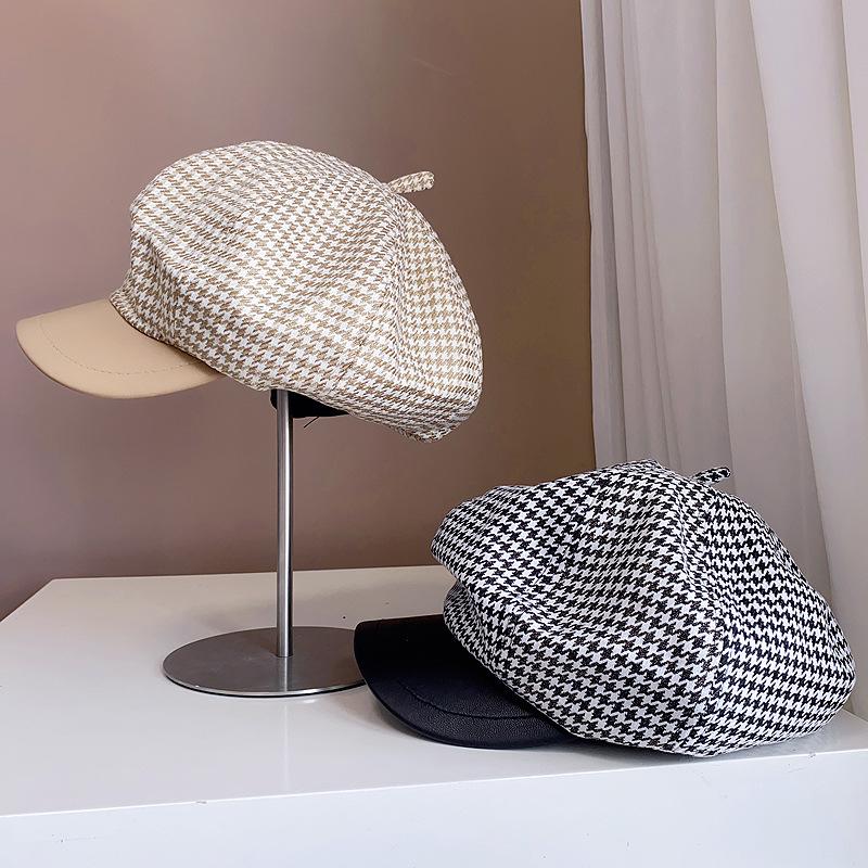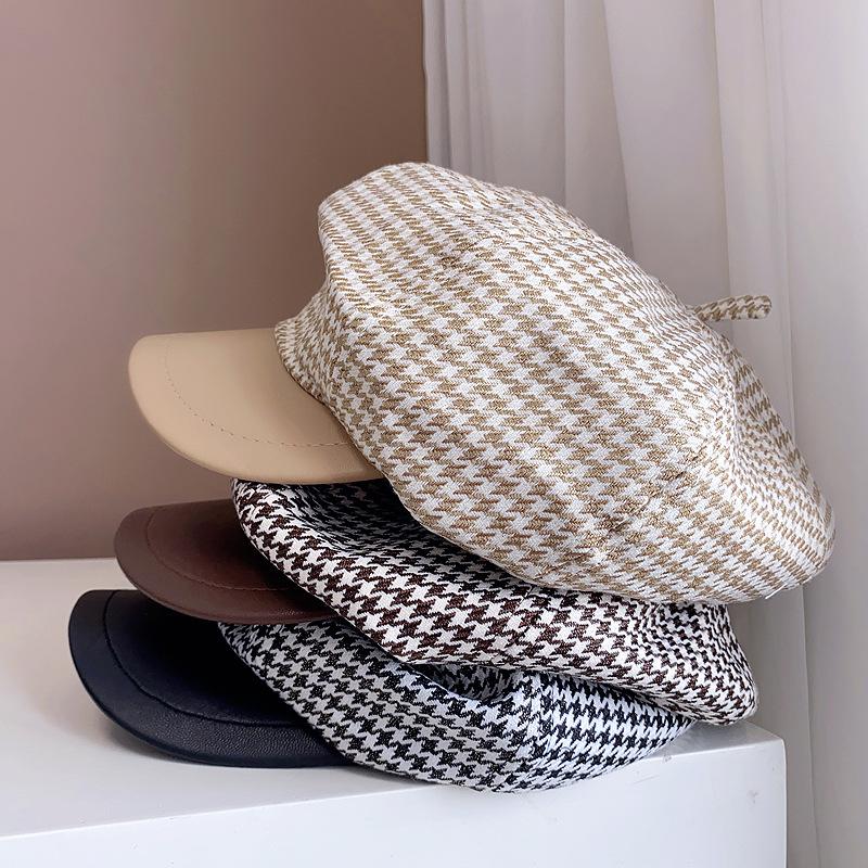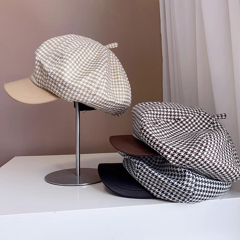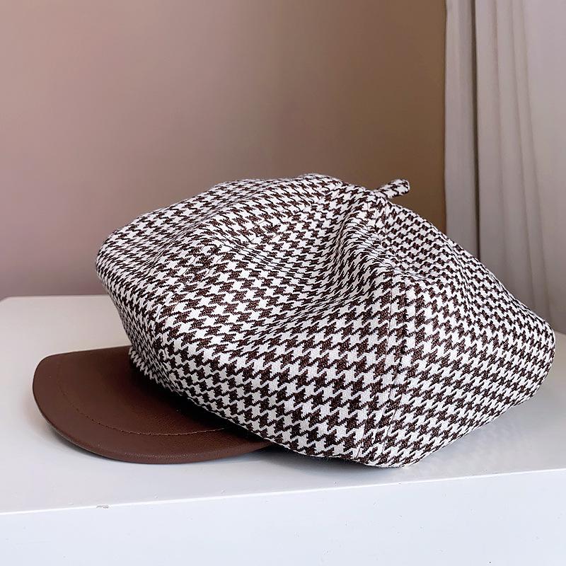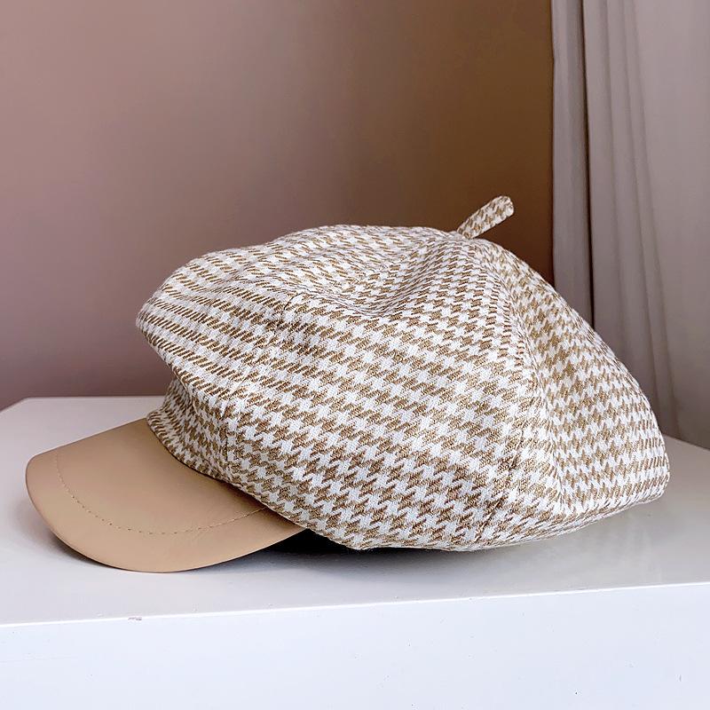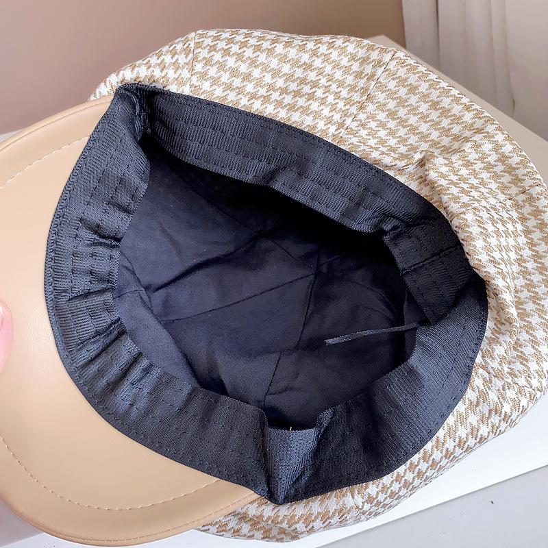 Sombrero octogonal de moda con diseño de pata de gallo y ala de cuero cosido para mujer, gorra informal combinable de otoño, sombrero de vendedor de periódicos de ala corta
