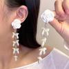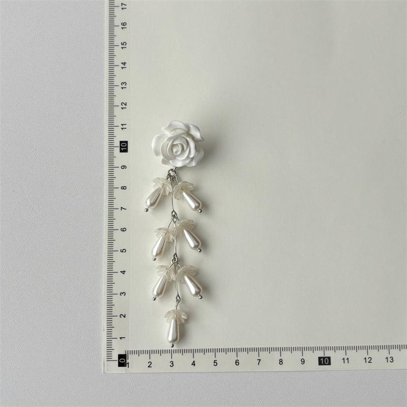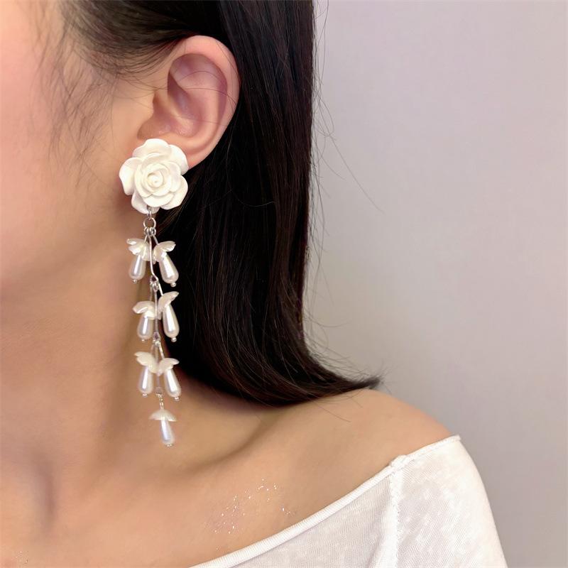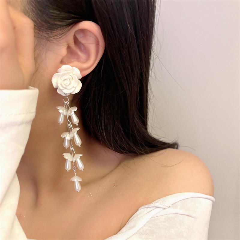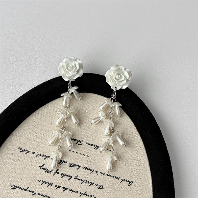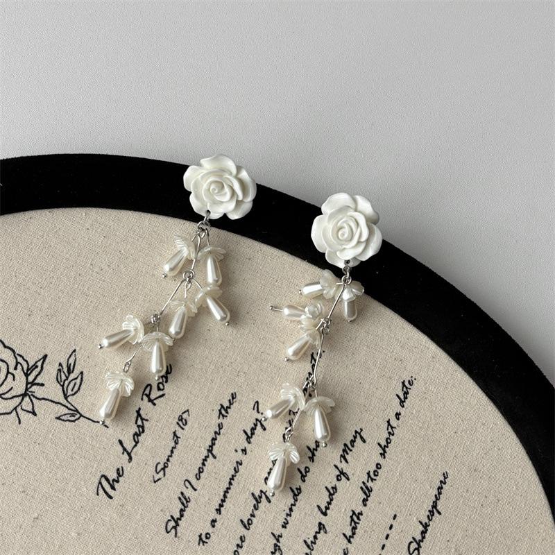 Aretes de Borla de Perla Rosa Blanca Francesa para Mujer, Aretes Largos de Estilo Retro, Aretes de Nicho para Mujer