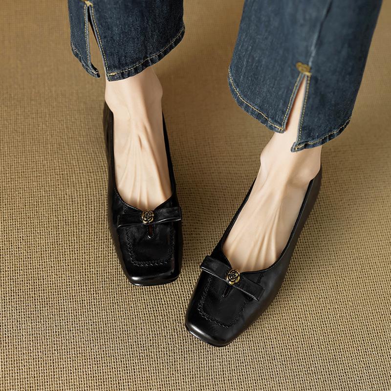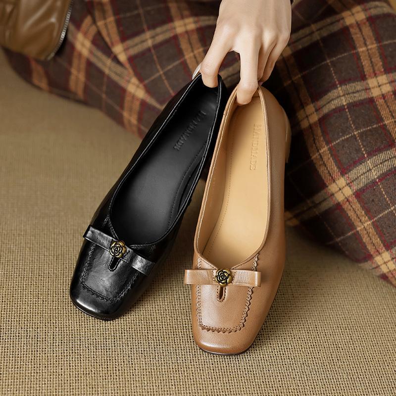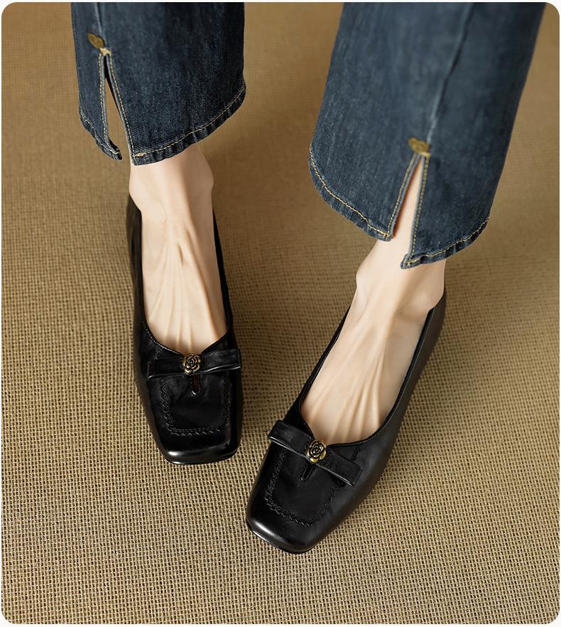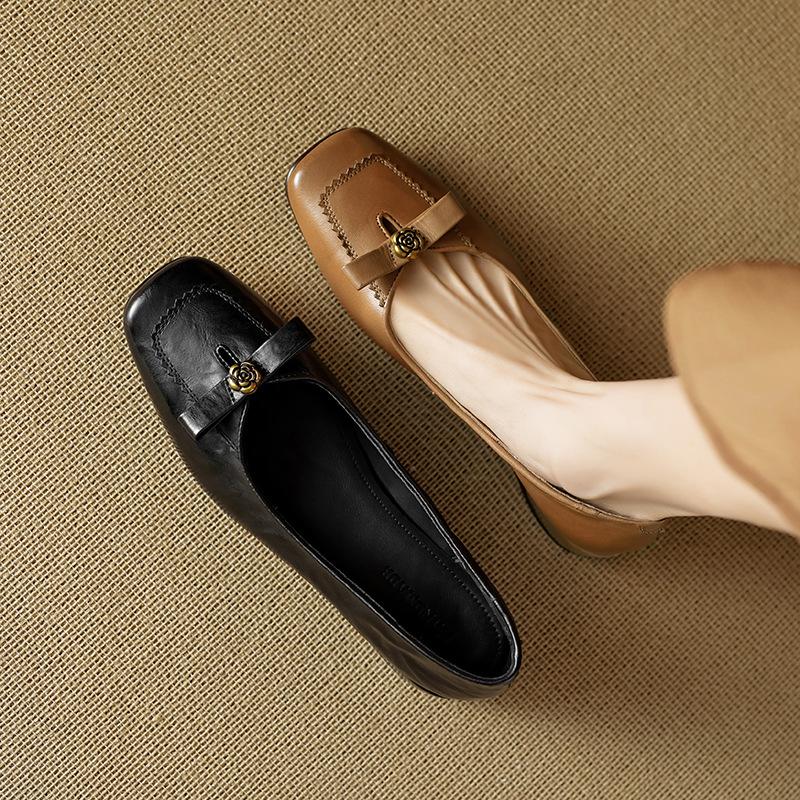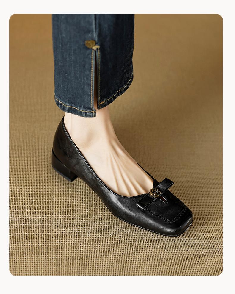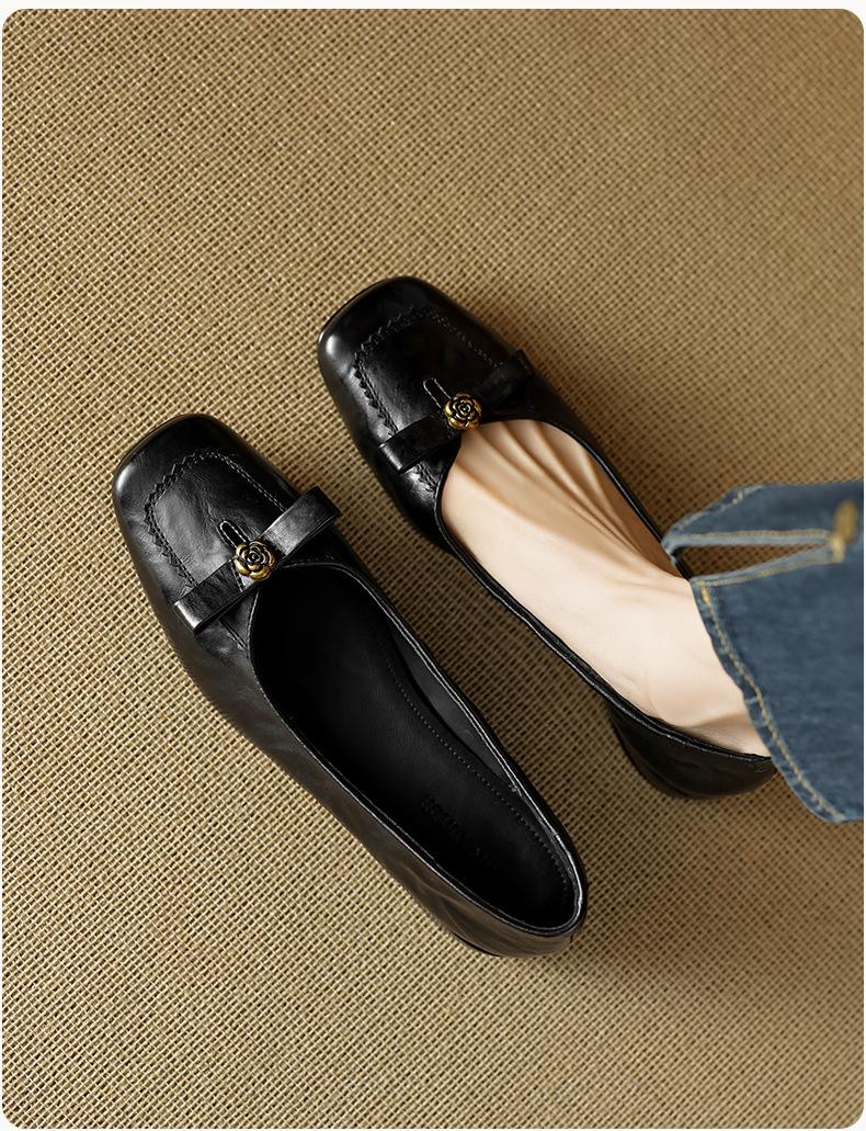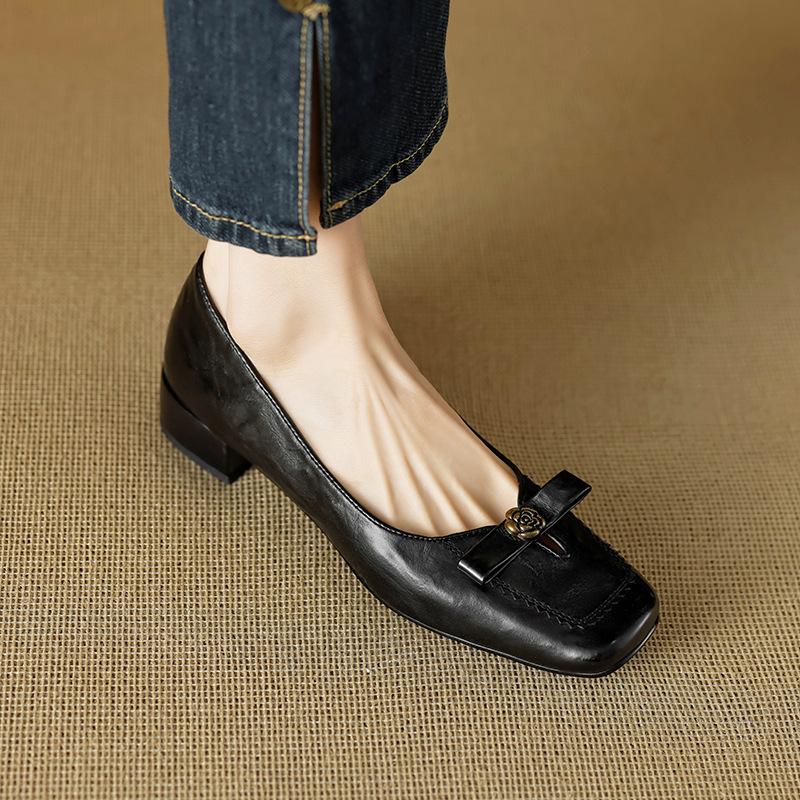 Tacón Grueso de 3cm Estilo Pequeño Fragante Flats de Boca Baja Ropa de Trabajo Versátil 2025 Otoño Nuevo Estilo Cuero Genuino Lazo Camelia Zapatos de Mujer