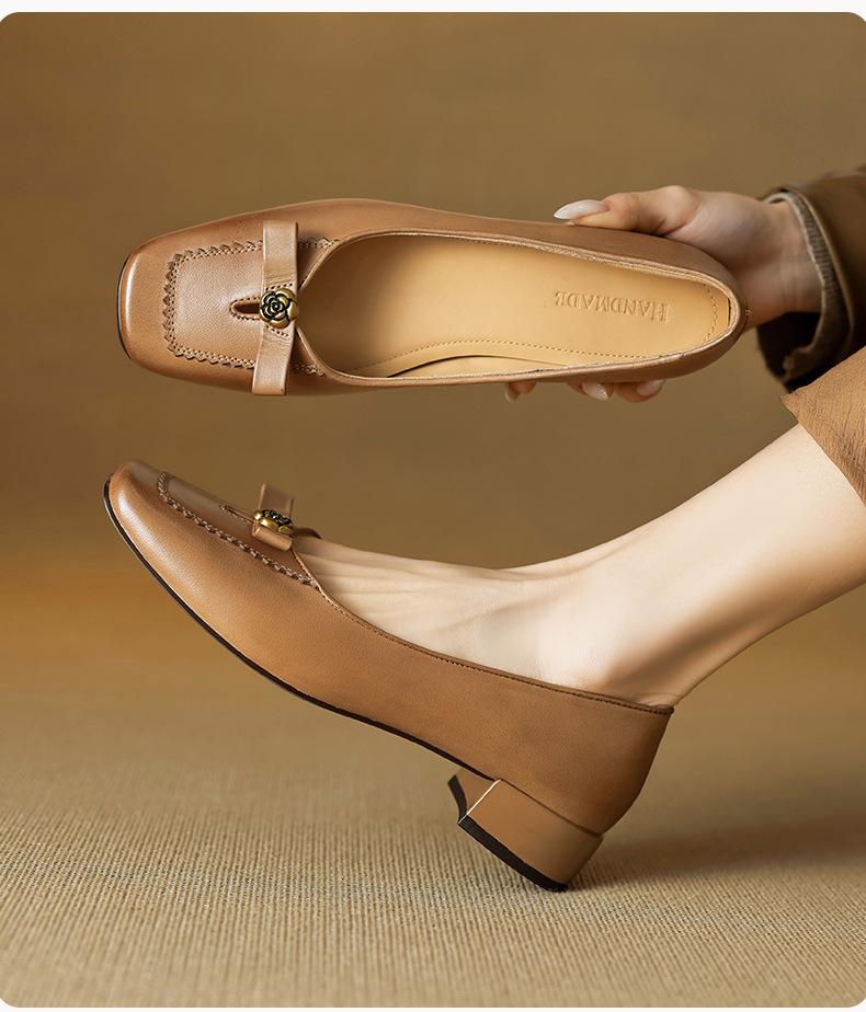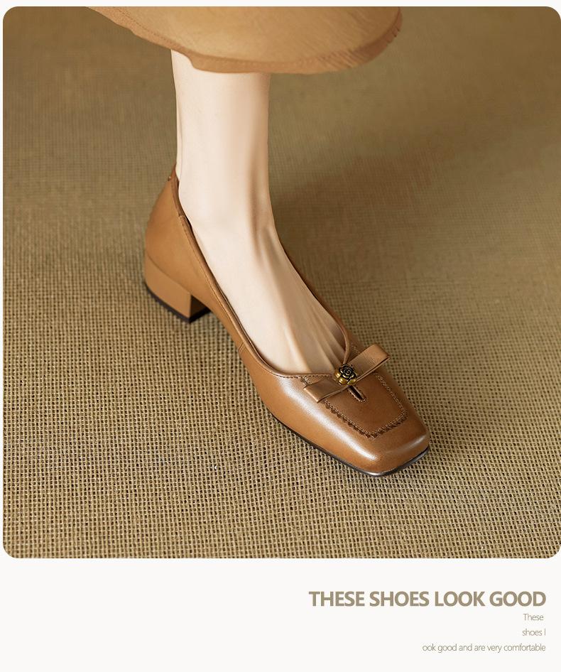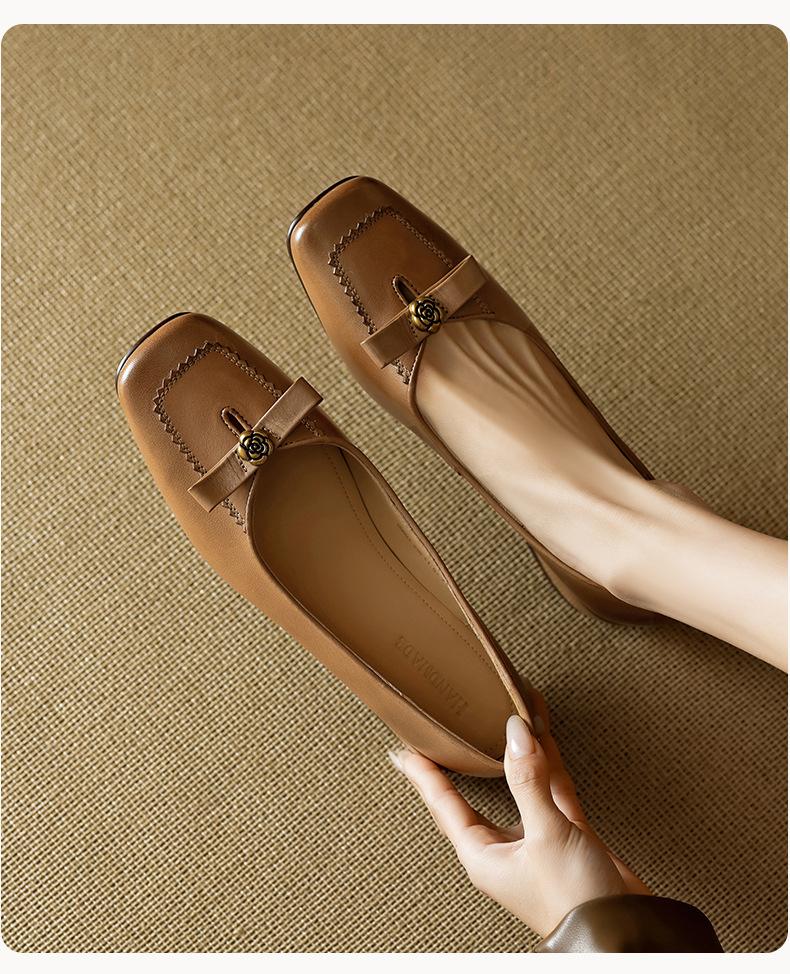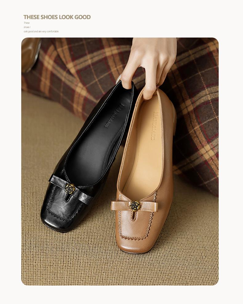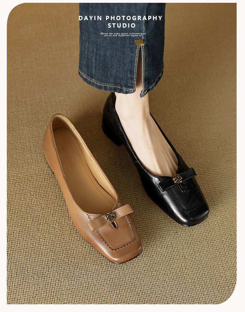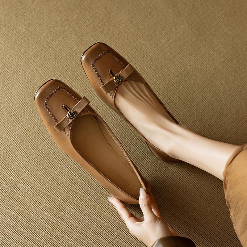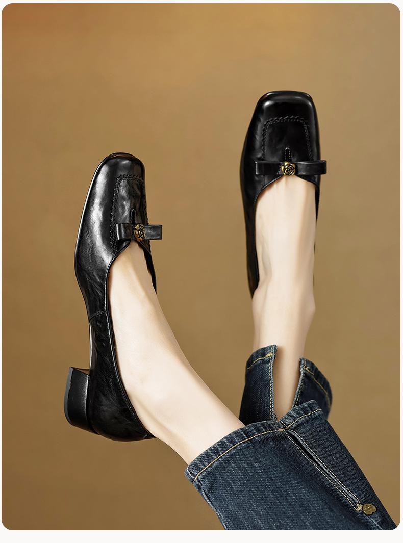 Tacón Grueso de 3cm Estilo Pequeño Fragante Flats de Boca Baja Ropa de Trabajo Versátil 2025 Otoño Nuevo Estilo Cuero Genuino Lazo Camelia Zapatos de Mujer